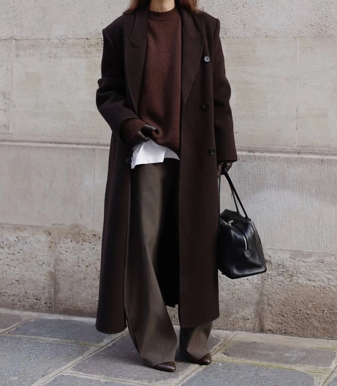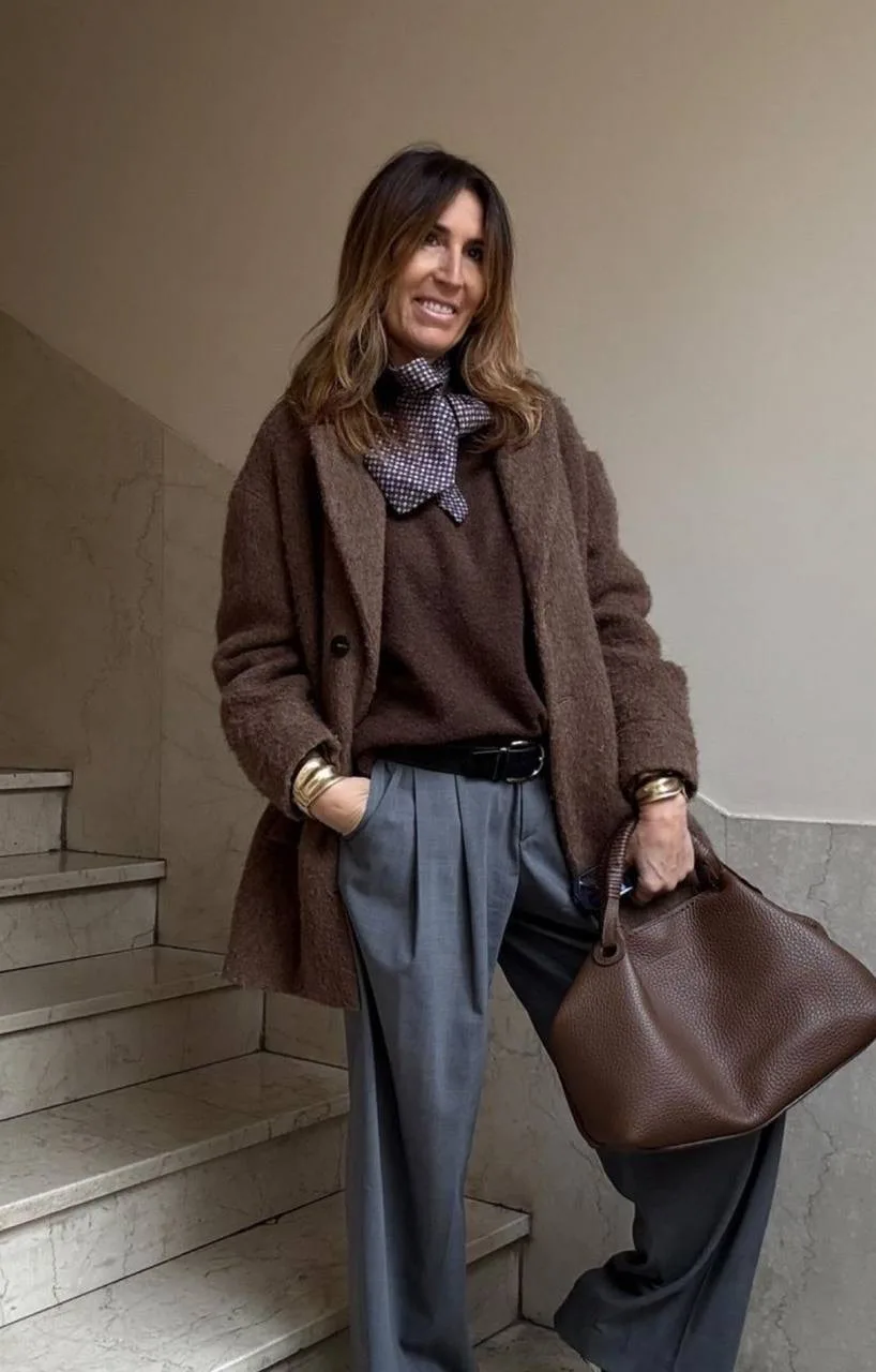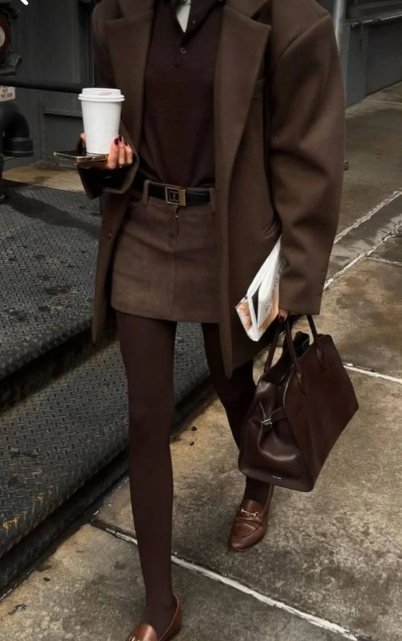А горький шоколад — это отличный выбор для создания выразительного акцента. Сумки, обувь или даже пальто в этом цвете добавляют глубины любому наряду.