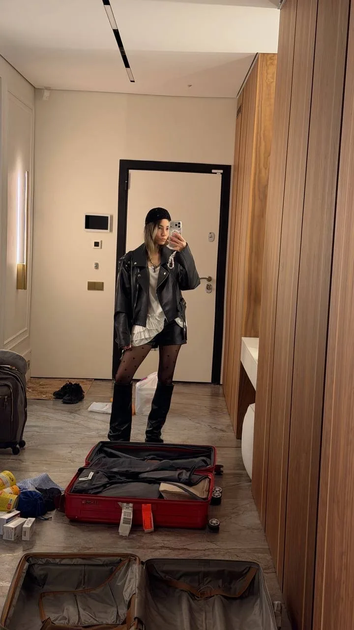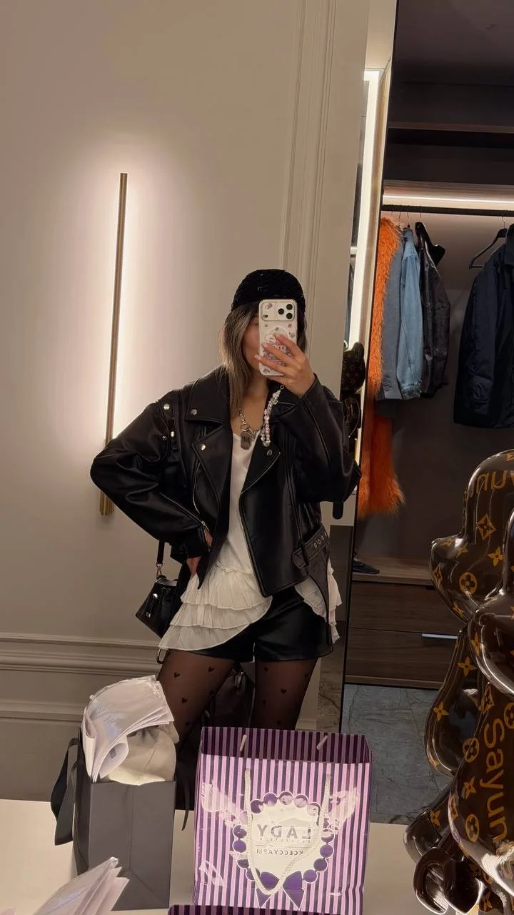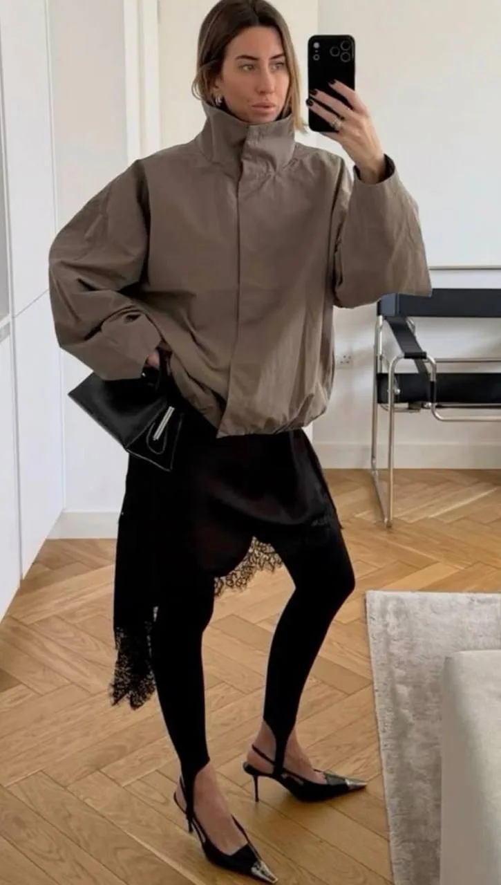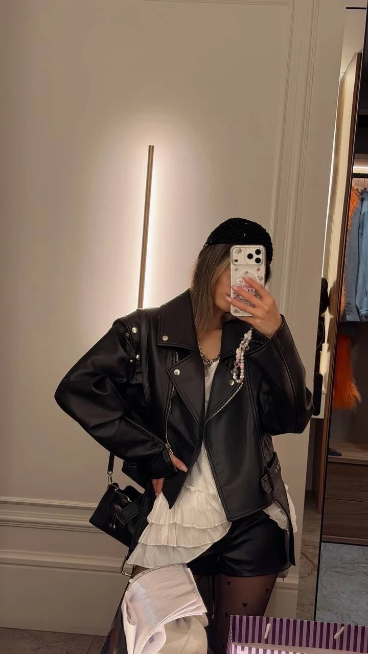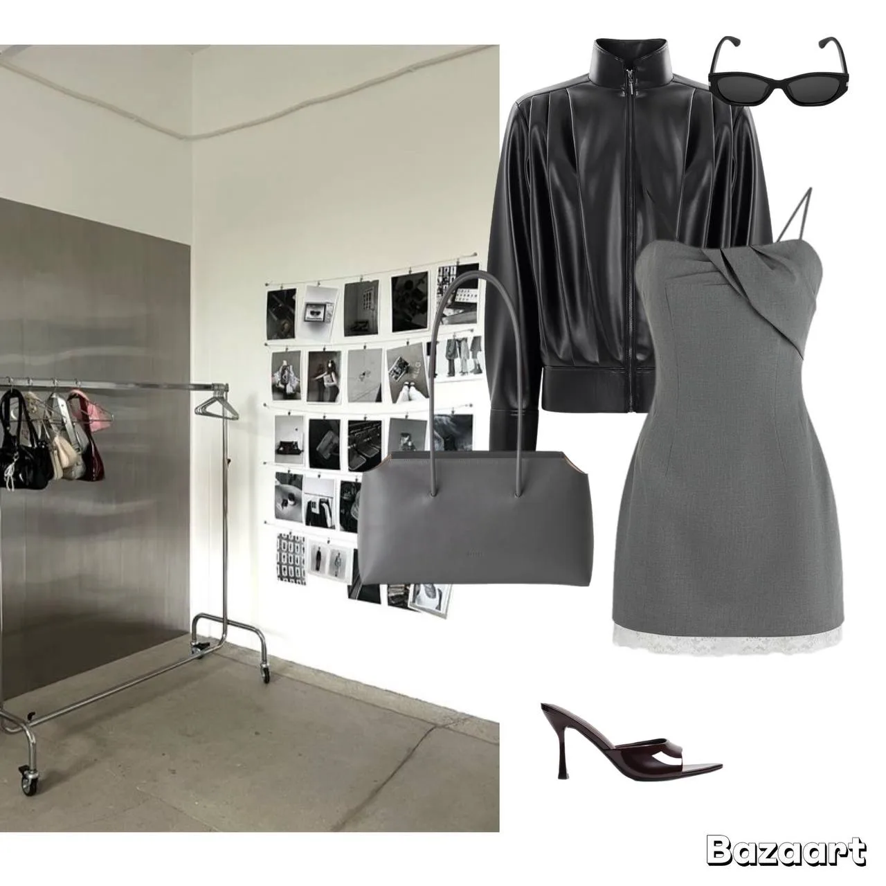 Сегодня захотелось смешать нежность и характер. Выбрала серое мини с кружевом — оно выглядит очень уютно, но в сочетании с черной кожей сразу появляется тот самый драйв.