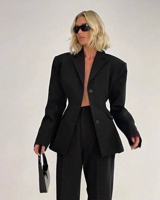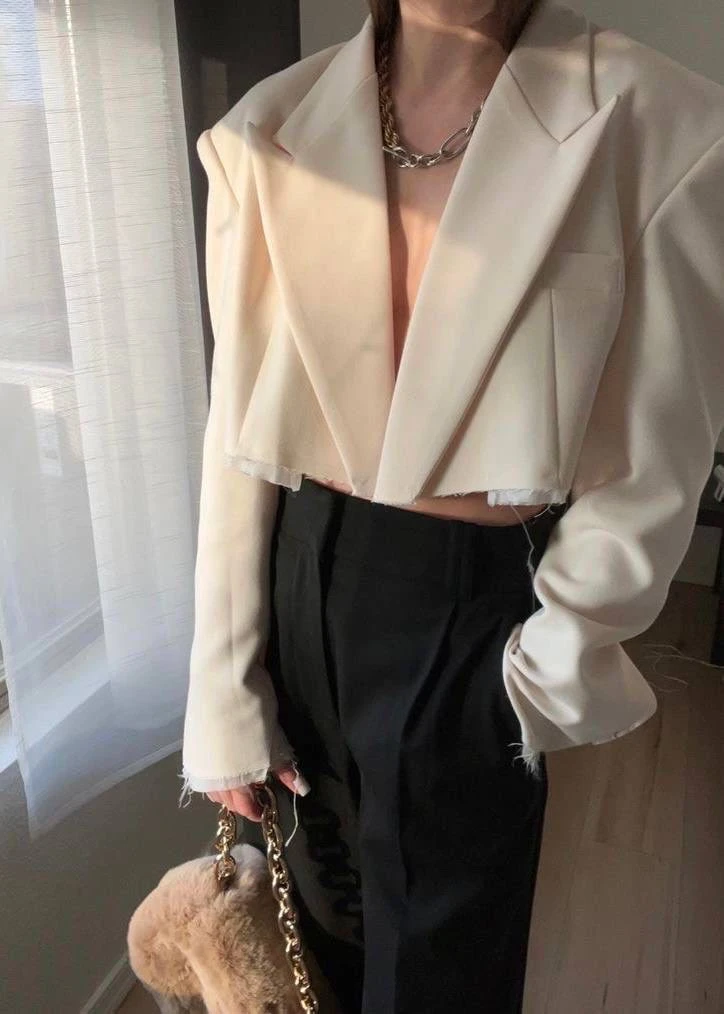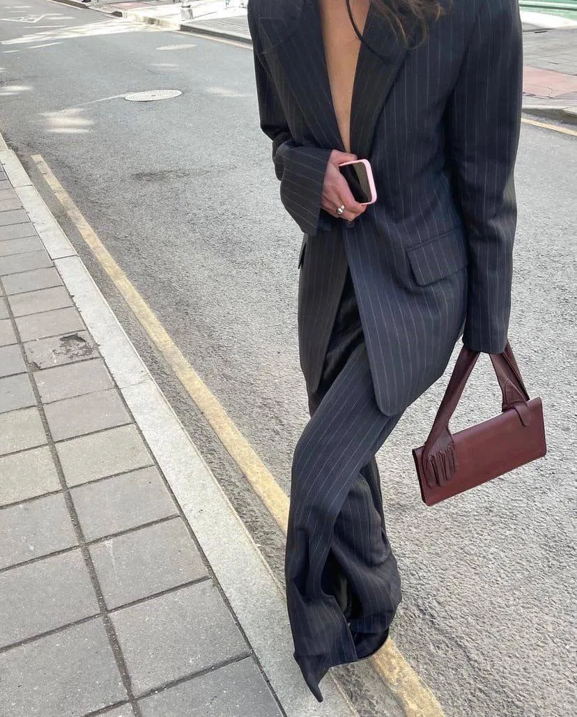 Благодаря маскулинному силуэту жакета, образ точно не будет выглядеть вульгарно! Но если вы все же стесняетесь слегка оголиться, то под жакет можно надеть лиф под цвет костюма👌🏻