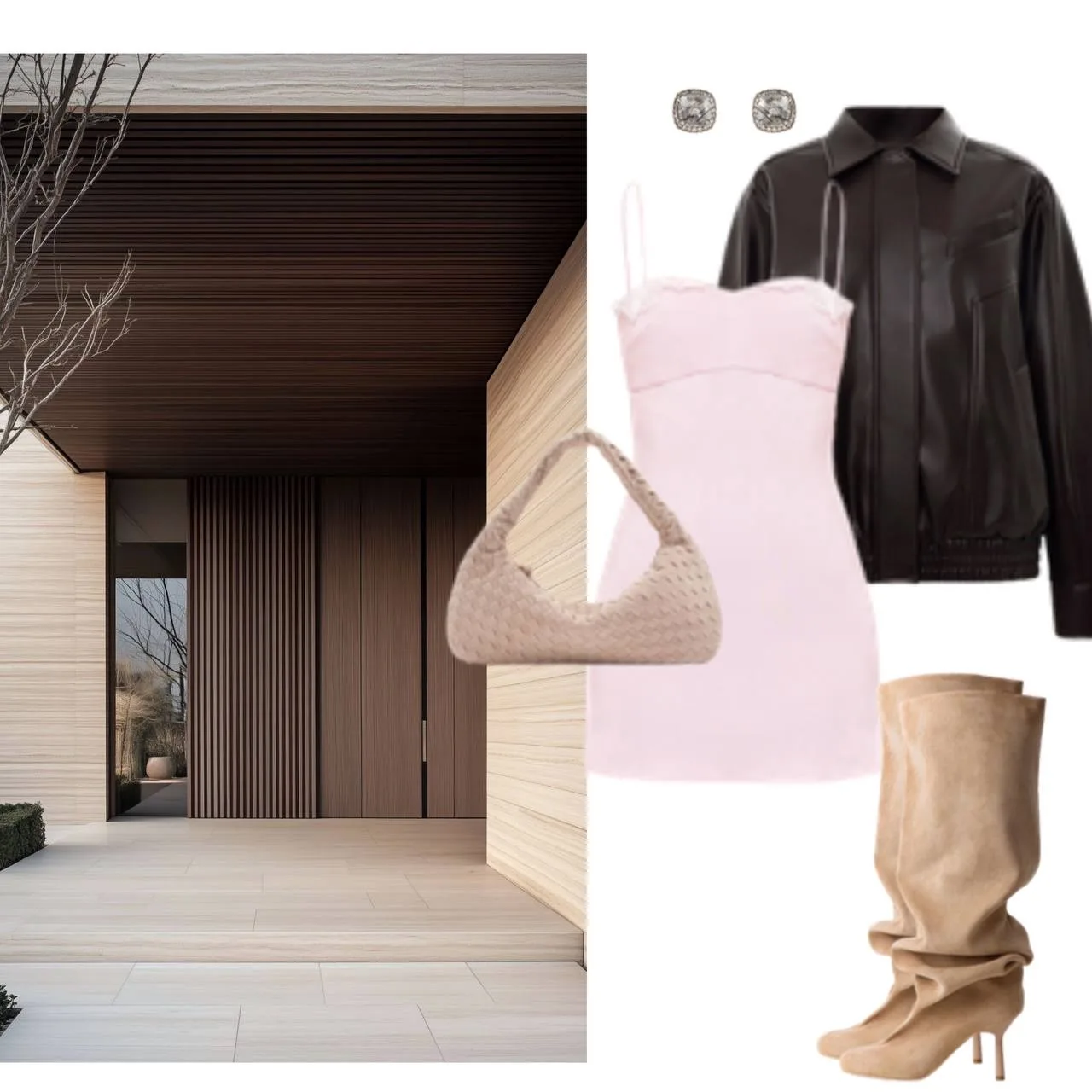 Розовое мини-платье, которое в сочетании с кожаной курткой (можно взять на два размера больше для эффекта оверсайз) создает интересную динамику. Сапоги с широким голенищем дополняют образ, добавляя стильности и уверенности, при этом избегая тех границ пошлости, которые многих останавливают.