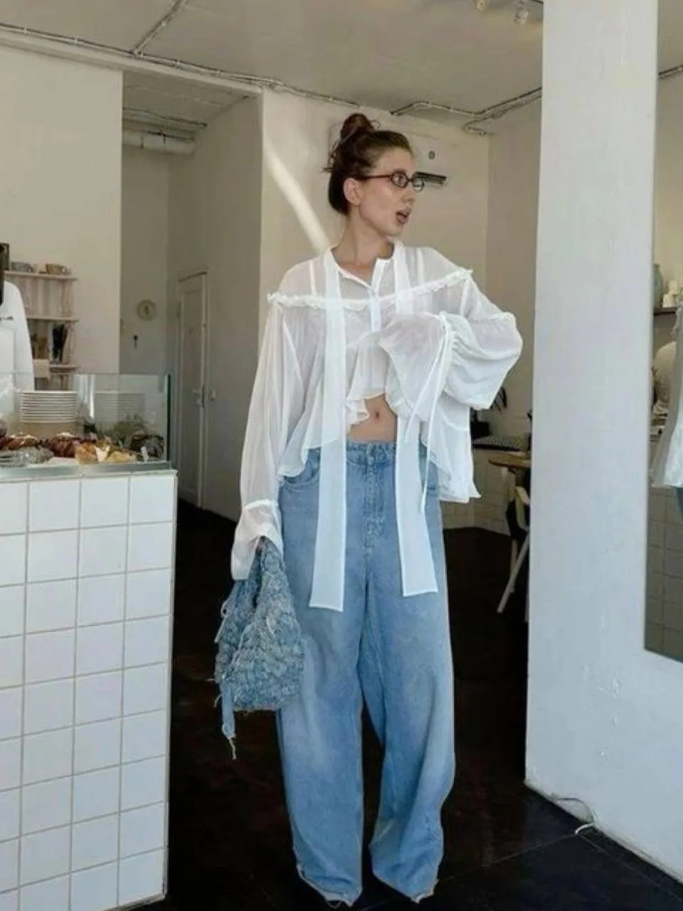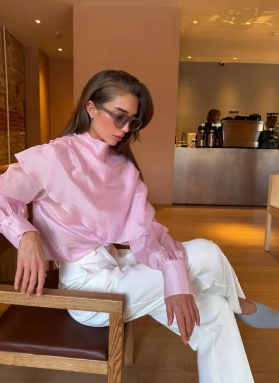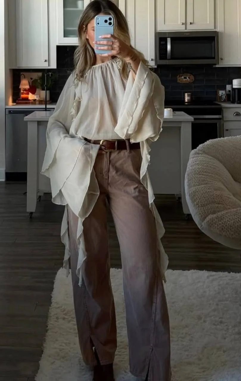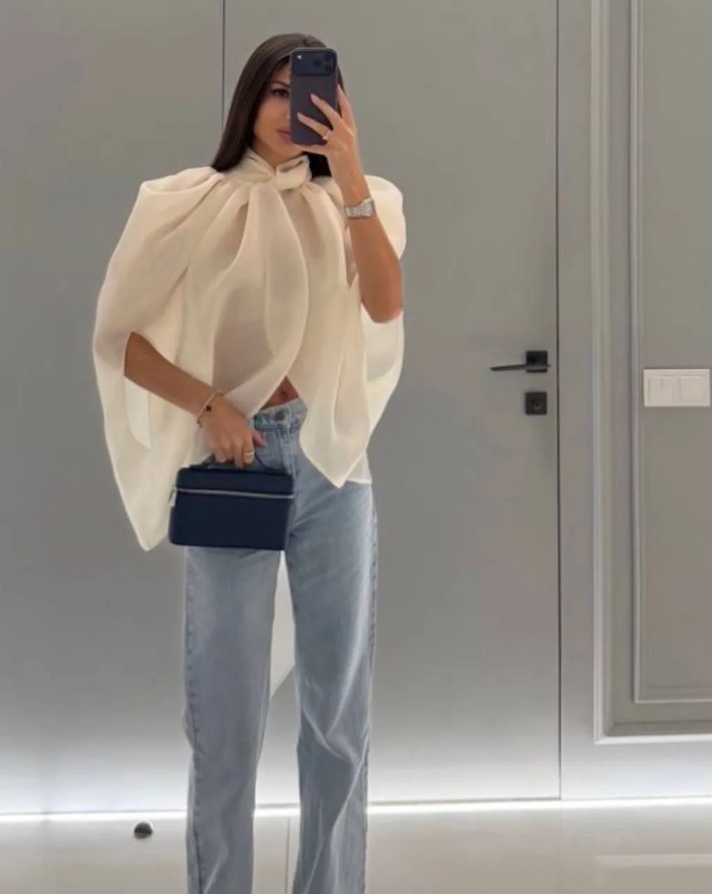 Блузка в стиле современной принцессы — это элемент, который превращает обычный день в особенный. Я обожаю, когда блузка становится центром образа. Это может быть мягкий шелк, который струится, или невесомое кружево с ноткой загадочности. Особенный шарм придают детали: пышные рукава, создающие величественный силуэт, или высокий воротник с изящным бантом, который выглядит как королевский акцент.
