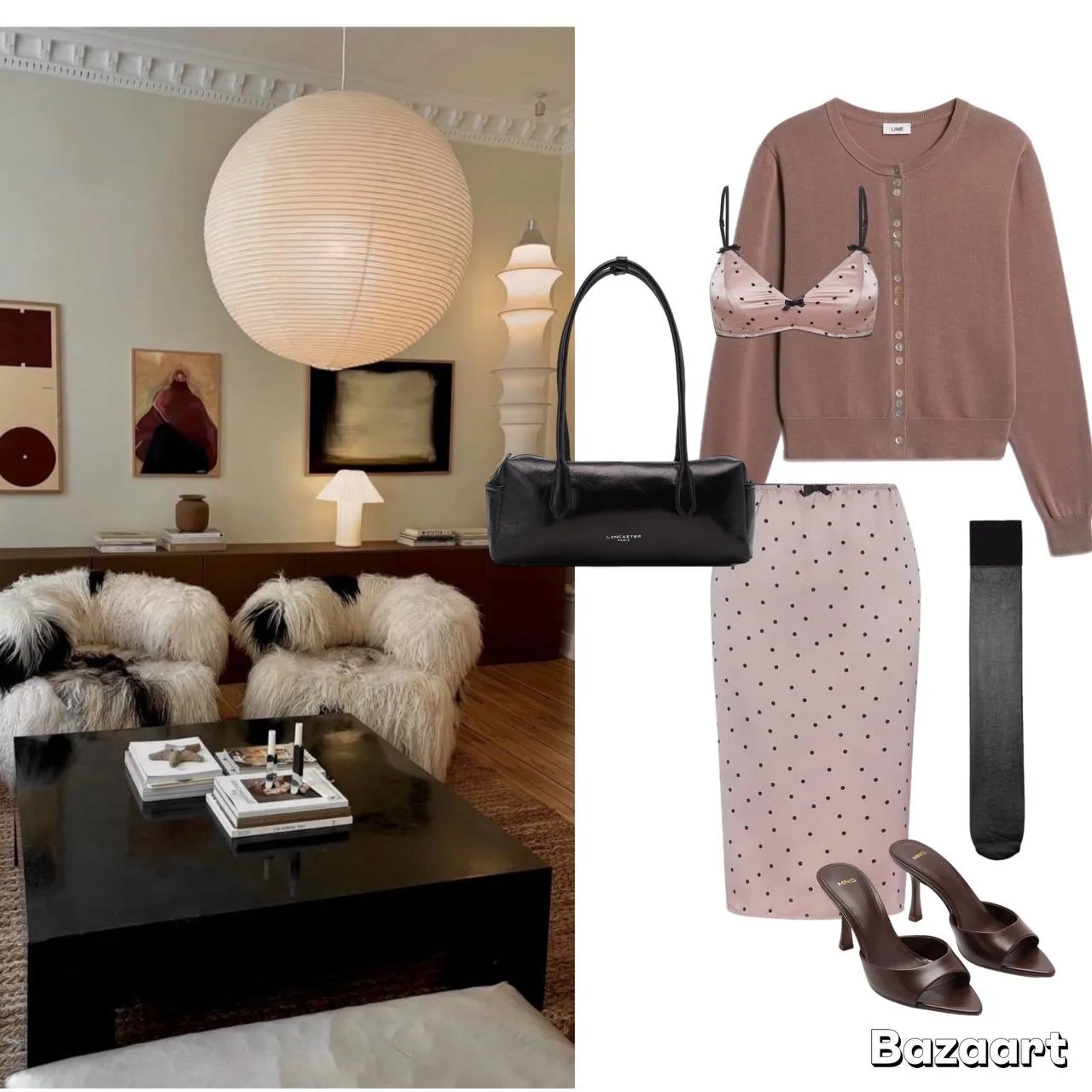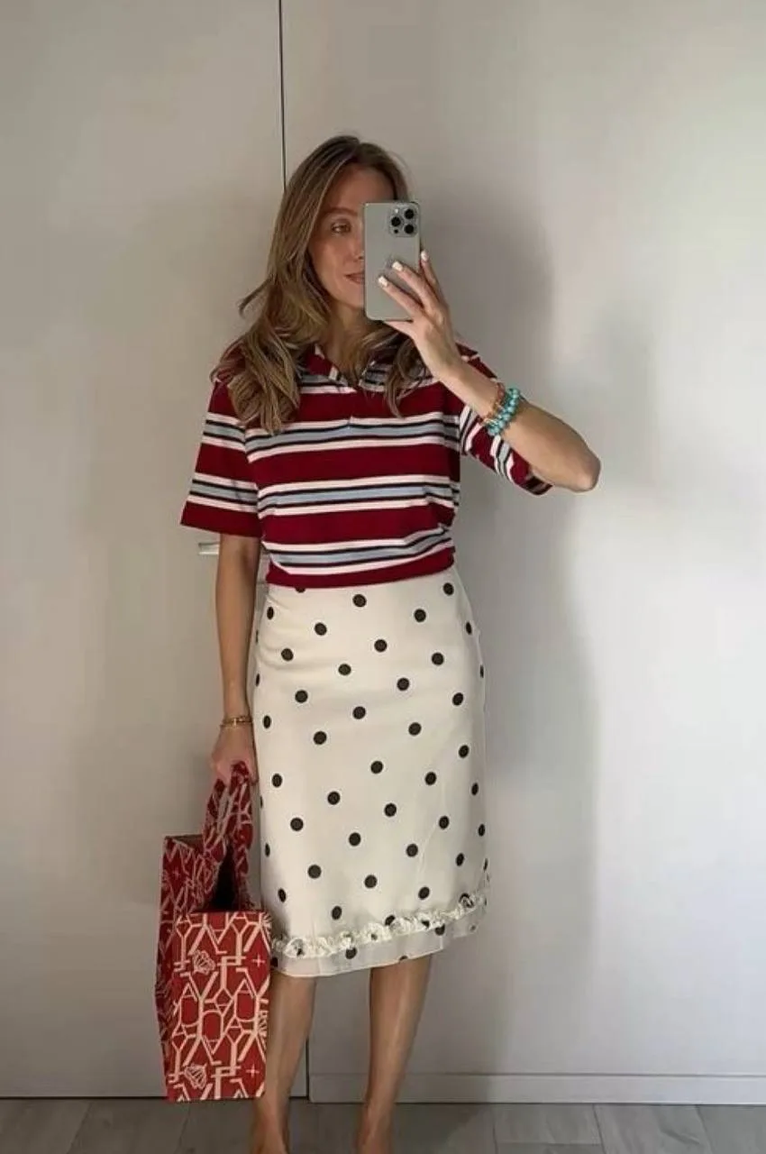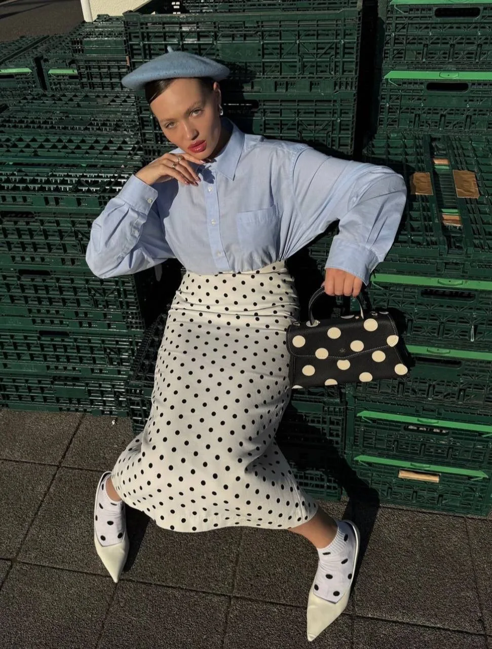 Я решила, что горох — это не обязательно про строгую классику, это может быть очень уютно и даже чуточку дерзко. Мой выбор пал на комплект из юбки и лифа в этот принт — выглядит эффектно и свежо.