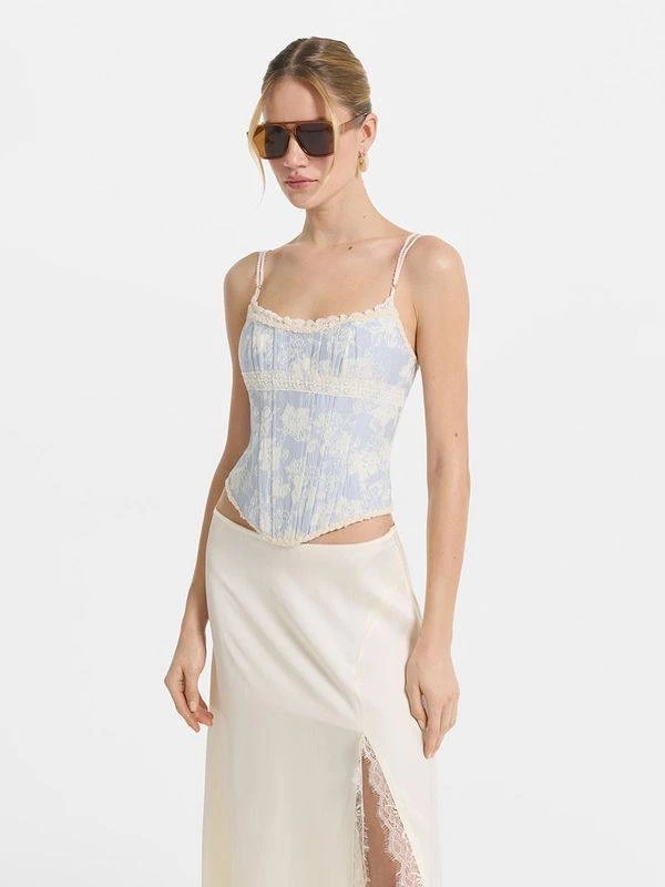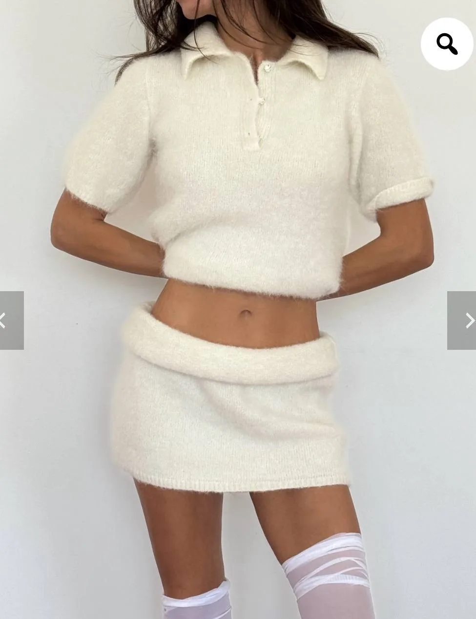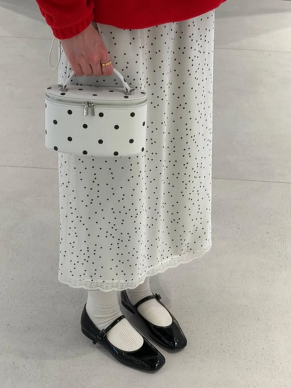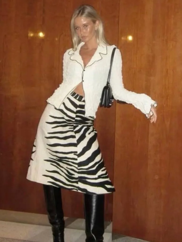 Я решила, что горох — это не обязательно про строгую классику, это может быть очень уютно и даже чуточку дерзко. Мой выбор пал на комплект из юбки и лифа в этот принт — выглядит эффектно и свежо.