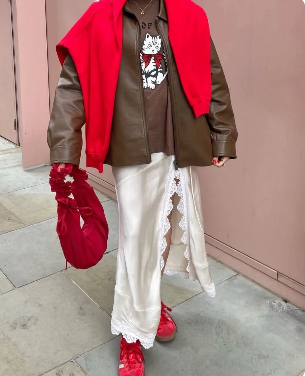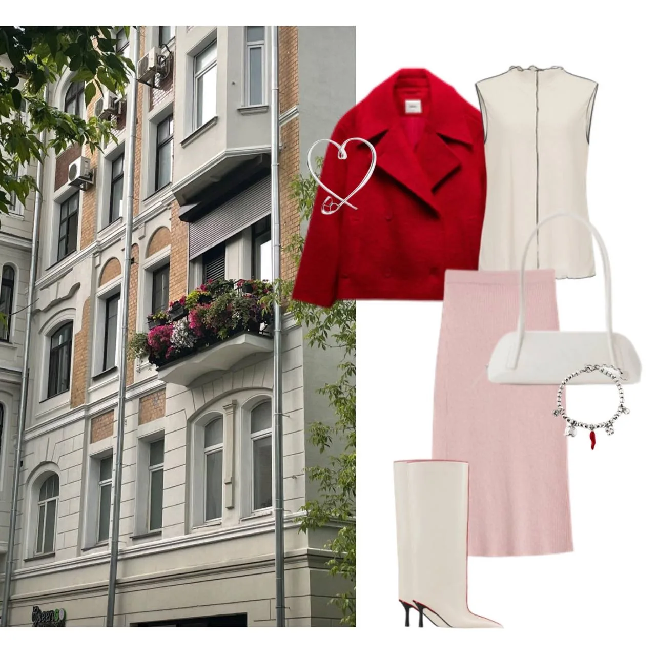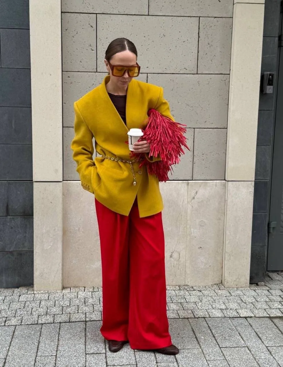 Топ с вертикальной полоской отражает динамику и одновременно добавляет нотку утонченности, а обувь в той же гамме делает наряд завершенным. Я решила дополнить лук ярким красным полупальто — его насыщенный цвет придаёт всему образу яркость и тепло.