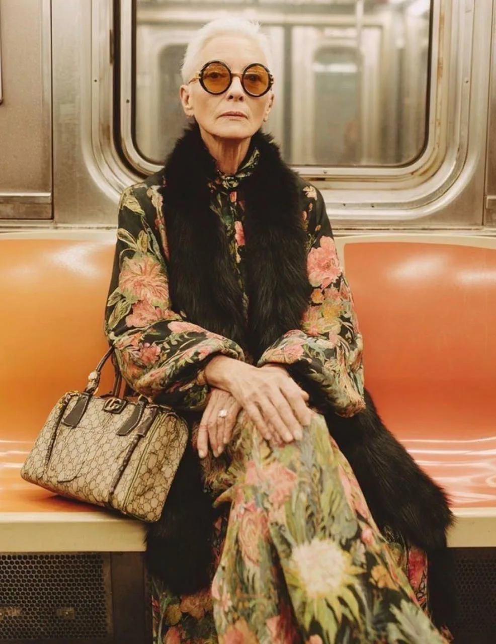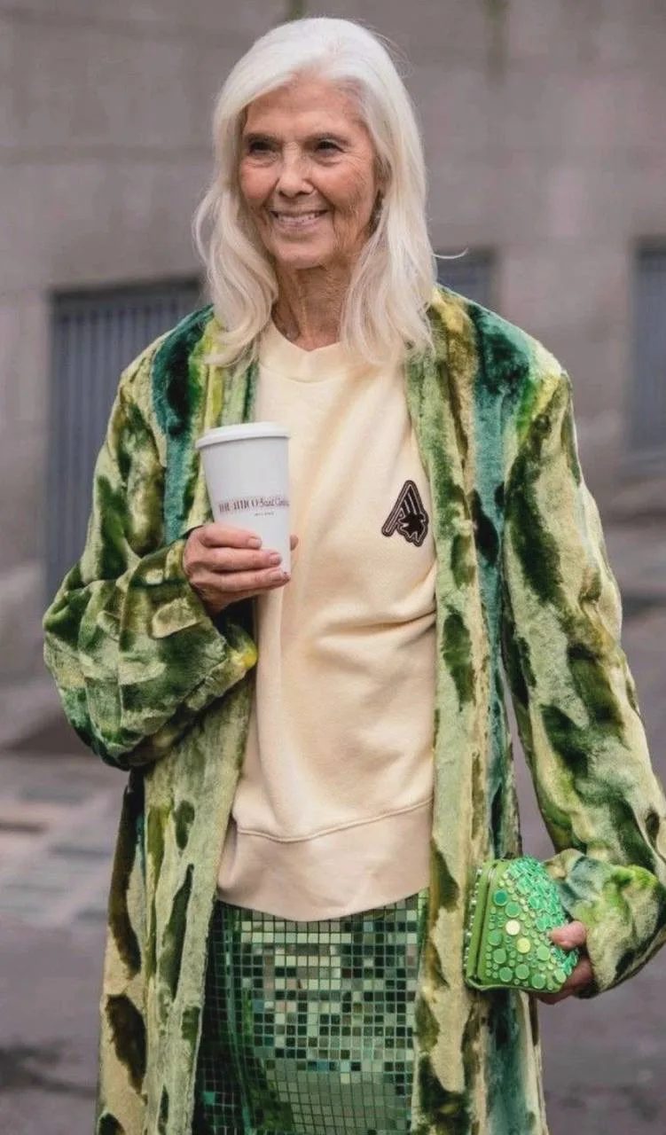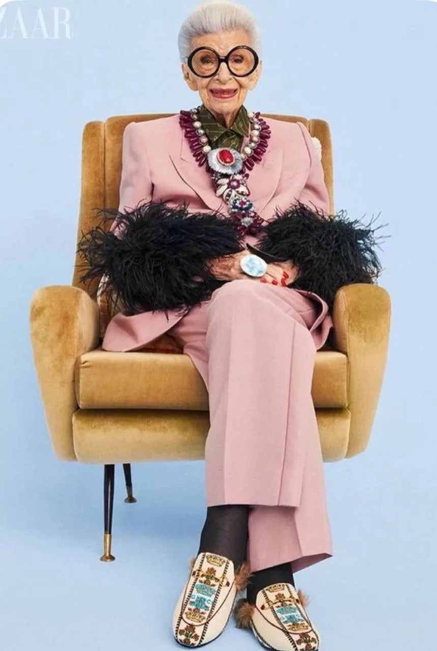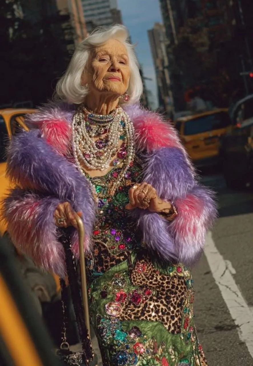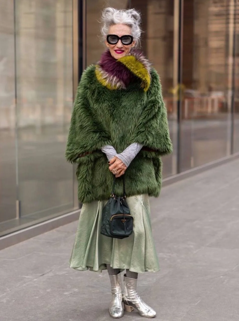 Такой стиль часто называют «Advanced Style». Главный пример — легендарная Айрис Апфель, которая до последних дней носила яркий мех и огромные круглые очки.
