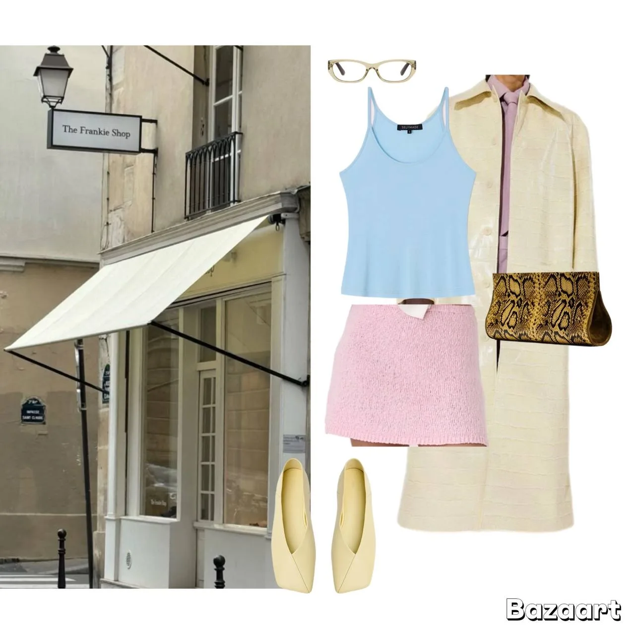 Главный акцент — желтый кожаный тренч. К нему в пару полетели солнечные балетки (да, обувь в тон верхней одежде снова в деле!). Чтобы не превратиться в лимон, добавила голубой топ — это классическое контрастное сочетание всегда выглядит дорого. Низ — розовая короткая юбка. А чтобы «приземлить» всё это буйство цвета и добавить фактурности, взяла клатч со змеиным принтом.