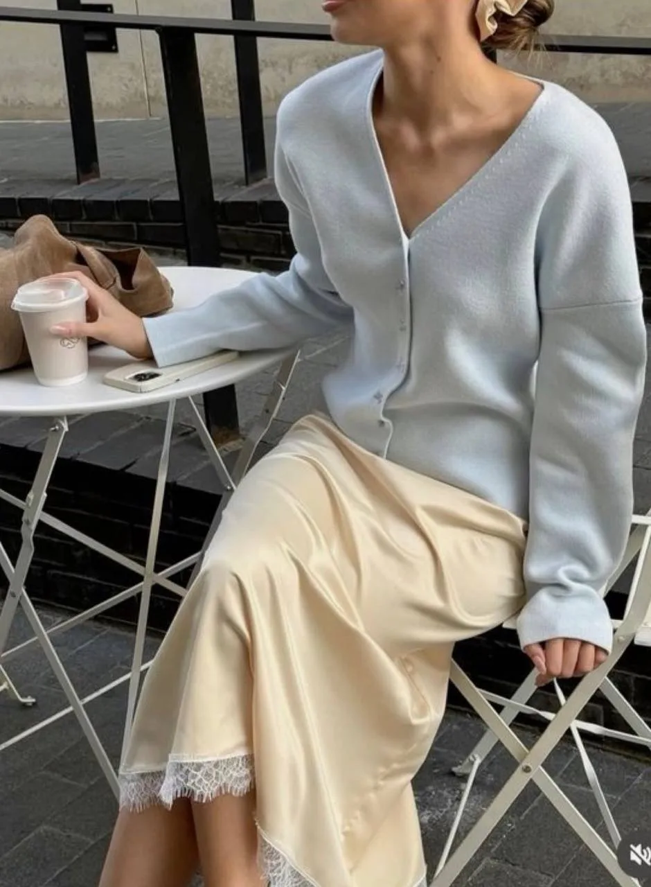 ▪️Слои и фактуры: пока весенний воздух еще прохладный, я накидываю поверх топа в бельевом стиле объемный трикотажный кардиган. Смешение тонкого кружева и грубой вязки выглядит очень уютно и стильно.