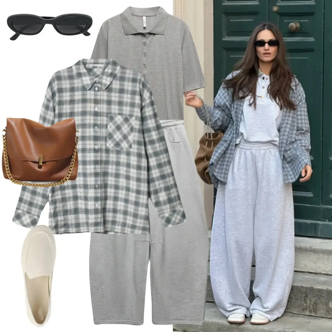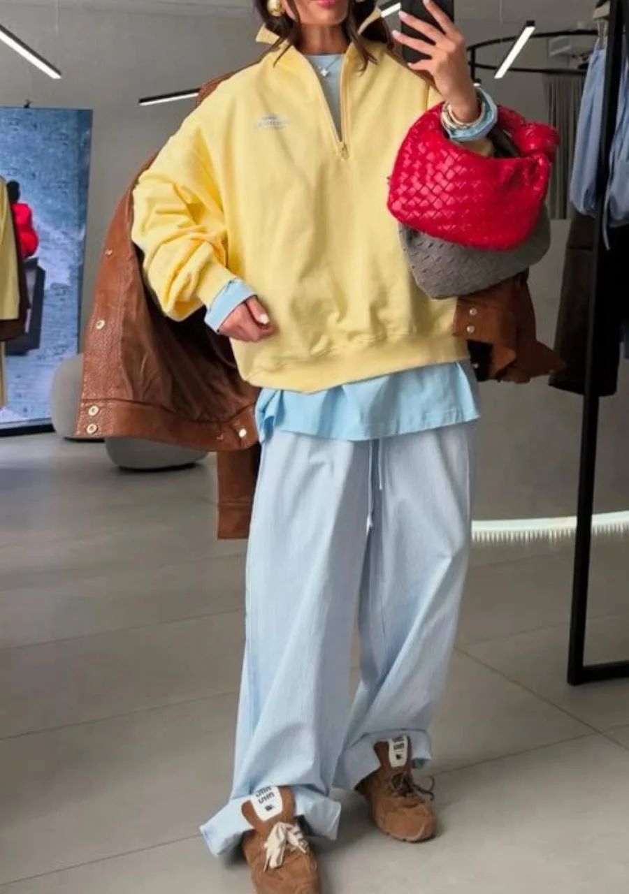 Сегодня мой выбор — идеальный баланс расслабленности и стиля. Широкие брюки в пол и уютная зипка задают правильный объем, а базовая футболка добавляет образу чистоты. Но главный секрет этого аутфита — в деталях.
