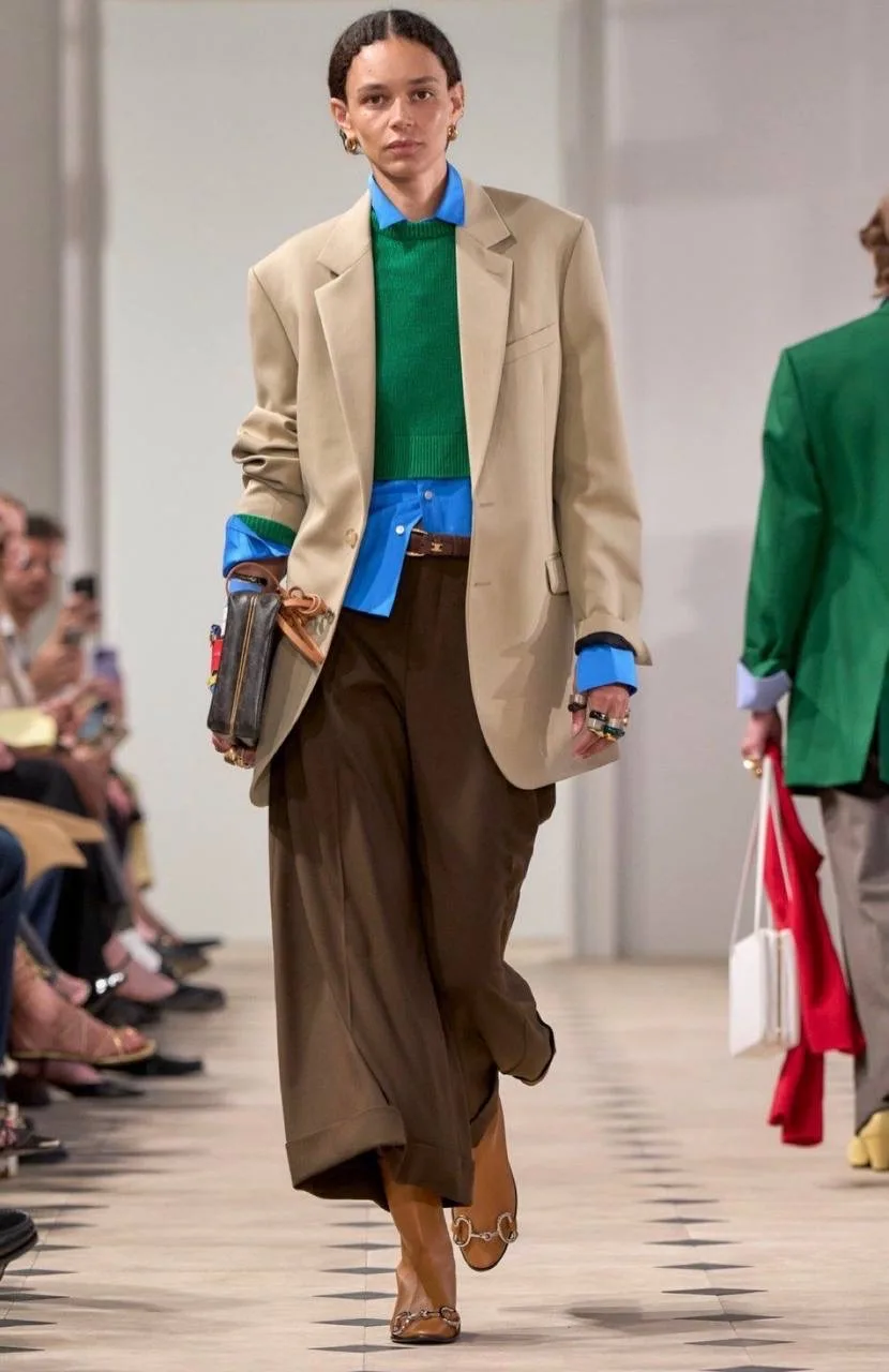 Если облачиться в яркое с ног до головы страшно, используйте нейтральную базу как холст. Серое пальто, бежевый трикотаж или графитовый костюм — это идеальный фон. А дальше добавляем «витамин»: сочную сумку, ультрамариновые перчатки или туфли в цвете.