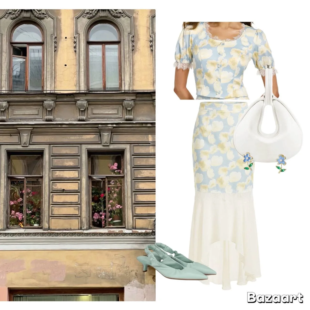 Собрала идеальный образ-предвкушение: нежно-голубой комплект с юбкой в цветочный принт, освежающие мятные туфли и капля чистого белого в аксессуарах. А эти серьги-цветочки — просто финальный аккорд для полной гармонии.