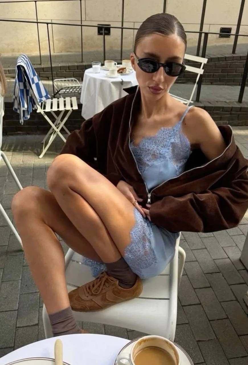 Голубое поло вносит нотку опрятности и свежести, которая круто миксуется с коричневой курткой. Кожа или замша в карамельных оттенках — это база, которая сразу «собирает» аутфит. Короткая юбка добавляет образу игривости, но настоящий характер проявляется в деталях: