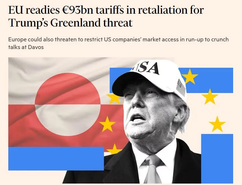 ⚡️ЕС может ввести ответные пошлины против США из-за Гренландии на €93 млрд, — Financial Times со ссылкой на европейских чиновников.
