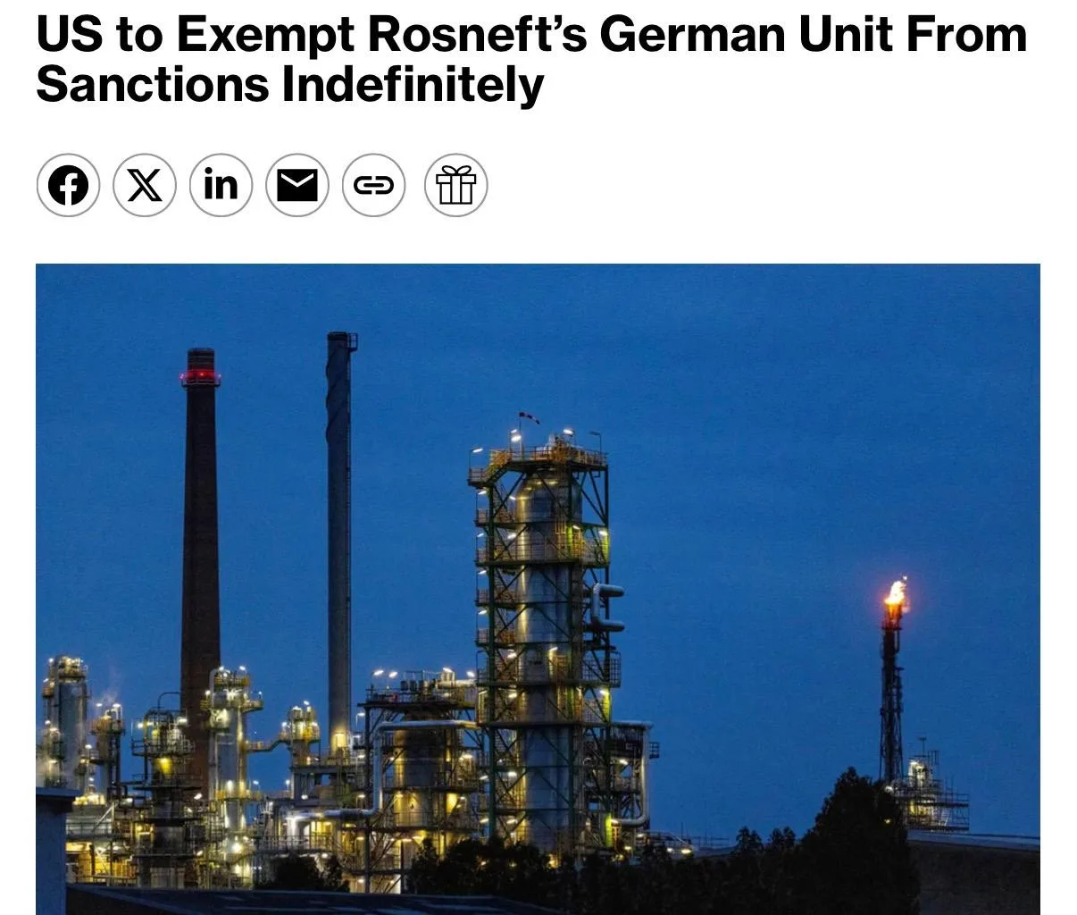 ⚡️США бессрочно снимают санкции с немецкого подразделения «Роснефти», — Bloomberg.