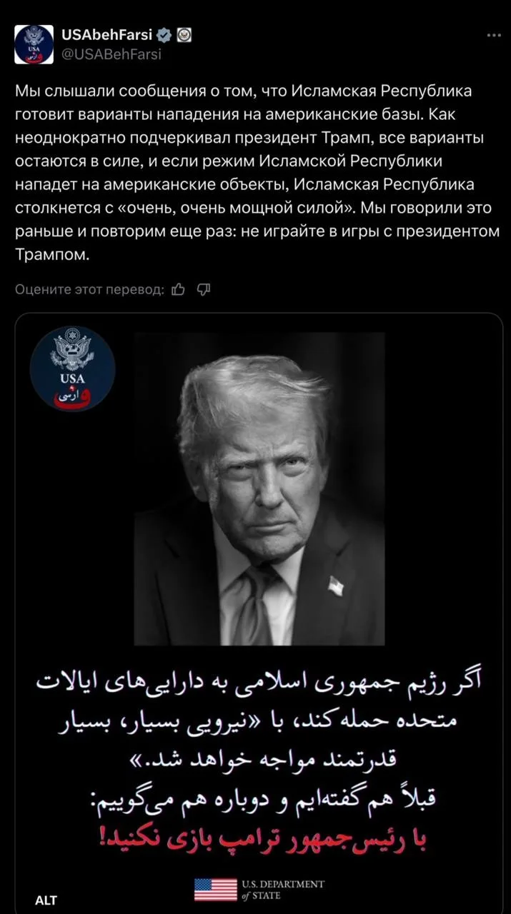 ⚡️Госдеп США пригрозил «очень-очень мощным» ударом по Ирану в случае атаки на американские базы: