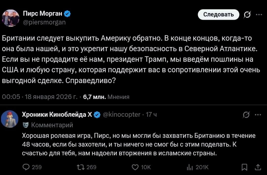 Великобритания должна выкупить Америку обратно. В конце концов, она когда-то была нашей, и это укрепило бы нашу безопасность в Северной Атлантике. Если вы не продадите её нам, президент Трамп, мы введём пошлины против США и любой страны, которая поддержит ваше сопротивление этой крайне выгодной сделке. Справедливо?