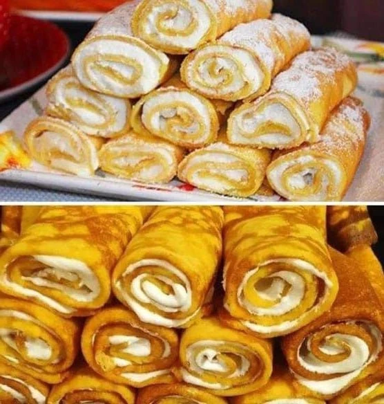 3.Для начинки: творог смешать с сахарной пудрой по вкусу (я добавила 2 ст. ложки с горкой). Готовые блинчики промазать творожной начинкой. Свернуть рулетом, разрезать пополам, выложить в огнеупорную форму, сверху на каждый рулетик положить немного сливочного масла. Выпекать 15 минут при 180 гр. посыпать сахаром
