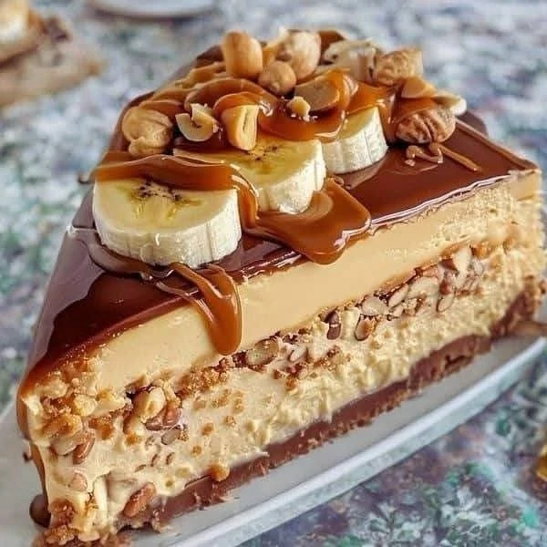 Подавайте чизкейк, украсив его свежими ломтиками банана, мелко нарезанным арахисом и добавив немного карамельного соуса и ли сгущего молока