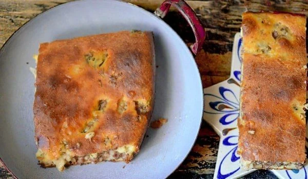 10. Запекайте пирог в духовке при 180-200 градусах до готовности. Время запекания около 40 минут. Всё зависит от высоты теста в форме и самой духовки. Под конец выпекания (за 15 минут) прикройте верх пирога фольгой.