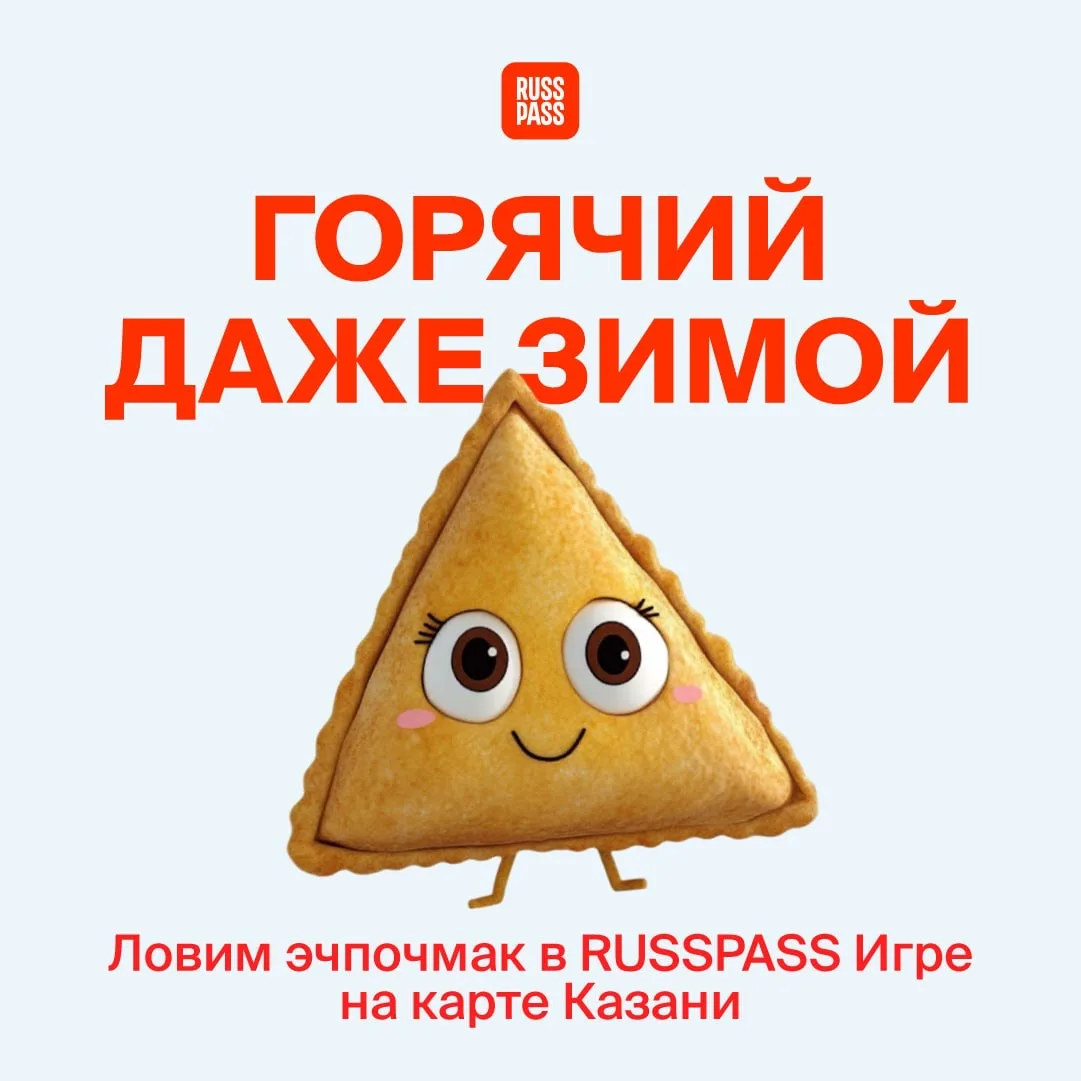 ❤️🔥 В Казани эчпочмаки всегда горячие! Вот и румяный персонаж RUSSPASS Игры не остывает даже зимой. Он прячется по всей столице Татарстана: от парка им. Горького до Национальной библиотеки. За каждую поимку мультяшки камерой смартфона в приложении начислится 90 баллов.