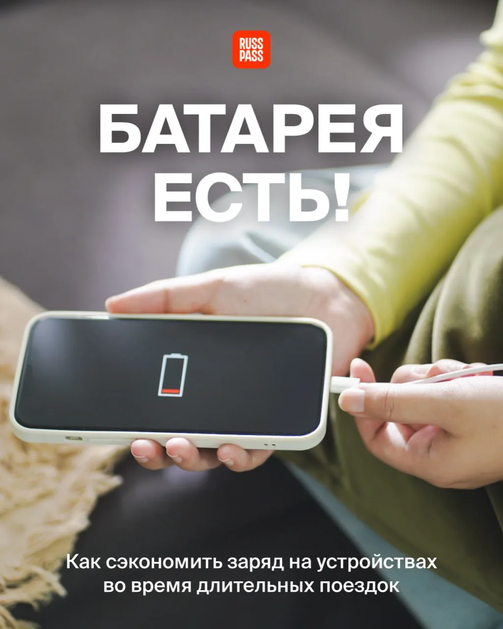 🪫 После двух часов в пути осталось 20% заряда, а впереди еще полдня... Знакомо? Следуйте простым правилам из инструкции RUSSPASS, и ваши устройства продержатся гораздо дольше. От регулировки яркости до хитростей с наушниками — все, что нужно знать, чтобы сэкономить заряд.