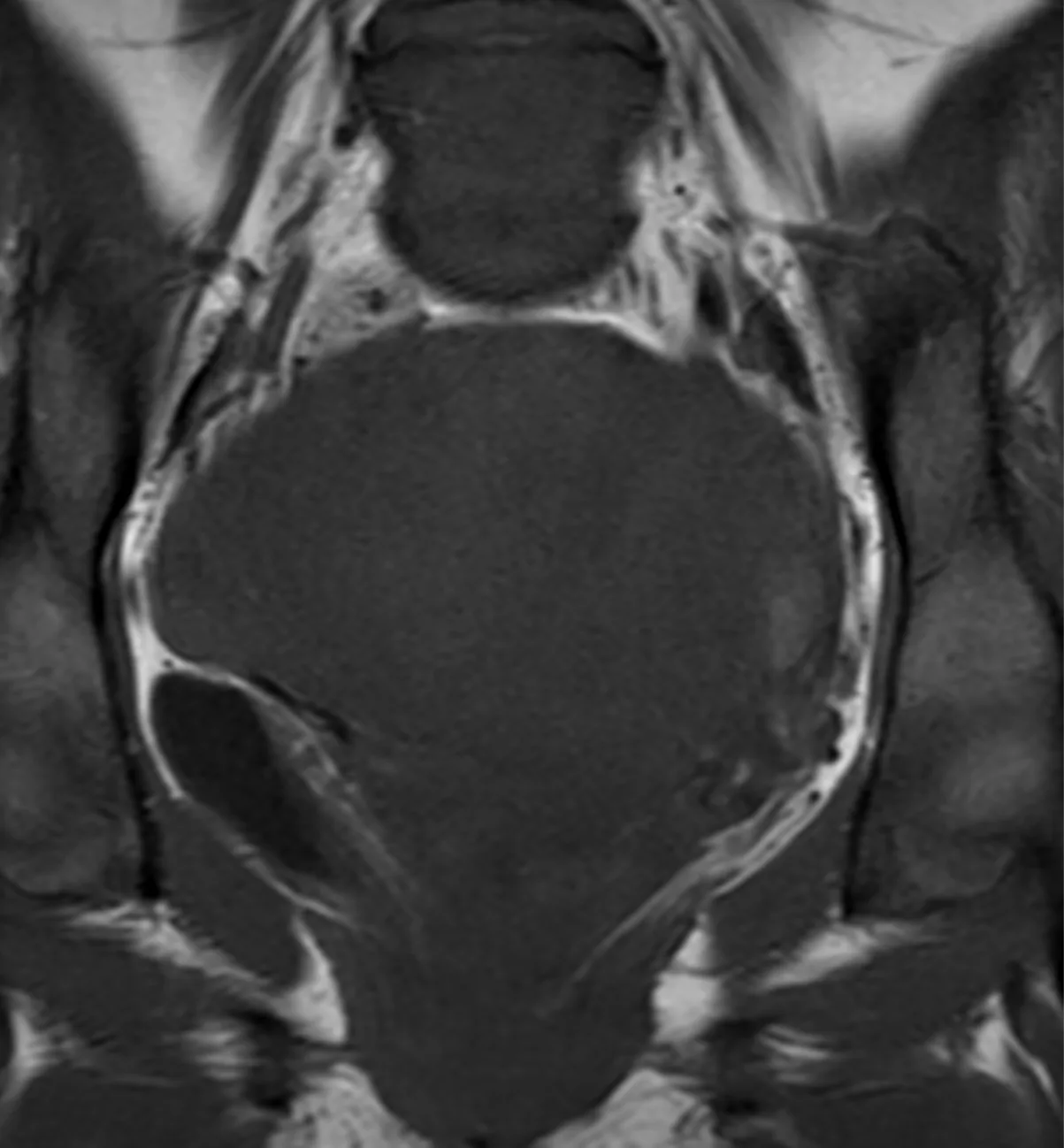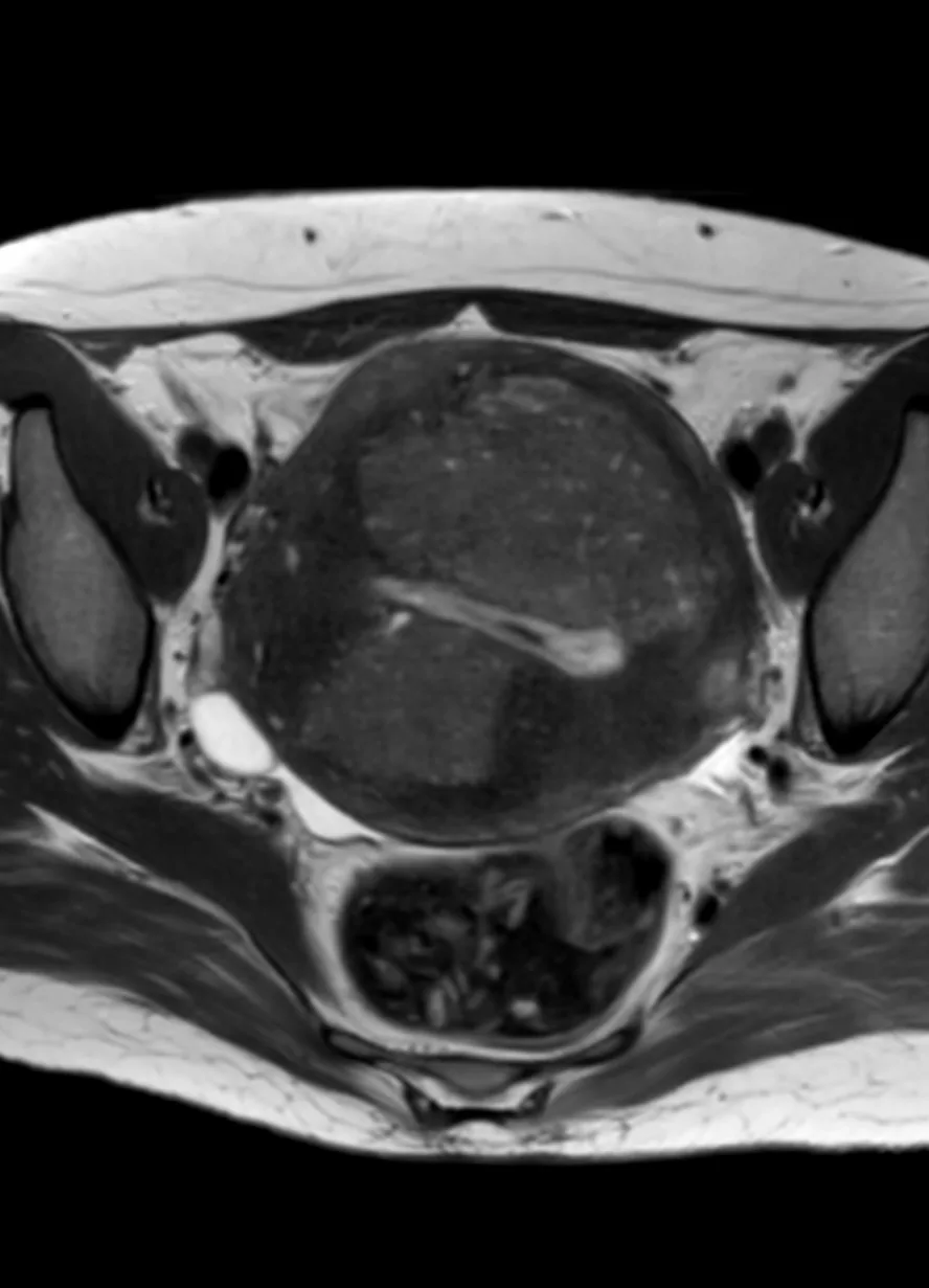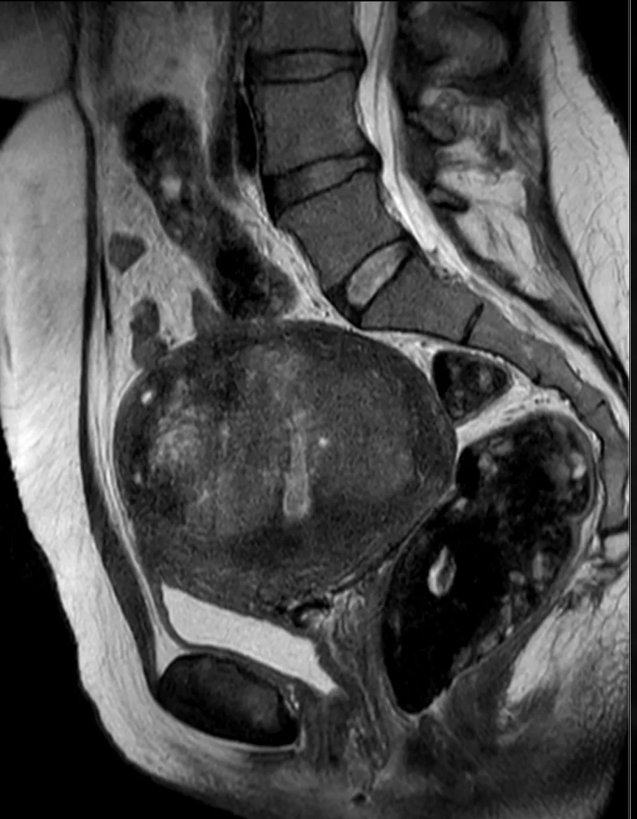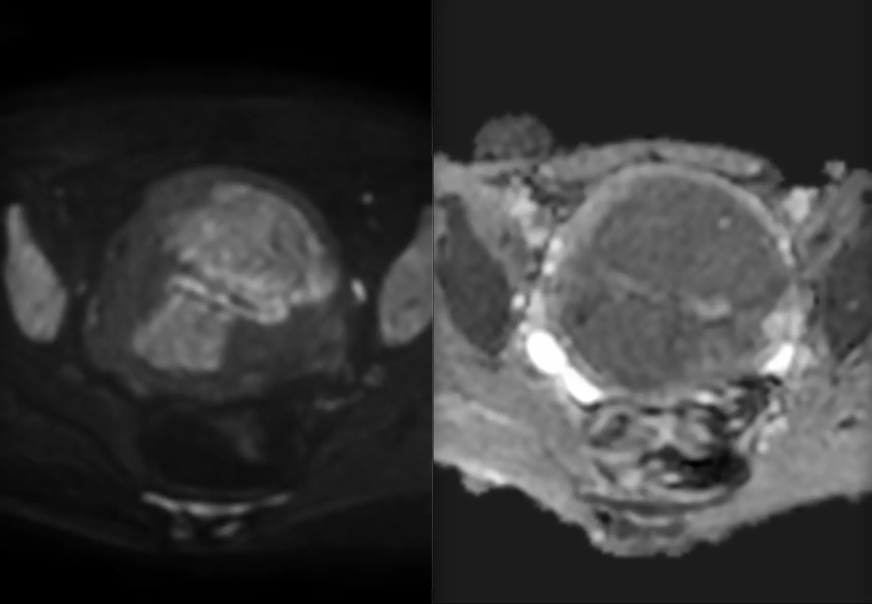 Очень интересные проявления на #МРТ в матке: видно, что имеется выраженный, диффузный #аденомиоз, но какие-то узловые включения, ограничивающие диффузию и практически не накапливающие контраст. Это – результат перкутанной эмболизации, думали, что #миомы матки. Пациентка страдала маточным кровотечением.
