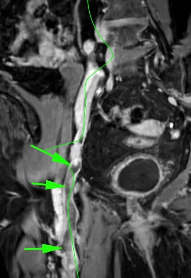 Женщина 87 лет, исследование проводилось по поводу кровянистых выделений из половых путей и наличия крови в моче, помимо недостаточности мышц тазового дна и опущения мочевого пузыря, мочеиспускательного канала, влагалища и прямой кишки было обнаружено светящееся пятно справа походу наружных подвздошных сосудов на диффузии. Так как было проведено ещё дополнительно динамическое исследование с контрастом, было доказано наличие венозного подвздошно-бедренного тромбоза. Кривая время-интенсивность на наружной подвздошной Вене представляет собой прямую (небольшие неровности не в счет, это из-за артефактов). Интересно, что это её никак не беспокоит. Видимо, всё компенсировано, на удивление.