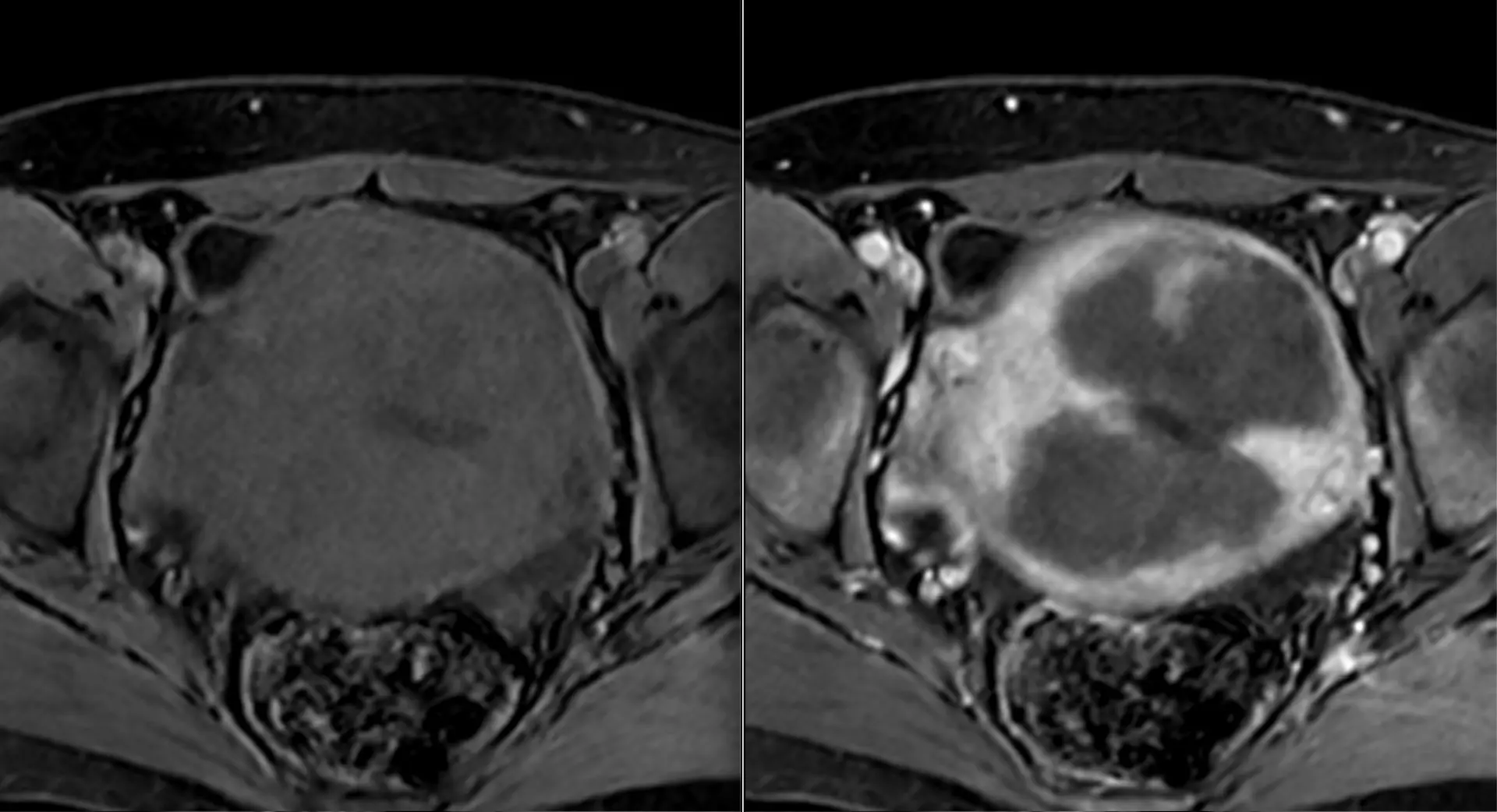 Развившиеся после процедуры участки некроза в стенках матки находятся в состоянии цитотоксического отёка и не накапливают контраст. Без знания анамнеза угадать, что это, практически, невозможно, особенно при отсутствии соответствующего опыта. Снимки и прислали с вопросом: это что такое злое в матке, но не накапливает контраст? Хорошо, что анамнез сообщили.