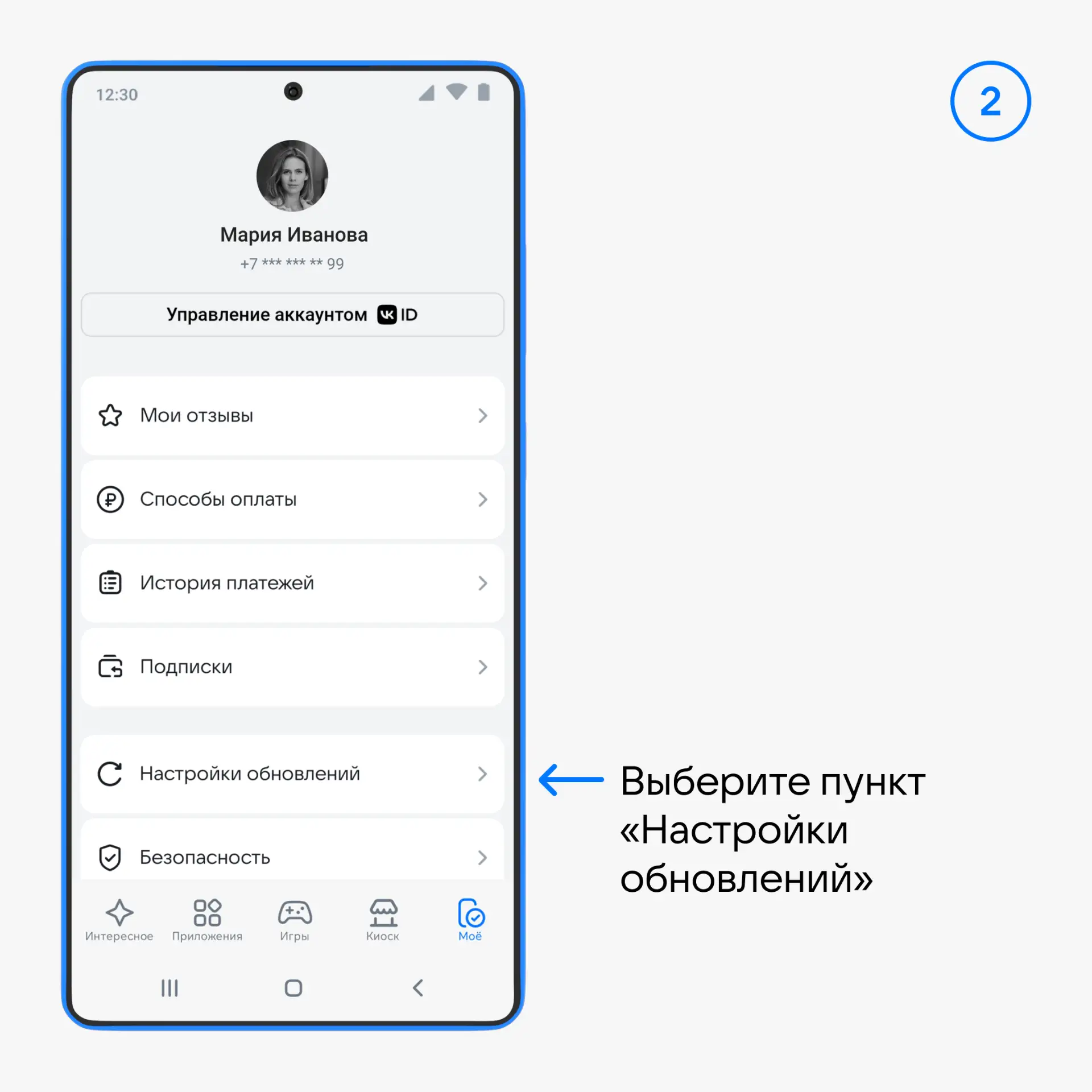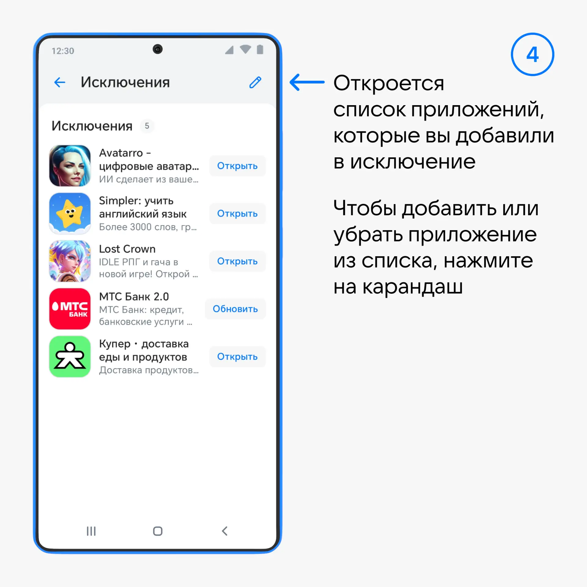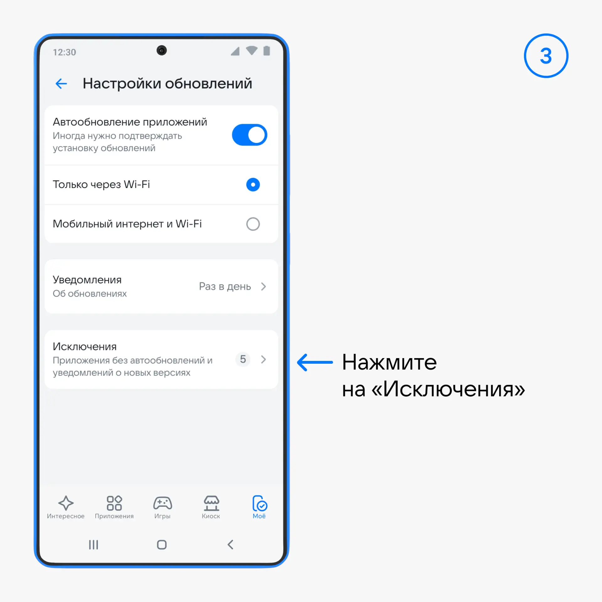 После настройки списка приложений-исключений новые версии больше не будут появляться в разделе «Моё» и уведомлениях.