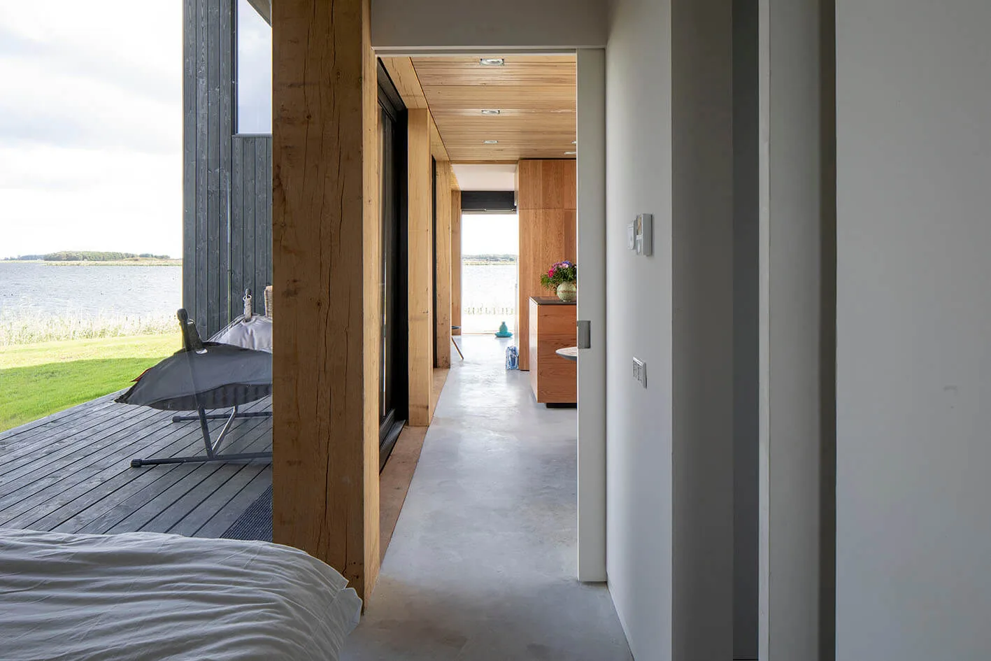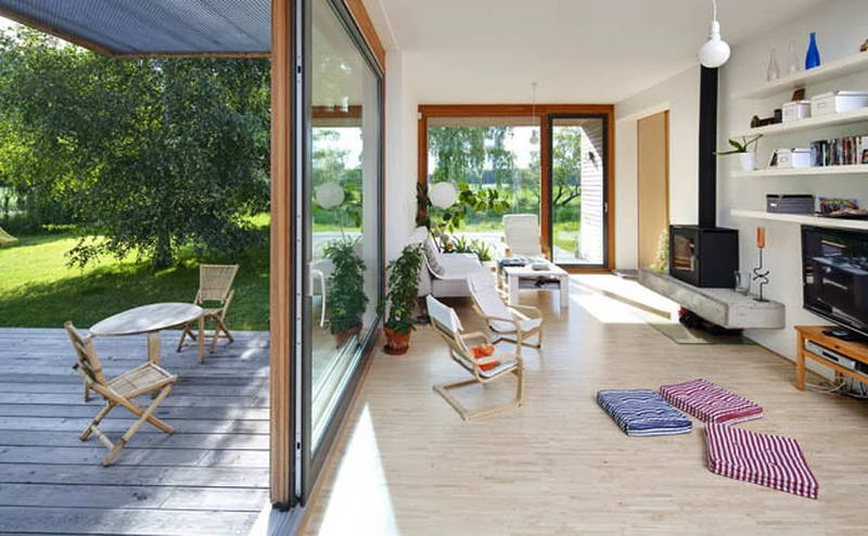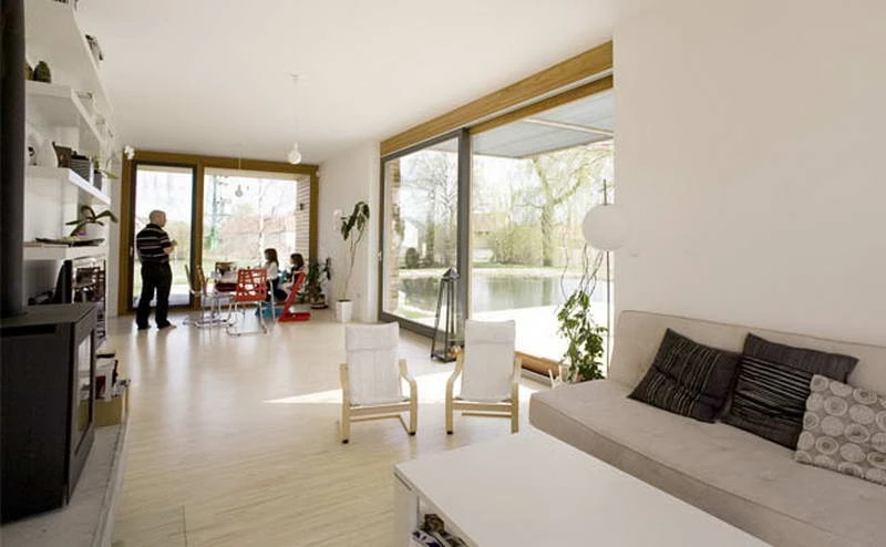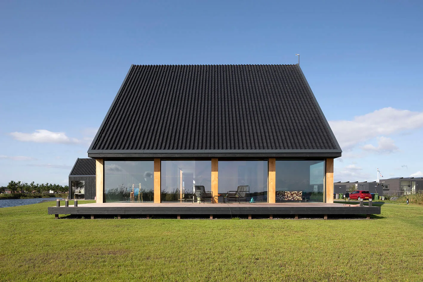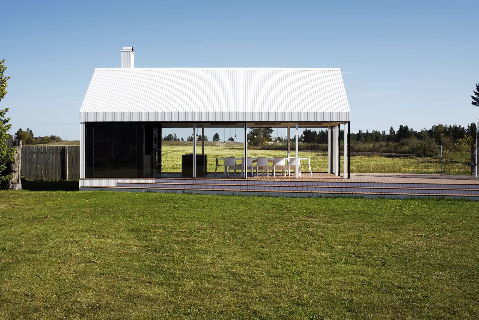Этот домик расположен на краю луга рядом с заболоченной местностью у реки. Он гармонично вписывается в окружающую среду благодаря панорамным окнам и просторной веранде, которой можно пользоваться круглый год. Из окон открывается прекрасный вид.
