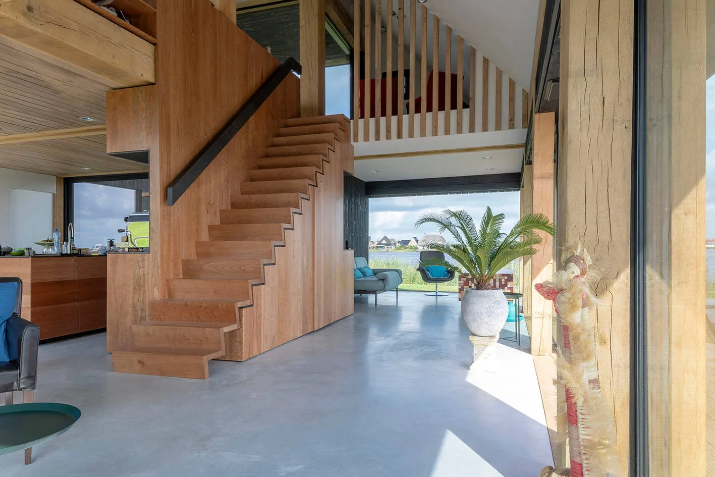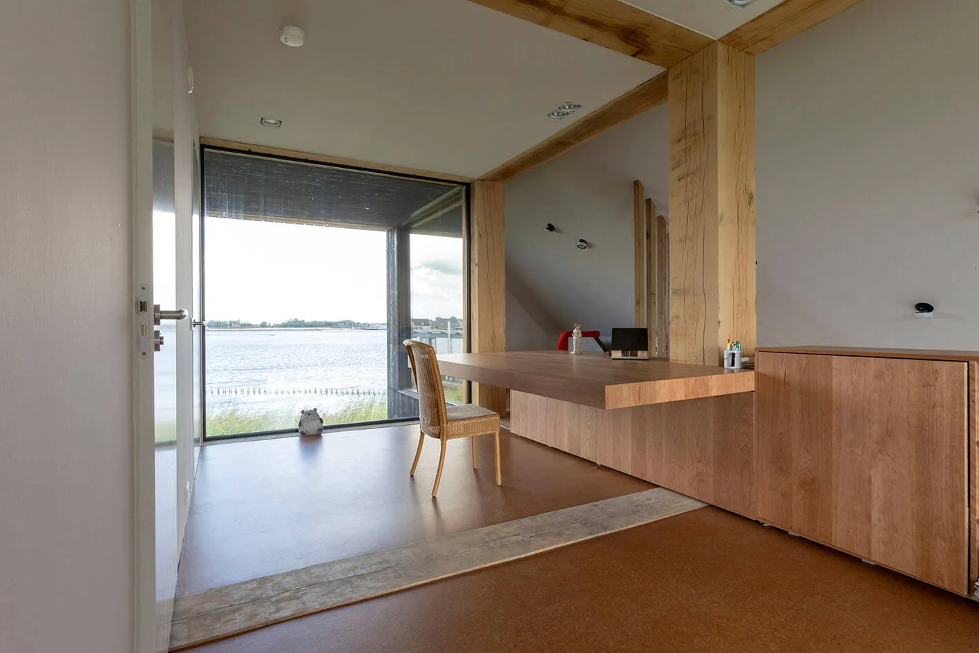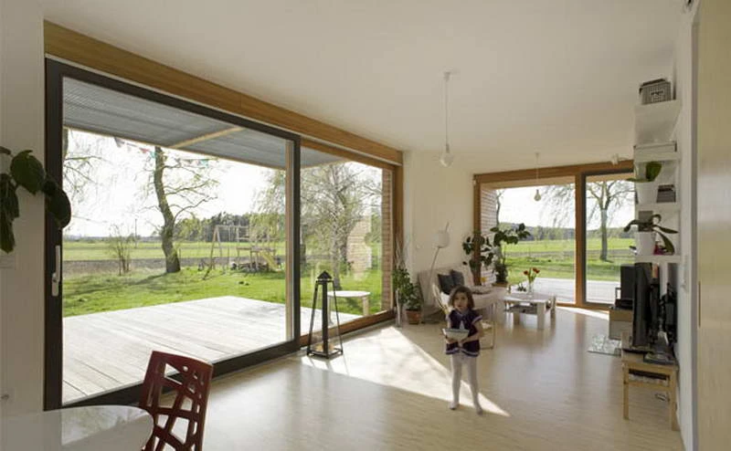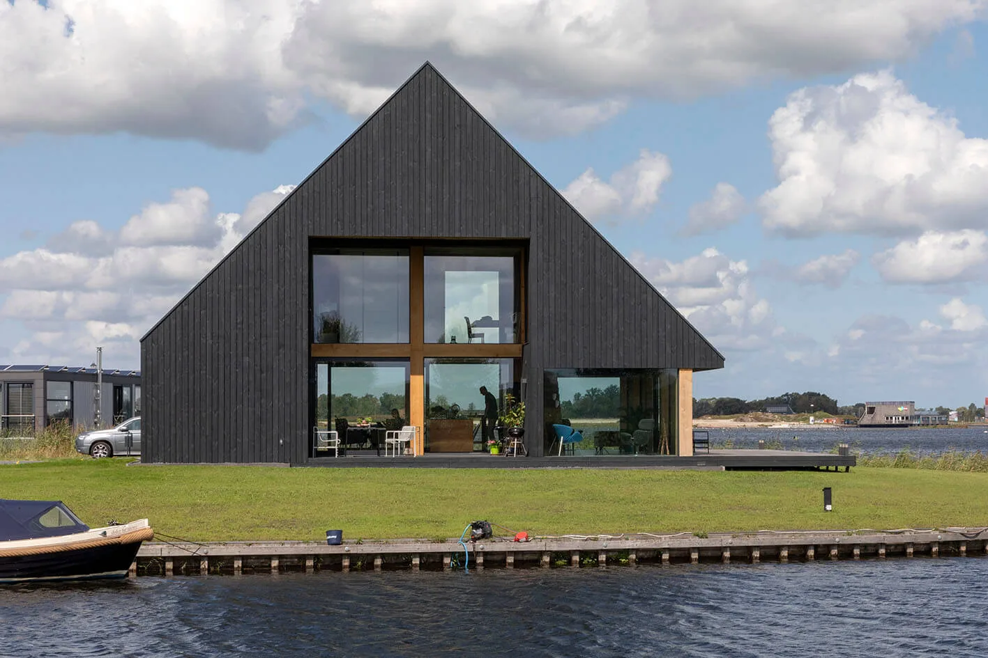 Этот домик расположен на краю луга рядом с заболоченной местностью у реки. Он гармонично вписывается в окружающую среду благодаря панорамным окнам и просторной веранде, которой можно пользоваться круглый год. Из окон открывается прекрасный вид.