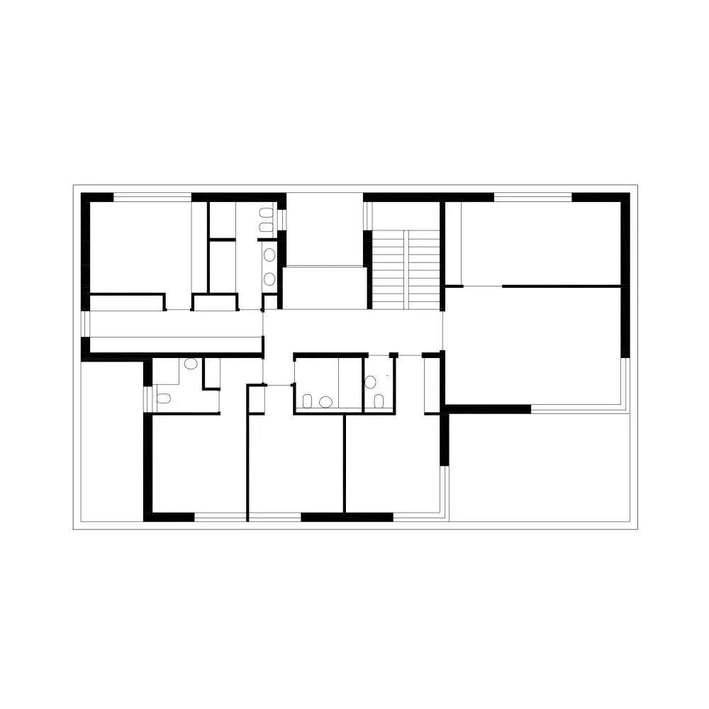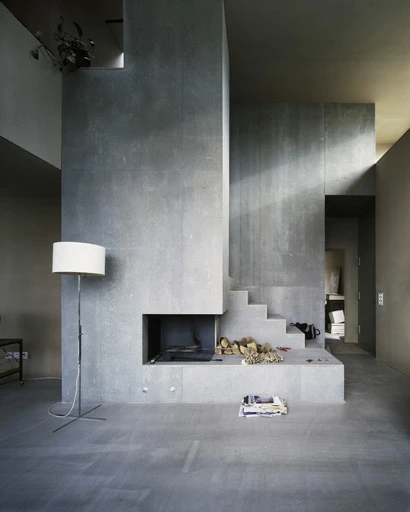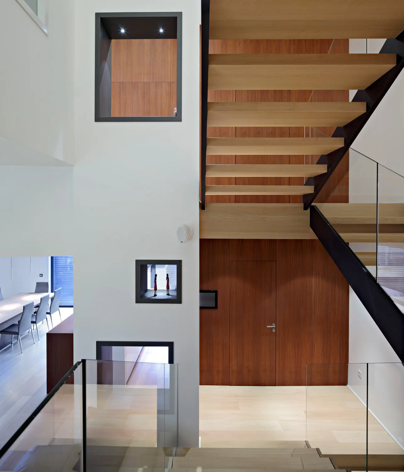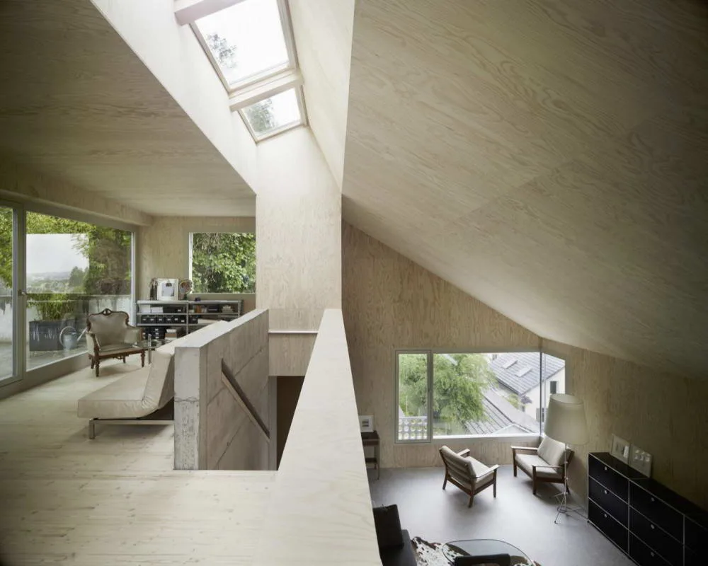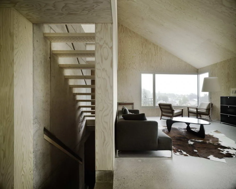 На втором этаже ориентация двух одинаковых квартир меняется на 90 градусов, чтобы подчеркнуть ощущение, что это дом для одной семьи, и использовать преимущества разных видов из окон. Бетонный каркас — основа дома, простирающаяся от подвала до крыши. Лестница со скульптурными элементами создает ощущение простора и открывает интересные виды внутри дома.