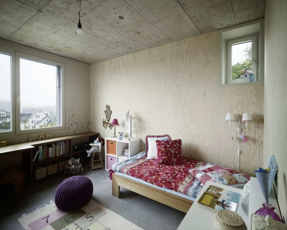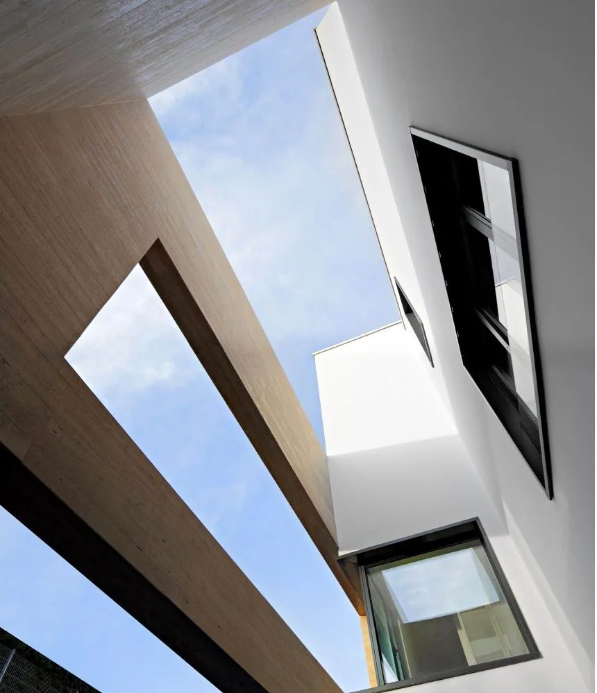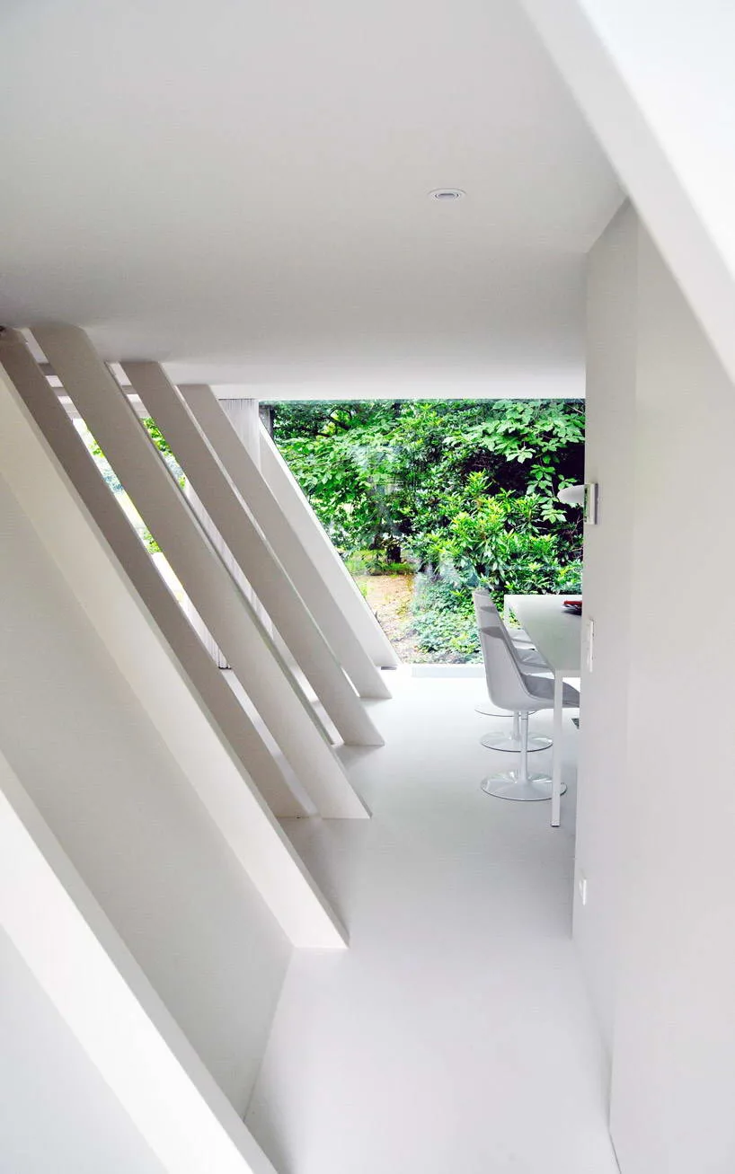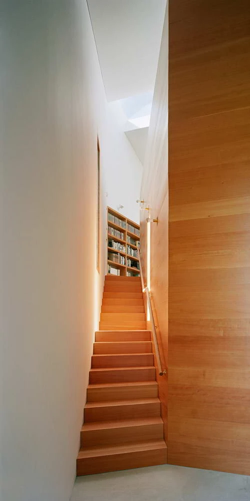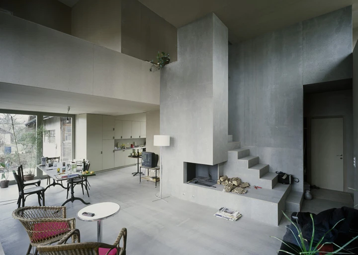 На втором этаже ориентация двух одинаковых квартир меняется на 90 градусов, чтобы подчеркнуть ощущение, что это дом для одной семьи, и использовать преимущества разных видов из окон. Бетонный каркас — основа дома, простирающаяся от подвала до крыши. Лестница со скульптурными элементами создает ощущение простора и открывает интересные виды внутри дома.