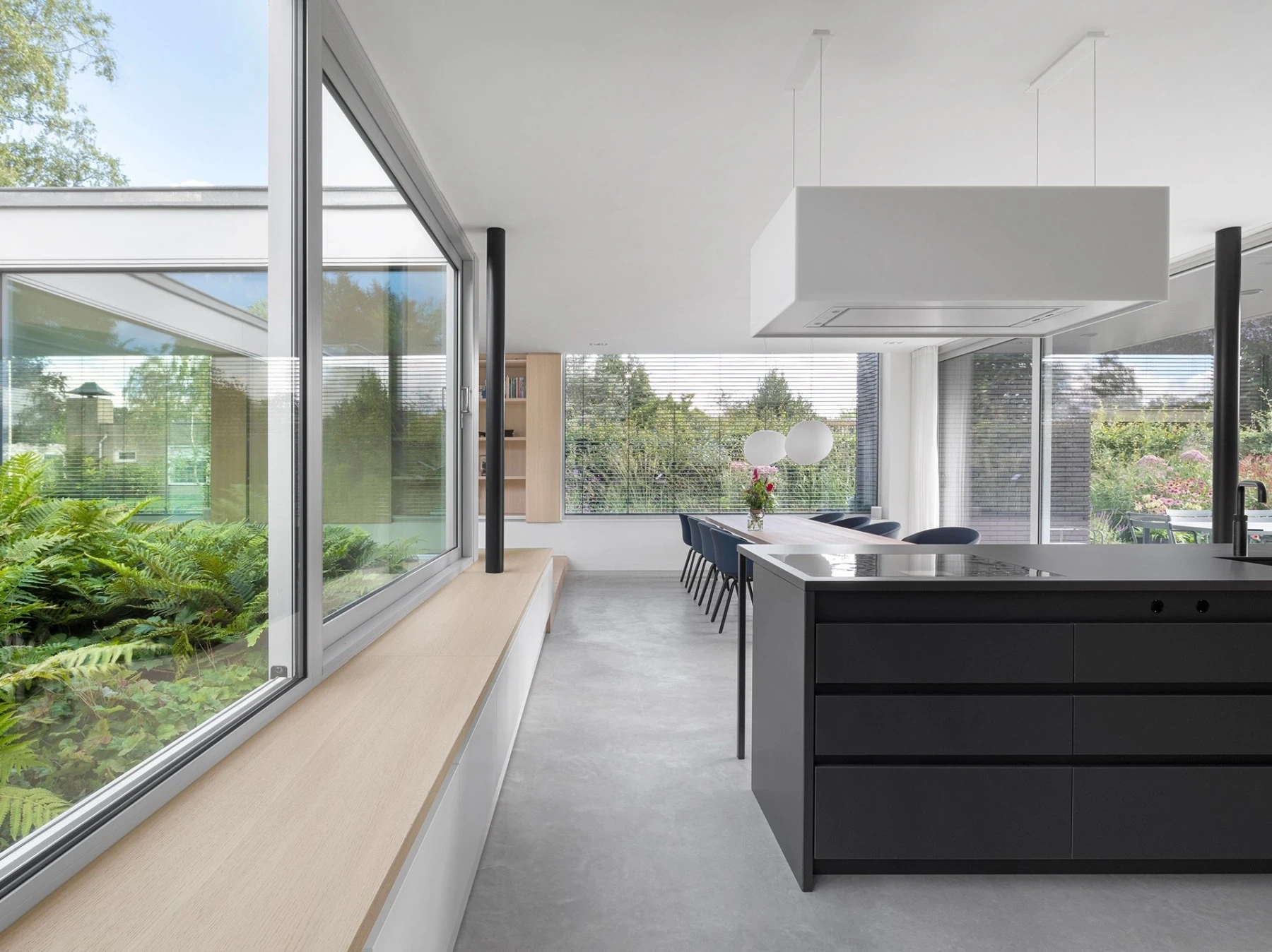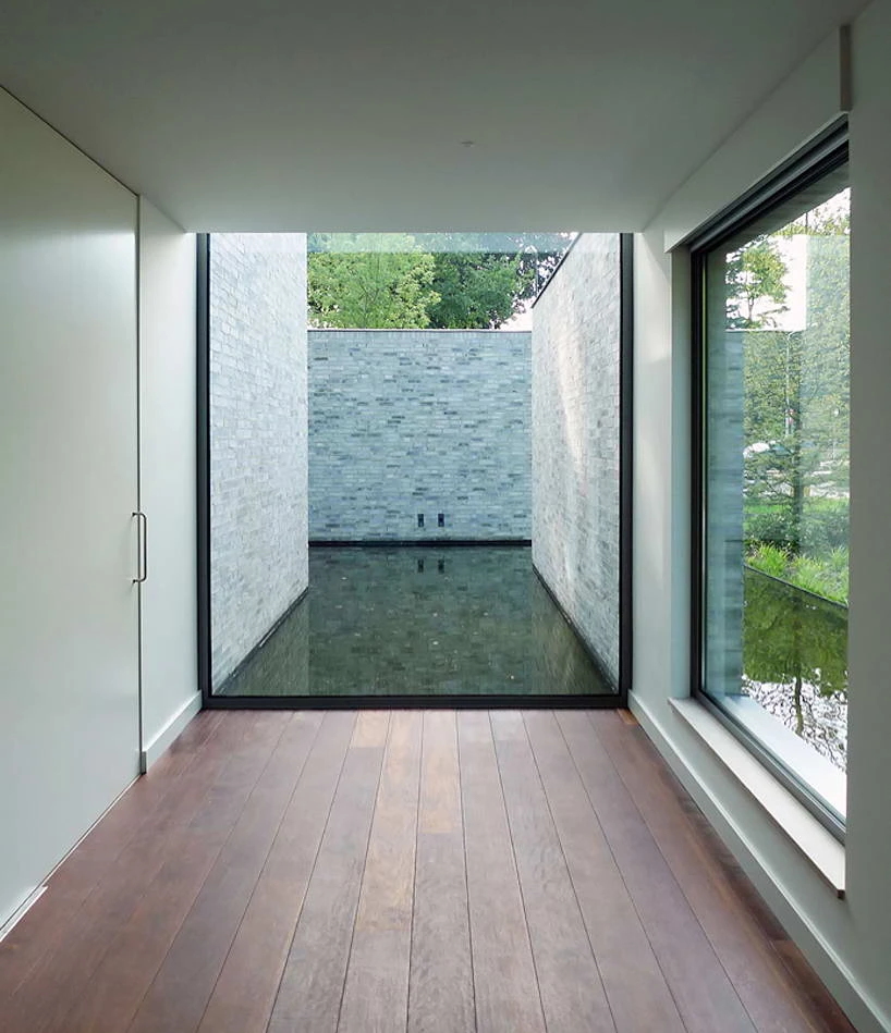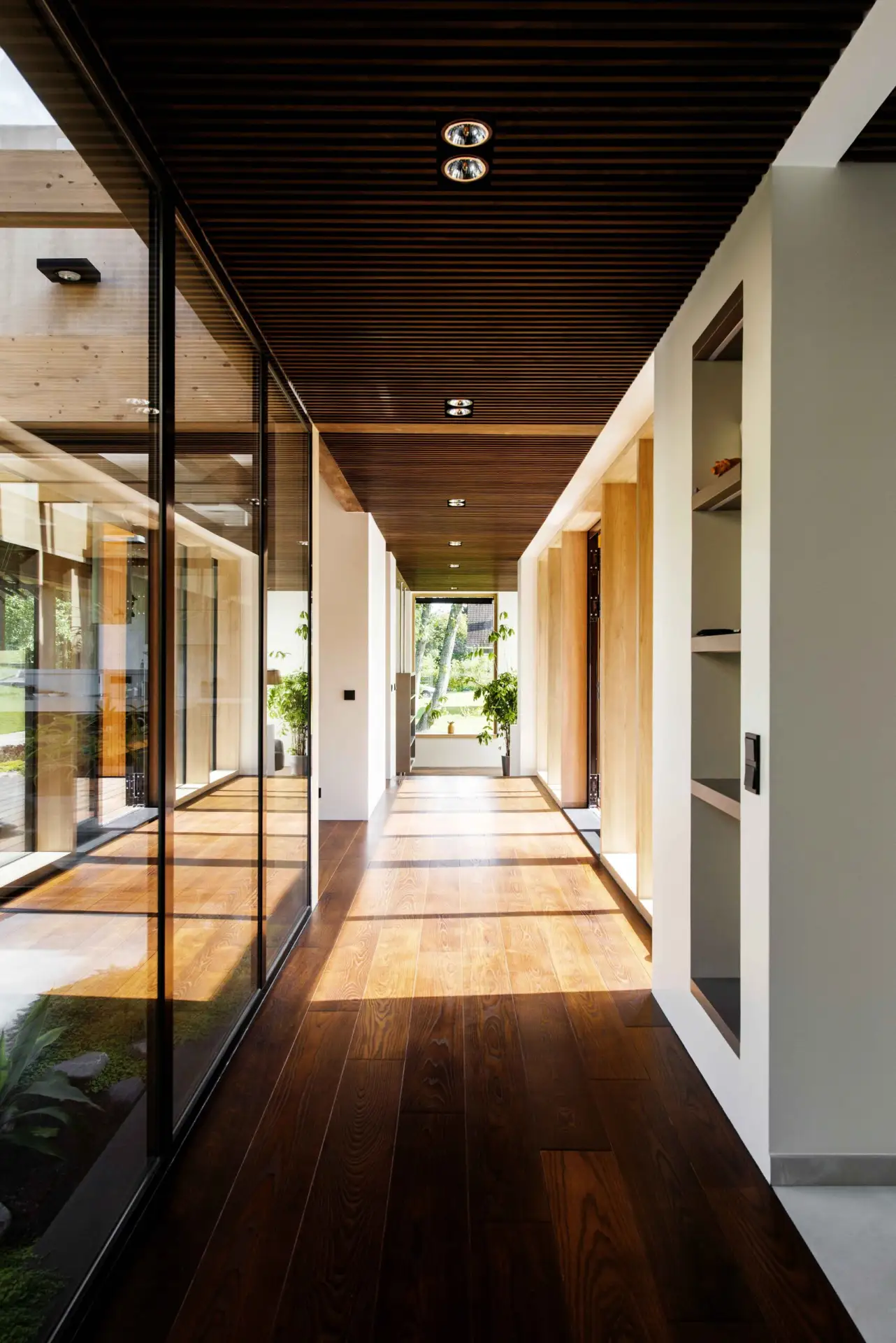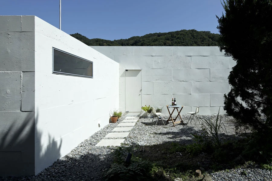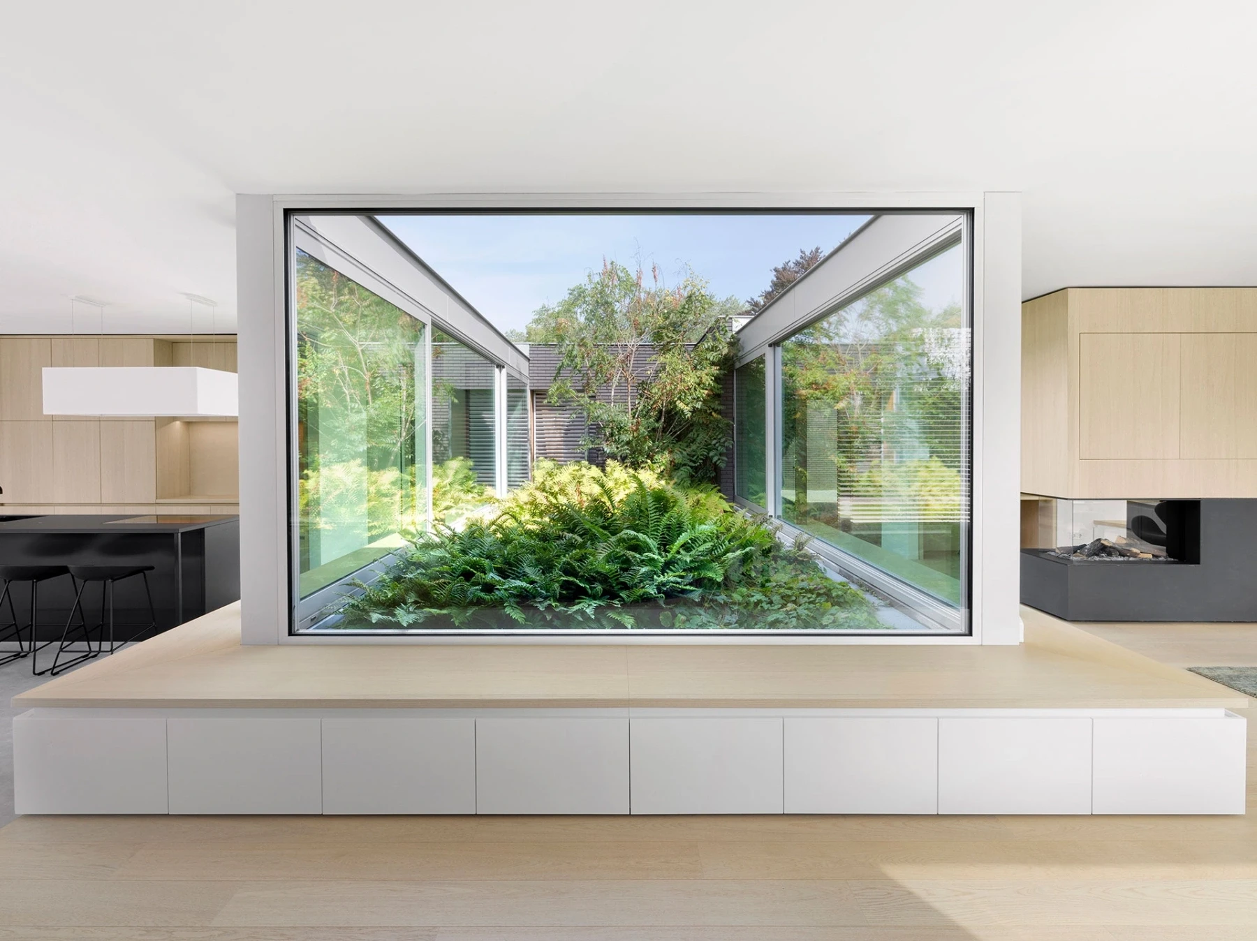 Эта просторное строение было создано для семьи из четырех человек, что позволило объединить все различные пространства на одном уровне. Устойчивый и просторный дом, стирающий границы между внутренним и наружным пространством. Посреди гостиной расположен пышный зеленый внутренний дворик, а раздвижные двери от пола до потолка открывают беспрепятственный вид на окружающий сад.