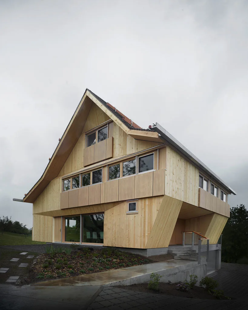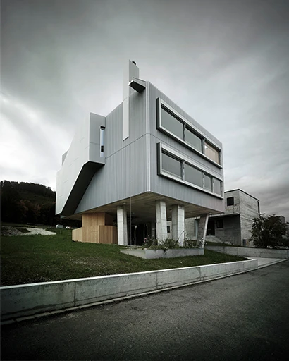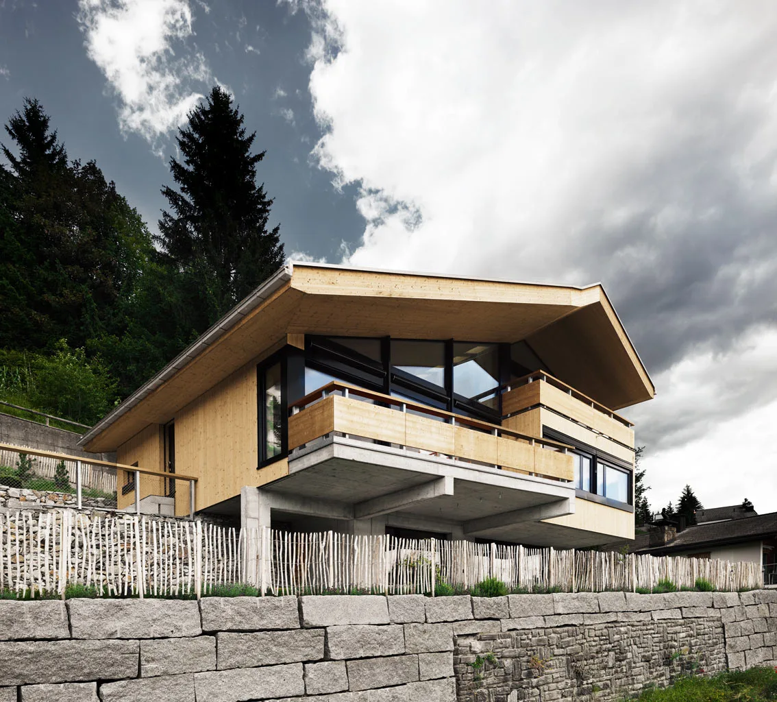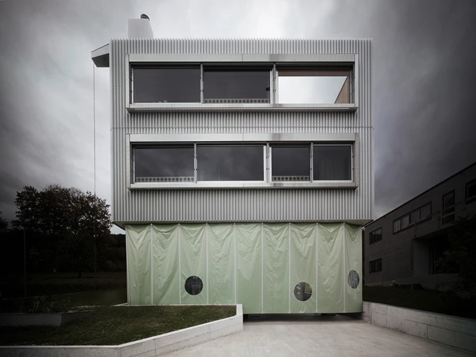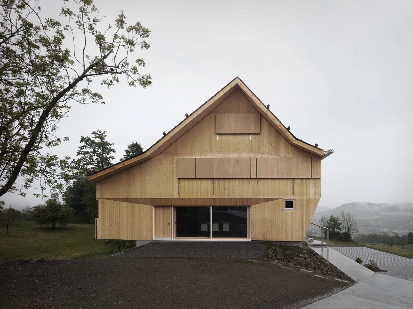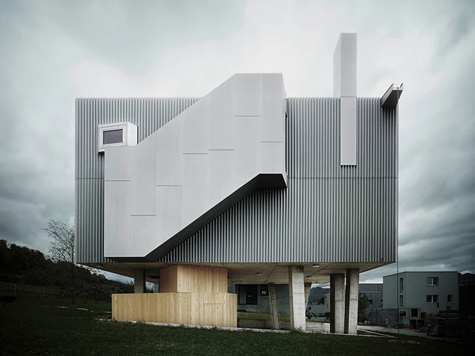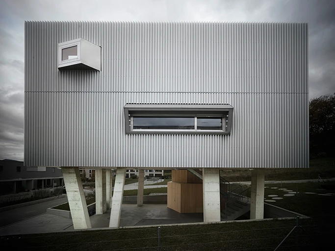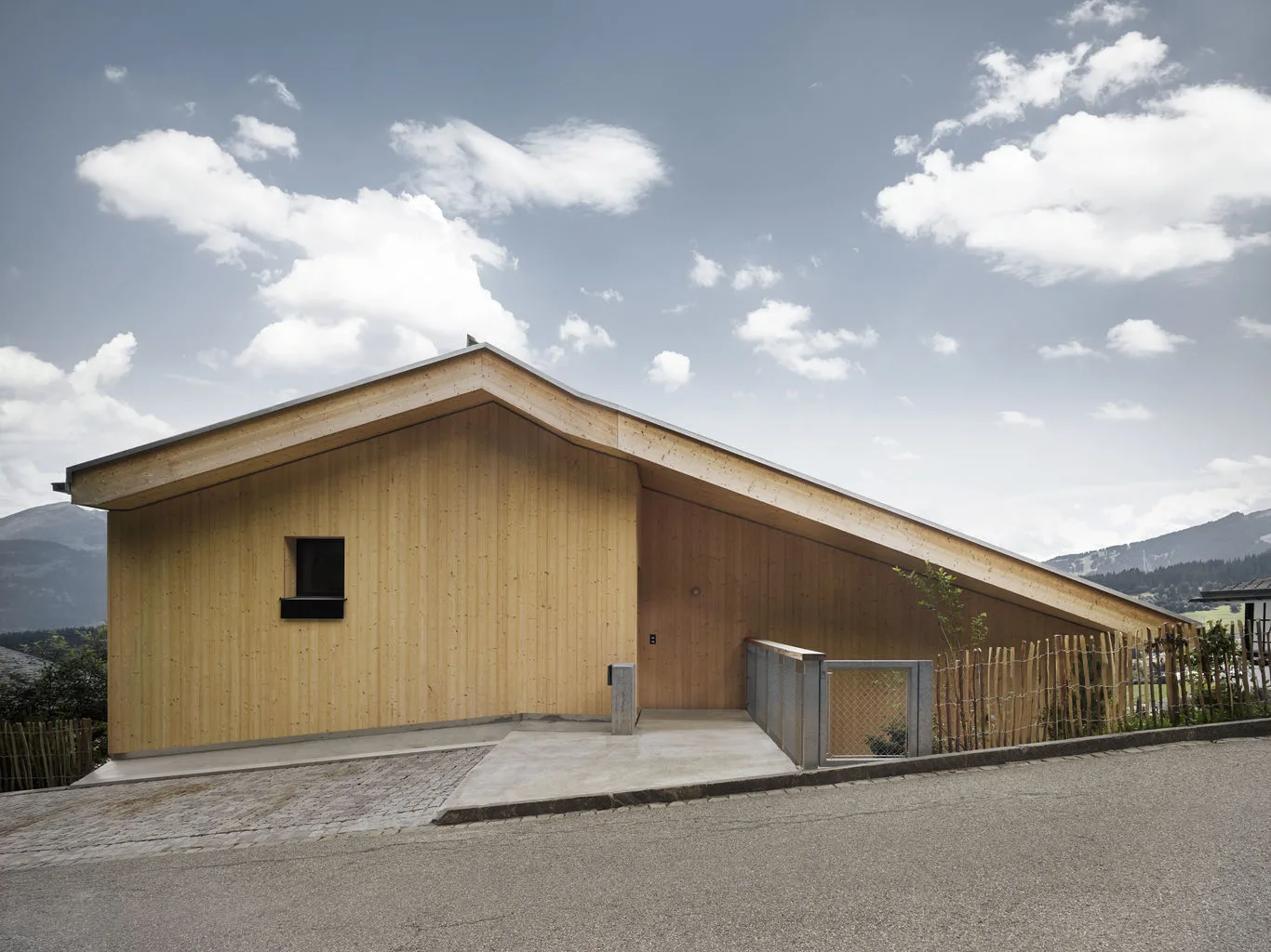 Характерный профиль поперечного сечения подчеркивается слегка скошенными фасадами. Небольшие выступы и углубления на торцевом фасаде отсылают к традиционным местным навесным конструкциям. Эти горизонтальные элементы переосмыслены и сочетают в себе традиции и современность. Этому способствуют ряд окон и вертикально сдвигающиеся ставни.