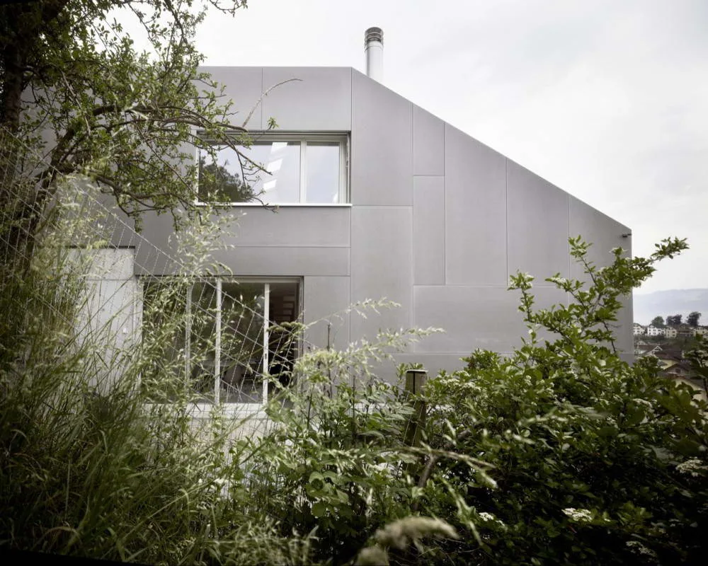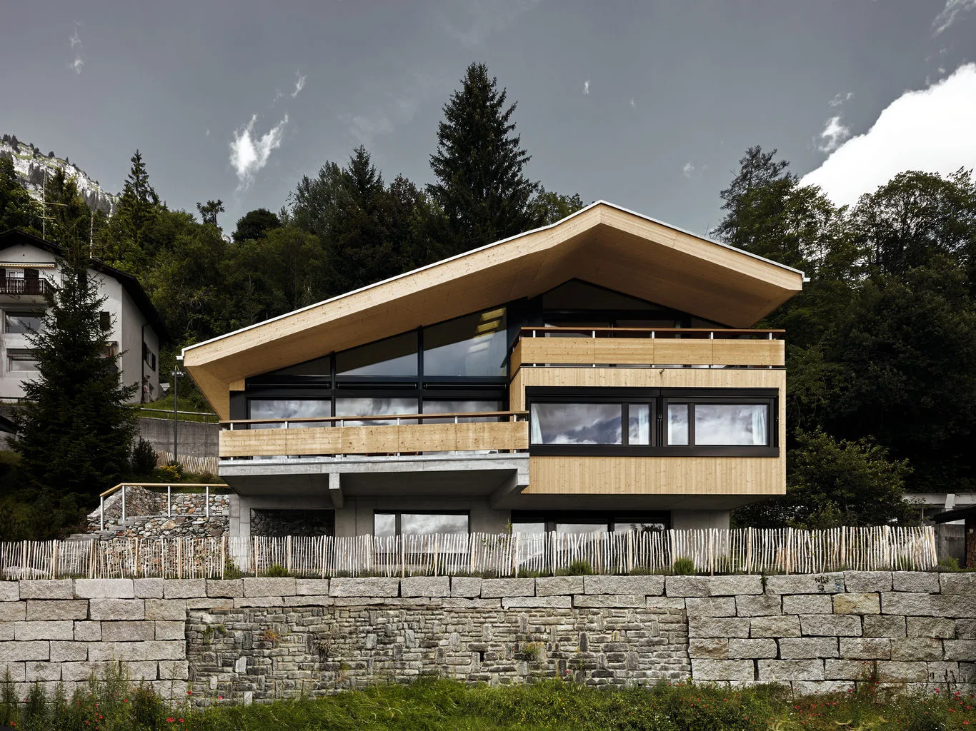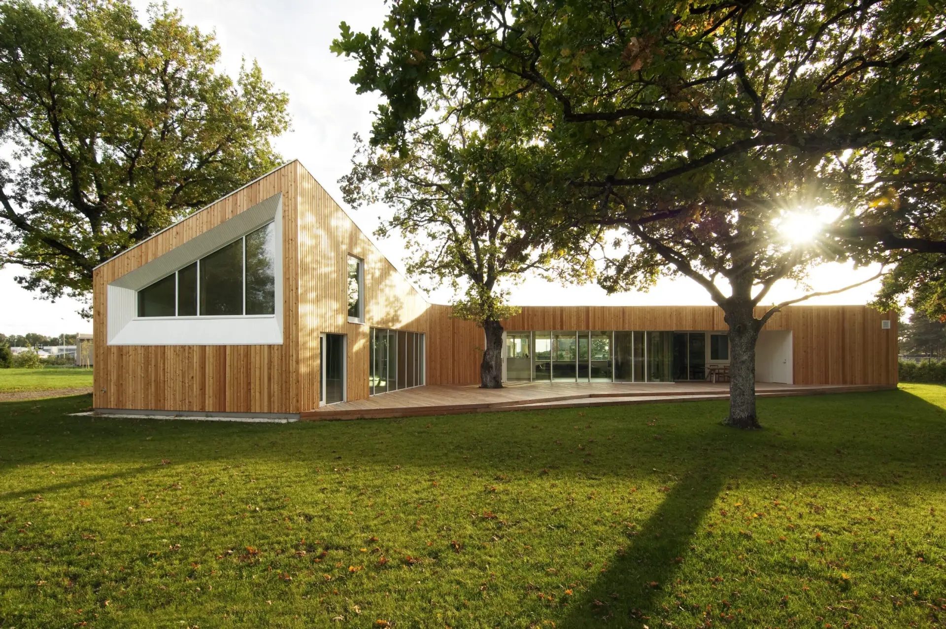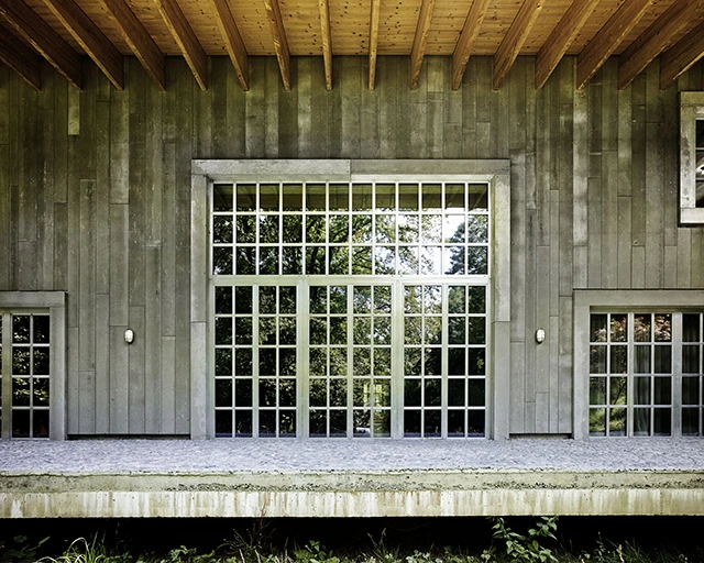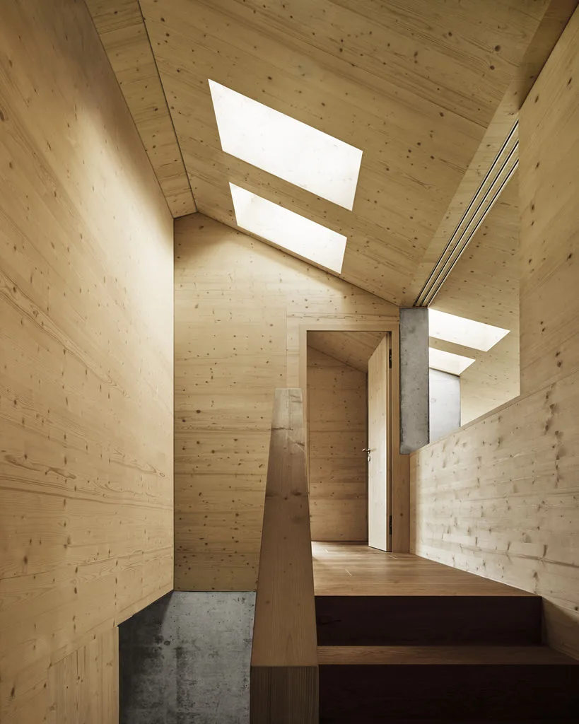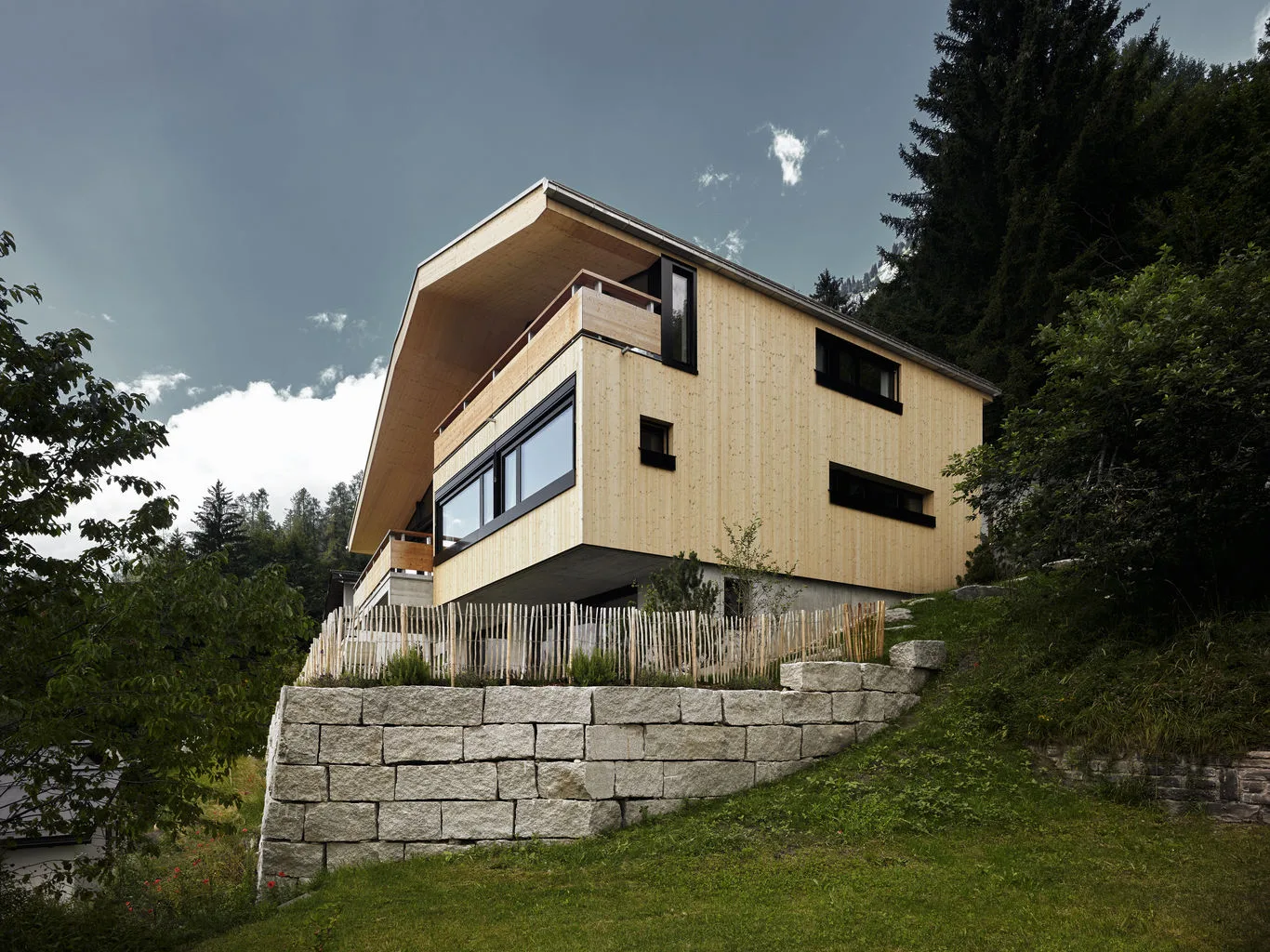 Характерный профиль поперечного сечения подчеркивается слегка скошенными фасадами. Небольшие выступы и углубления на торцевом фасаде отсылают к традиционным местным навесным конструкциям. Эти горизонтальные элементы переосмыслены и сочетают в себе традиции и современность. Этому способствуют ряд окон и вертикально сдвигающиеся ставни.