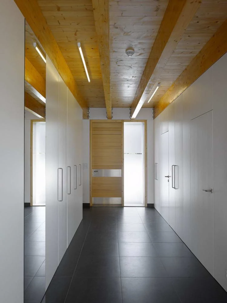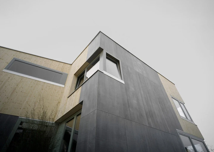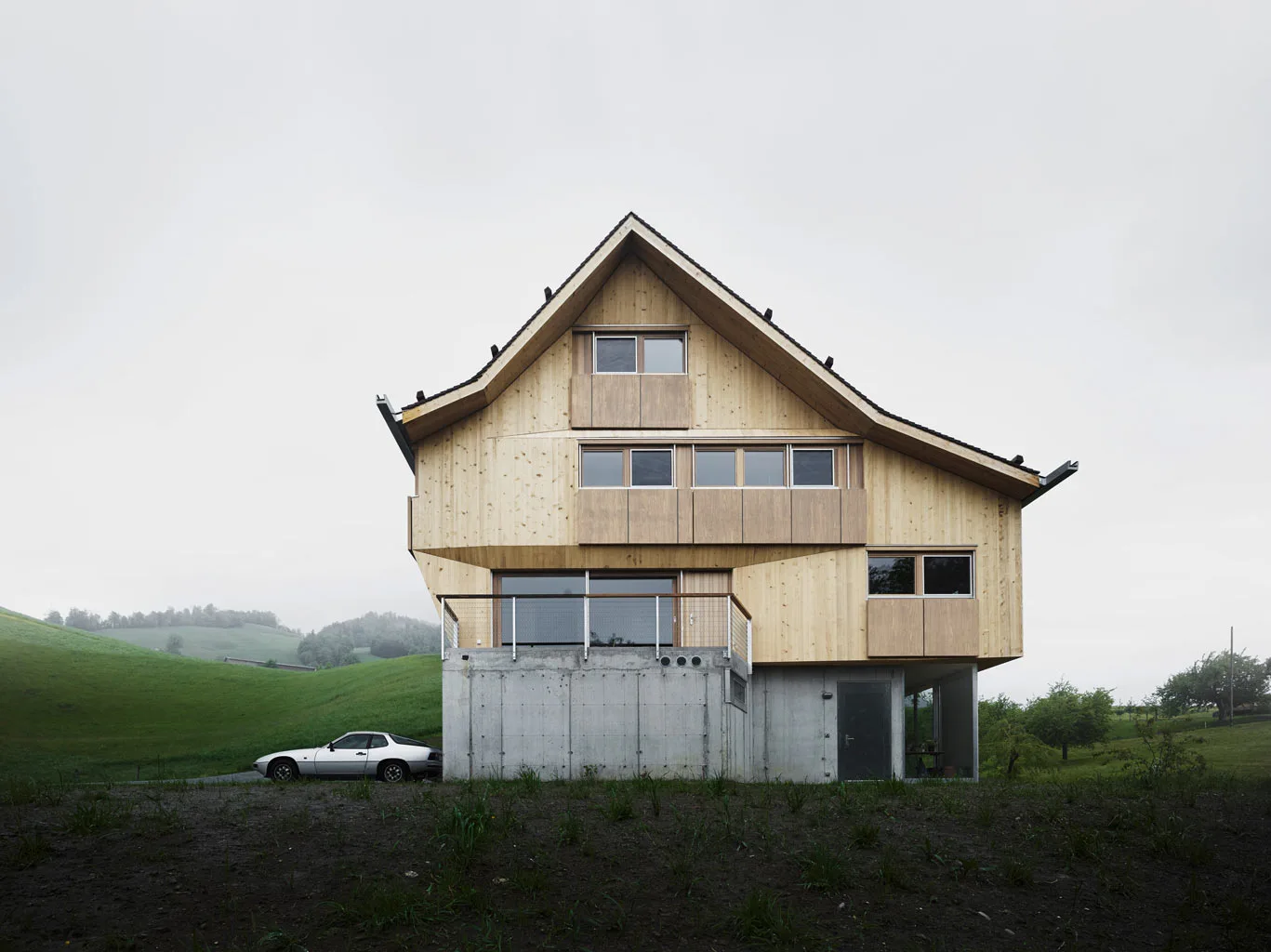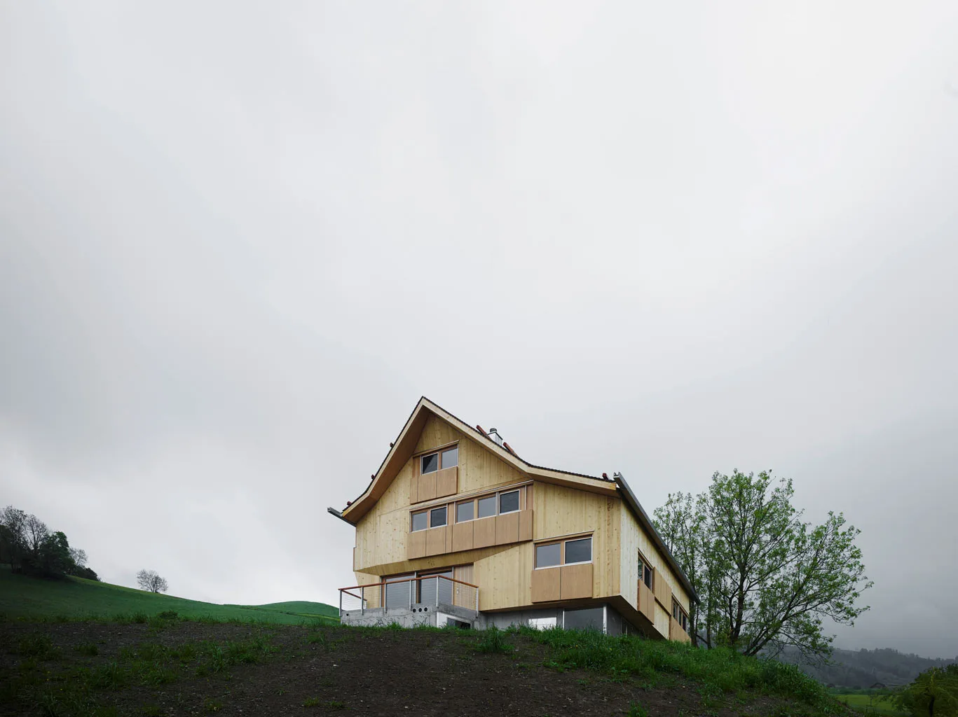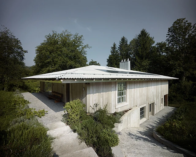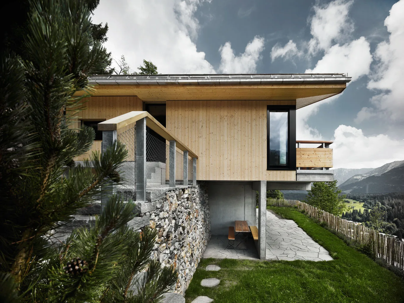 Характерный профиль поперечного сечения подчеркивается слегка скошенными фасадами. Небольшие выступы и углубления на торцевом фасаде отсылают к традиционным местным навесным конструкциям. Эти горизонтальные элементы переосмыслены и сочетают в себе традиции и современность. Этому способствуют ряд окон и вертикально сдвигающиеся ставни.