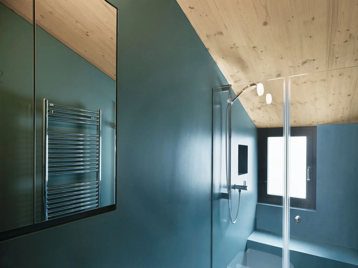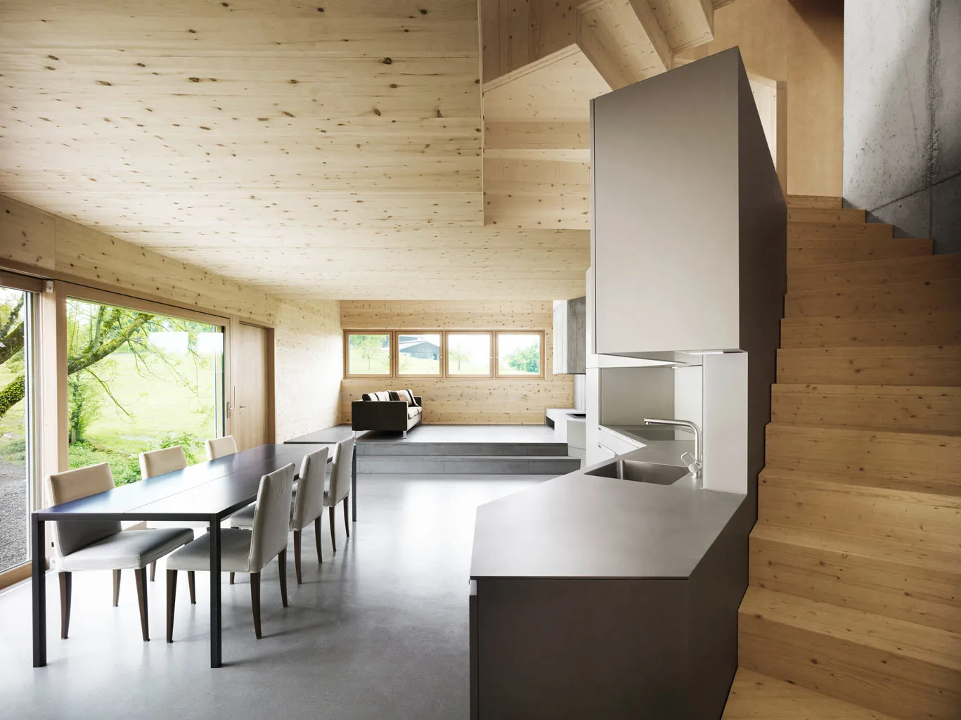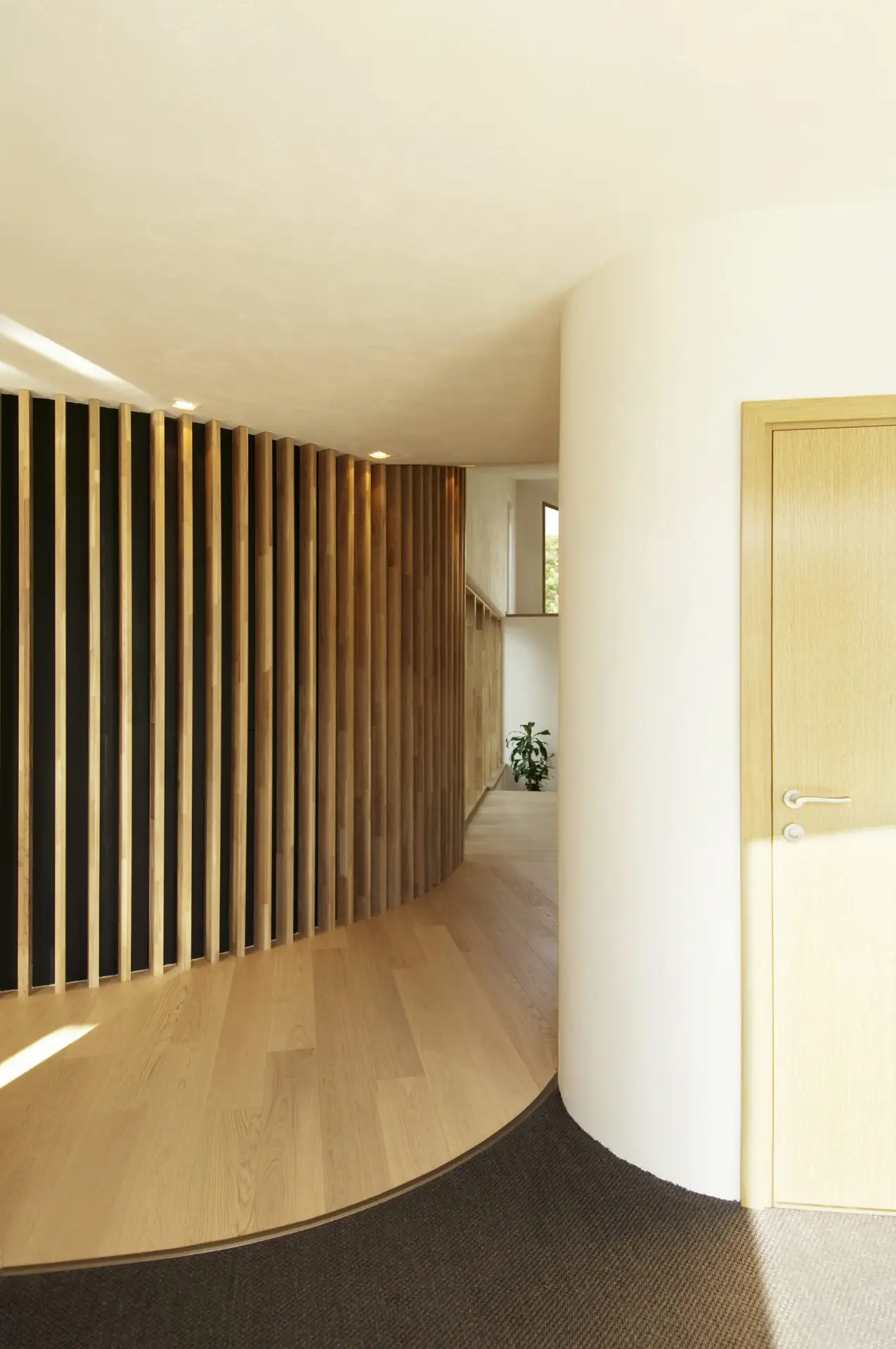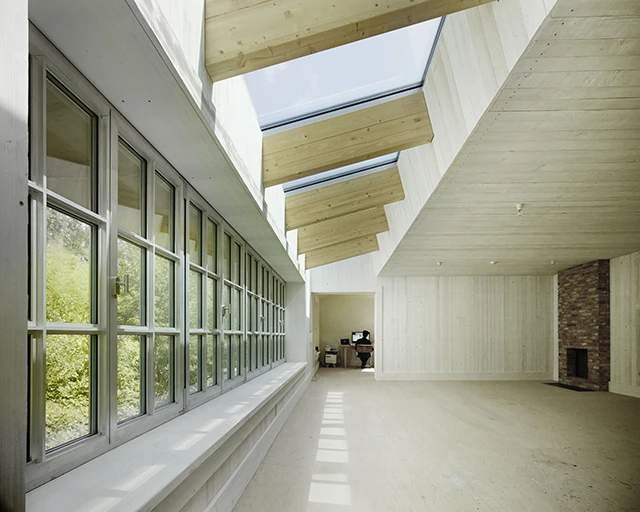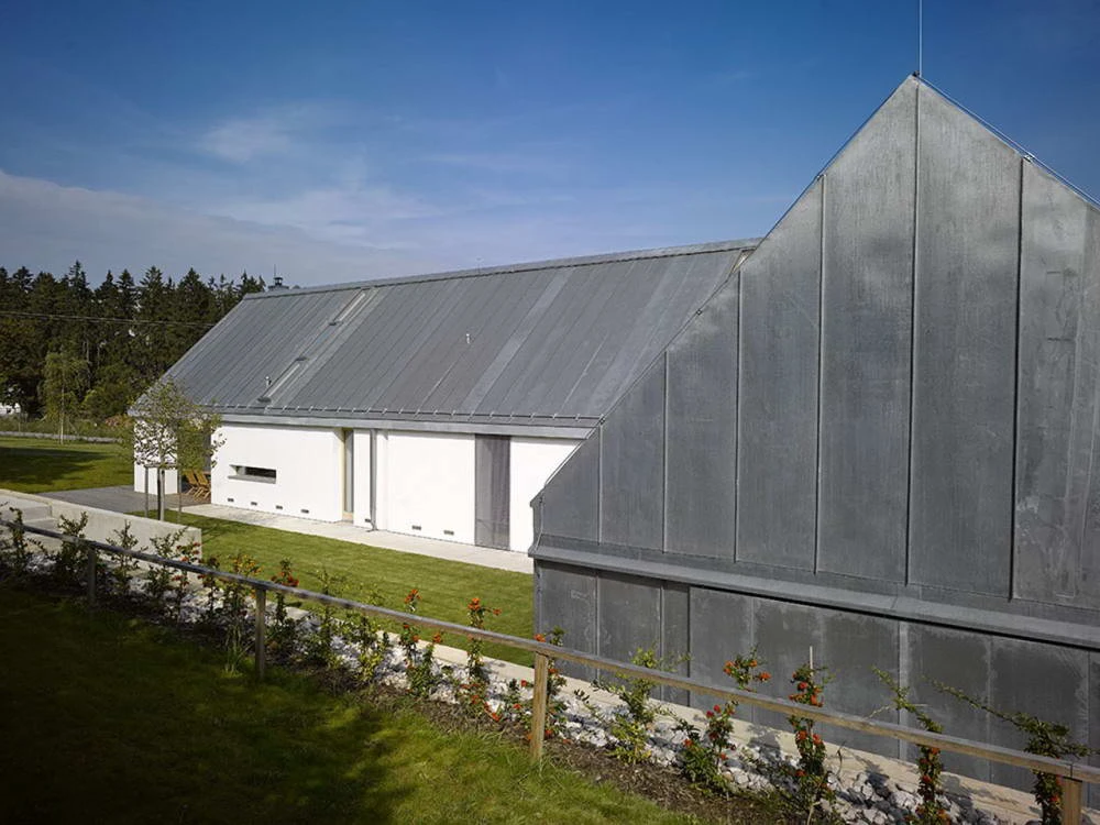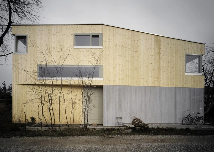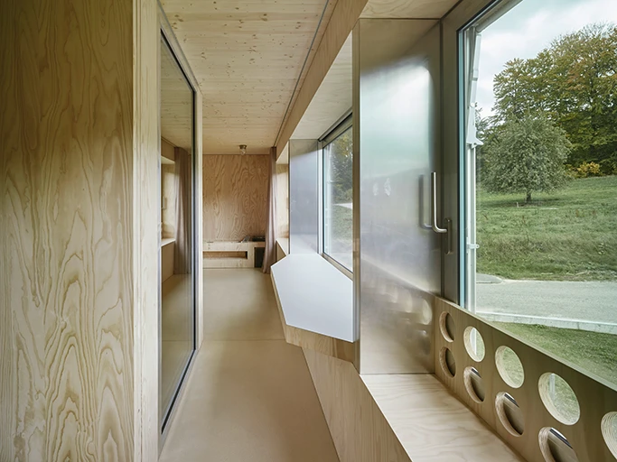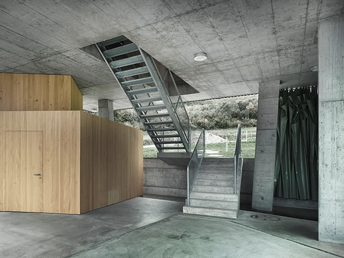 Характерный профиль поперечного сечения подчеркивается слегка скошенными фасадами. Небольшие выступы и углубления на торцевом фасаде отсылают к традиционным местным навесным конструкциям. Эти горизонтальные элементы переосмыслены и сочетают в себе традиции и современность. Этому способствуют ряд окон и вертикально сдвигающиеся ставни.