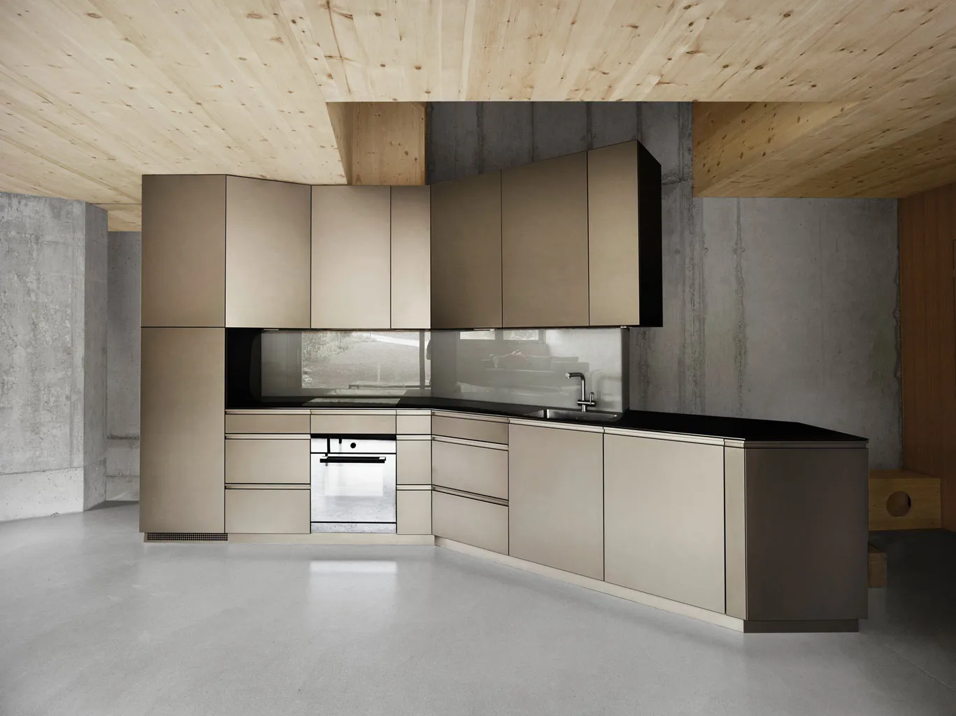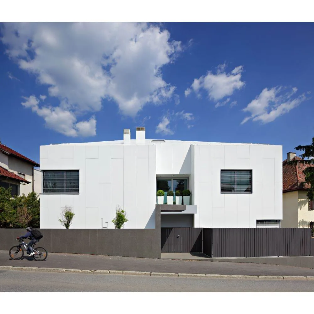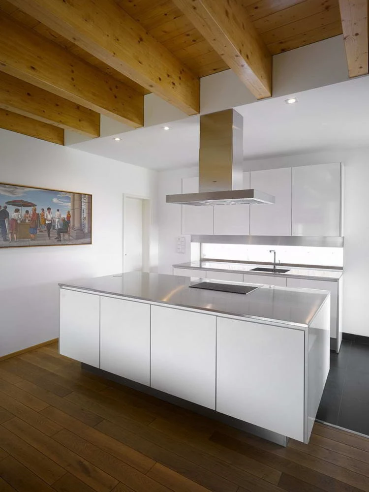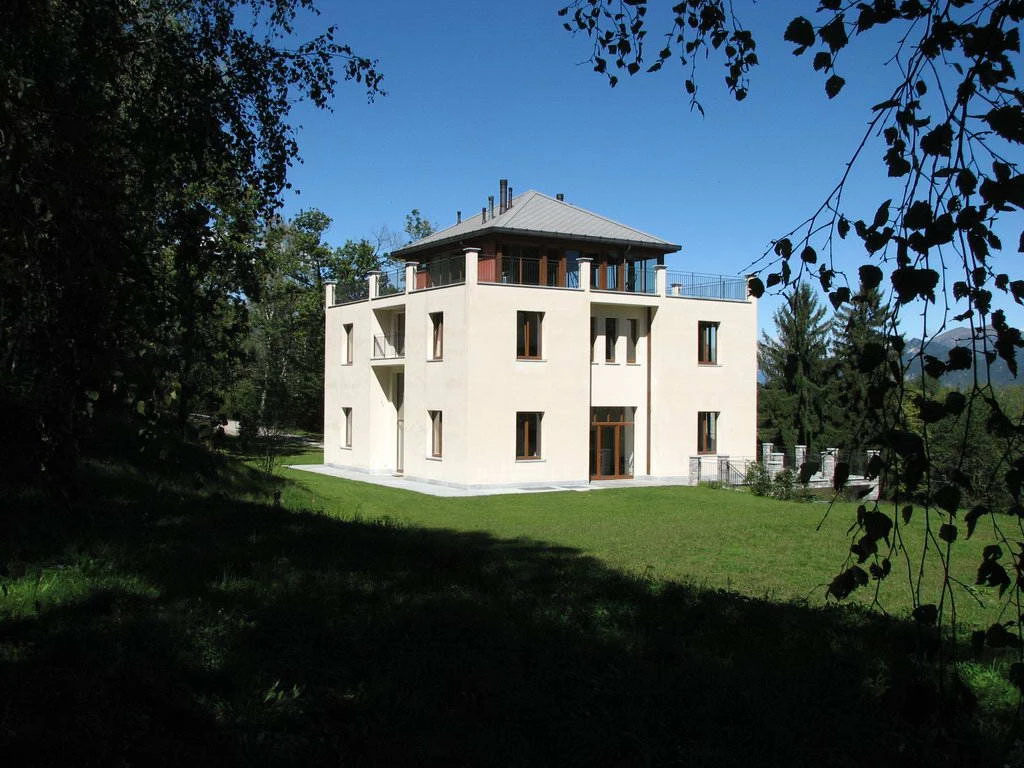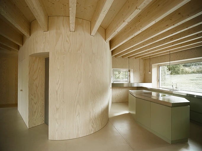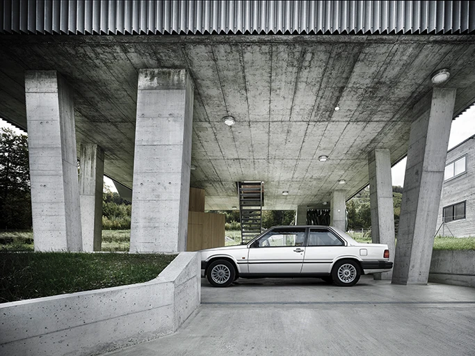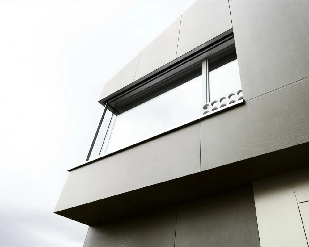Характерный профиль поперечного сечения подчеркивается слегка скошенными фасадами. Небольшие выступы и углубления на торцевом фасаде отсылают к традиционным местным навесным конструкциям. Эти горизонтальные элементы переосмыслены и сочетают в себе традиции и современность. Этому способствуют ряд окон и вертикально сдвигающиеся ставни.