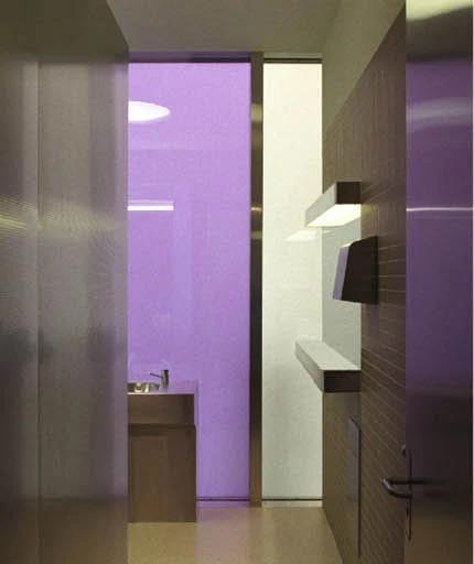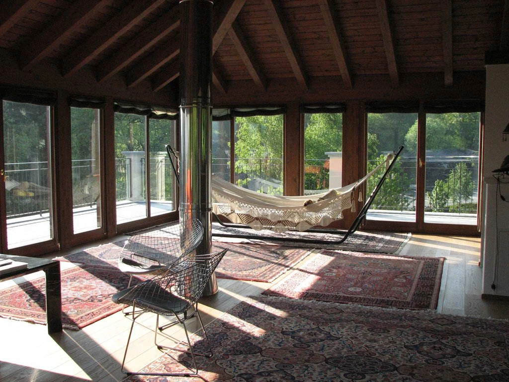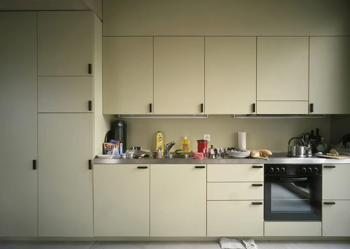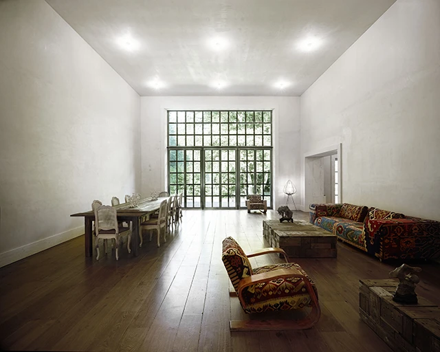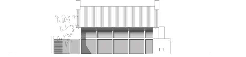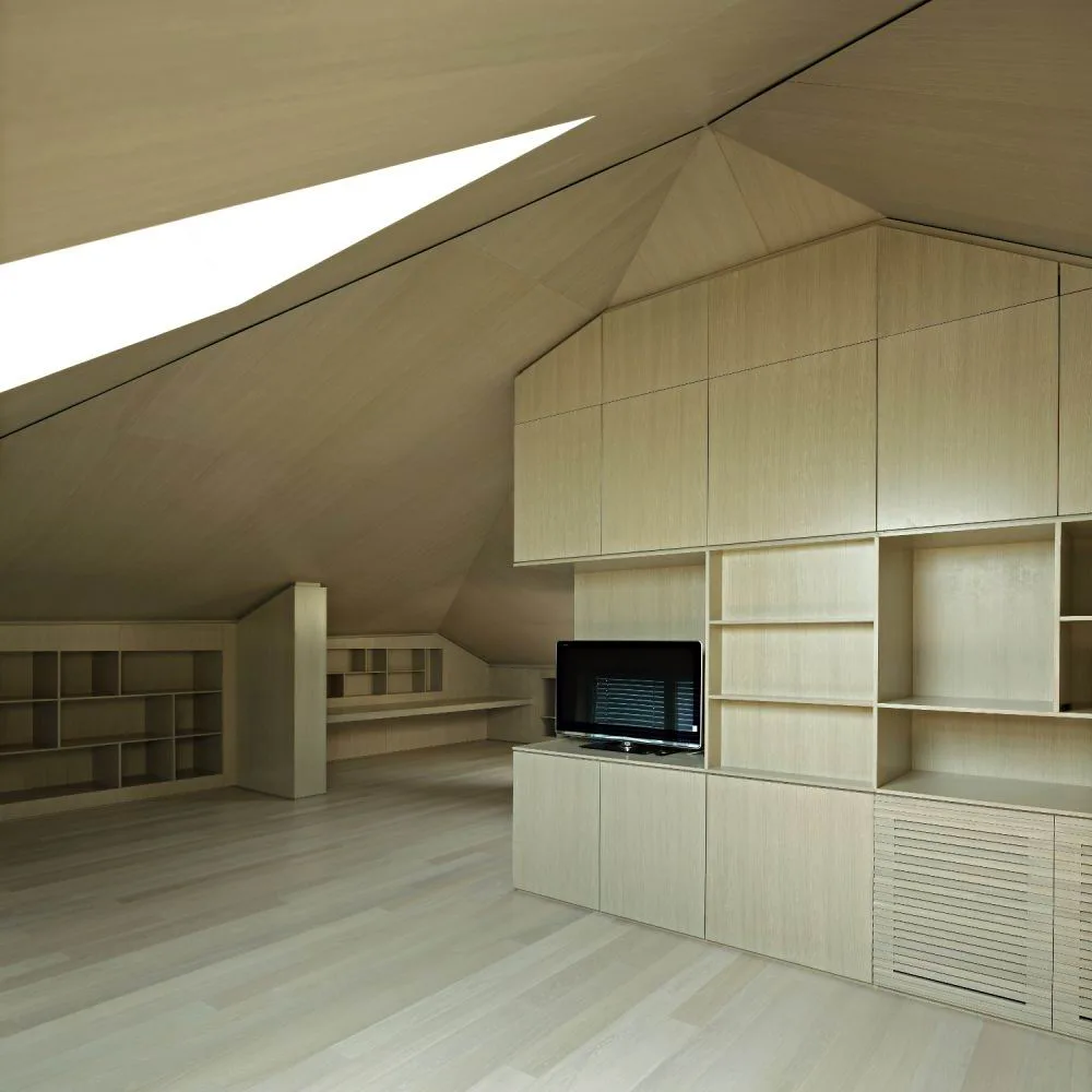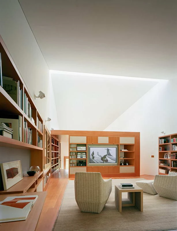 Вокруг площади расположены два боковых прохода с жилой программой и две веранды. один боковой проход находится в гостиной, из которой открывается мега-мебель, выполняющая различные функции, такие как кухня, лестница и письменный стол. Другой боковой проход состоит из зоны обслуживания со спальней и носит более закрытый характер.