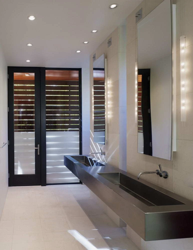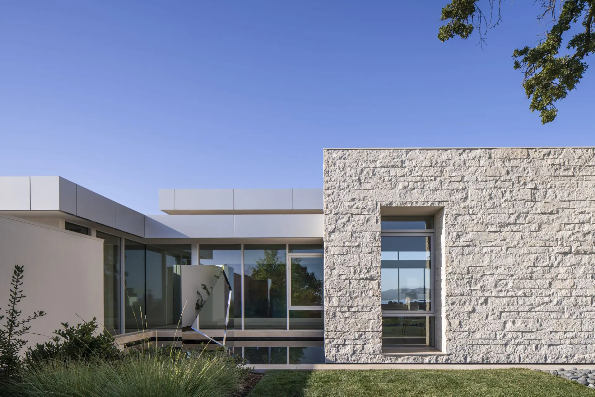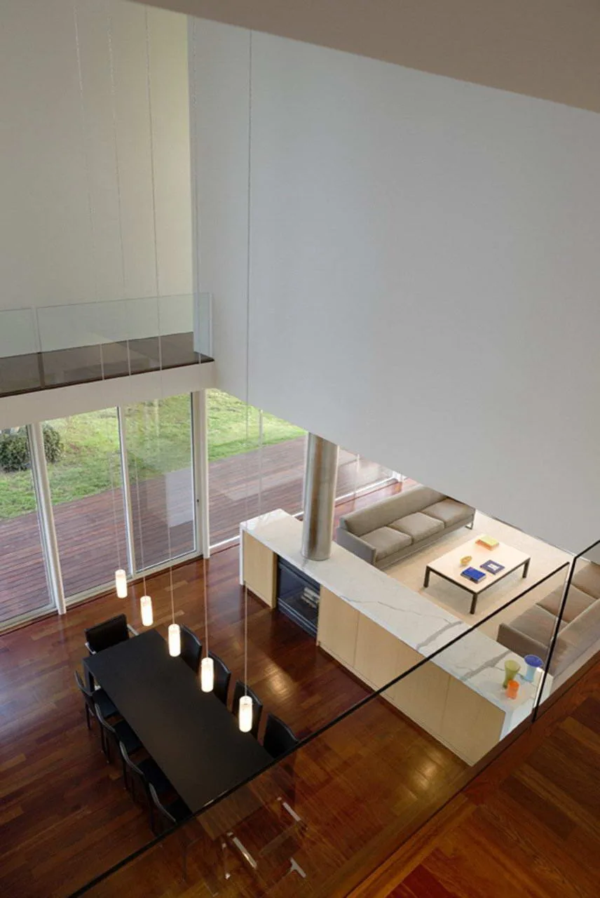 В доме три зоны: два крайних блока из камня и стекла, частный и гостевой, объединены друг с другом стеклянным павильоном, в котором расположены кухня, столовая и гостиная.