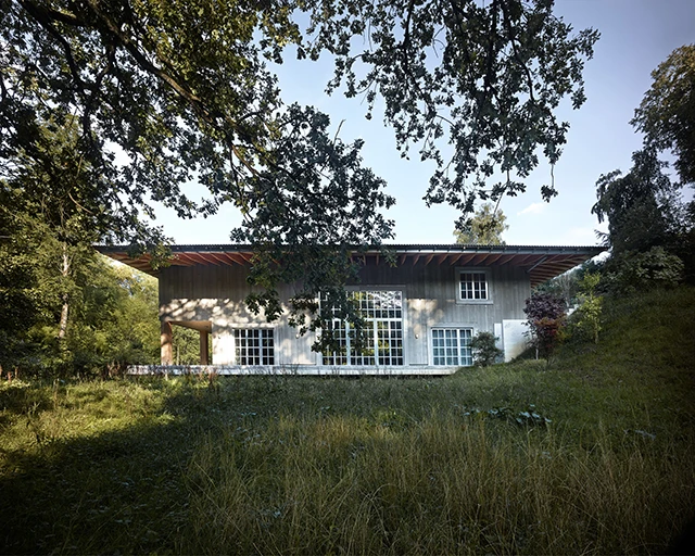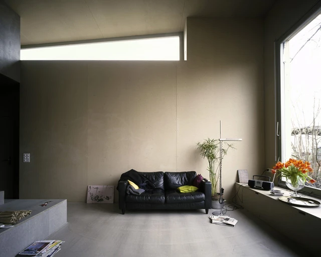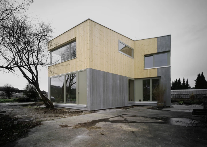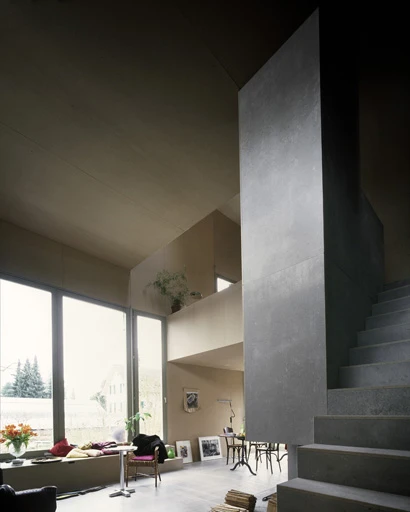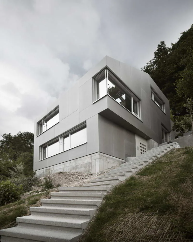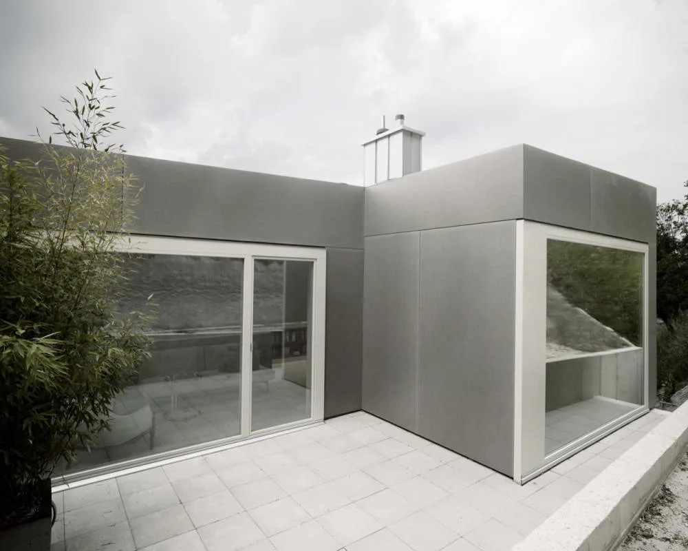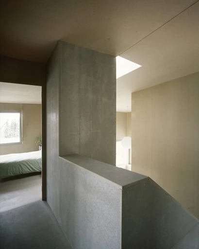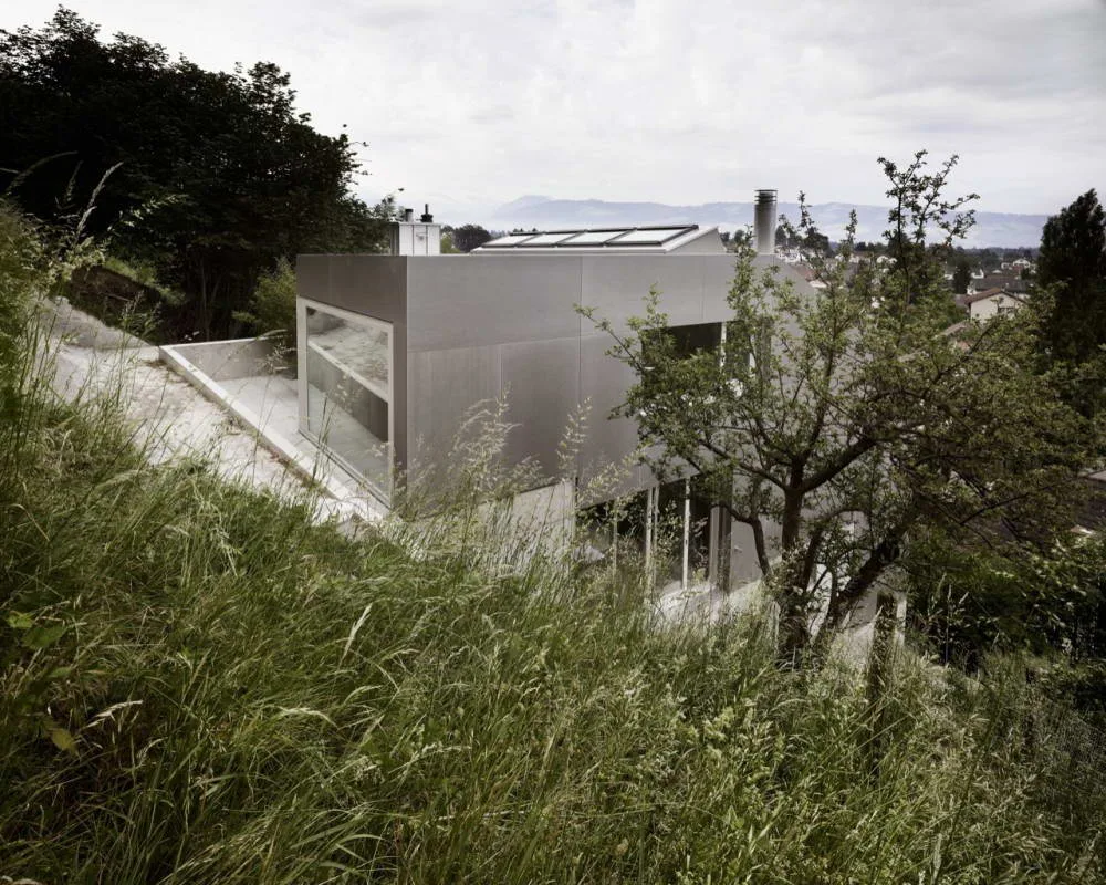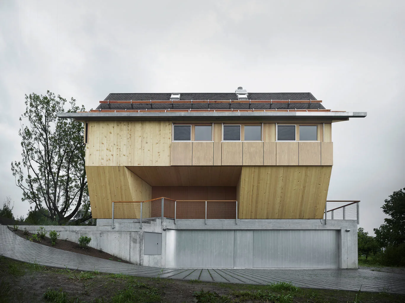 Два этажа плоскости расположены на склоне в соответствии со сдвигом внутрь, а не один над другим. Одноэтажный дом следует ступенчатому подъему, каждый уровень имеет прямой выход во двор на земле. Нижняя часть крыши представляет собой террасу. Широкие и неглубокие выступы дома органично вписываются в ландшафт. Направление к дому - солнечная терраса, которая открывает жилые помещения дома вплоть до верхней части сада.