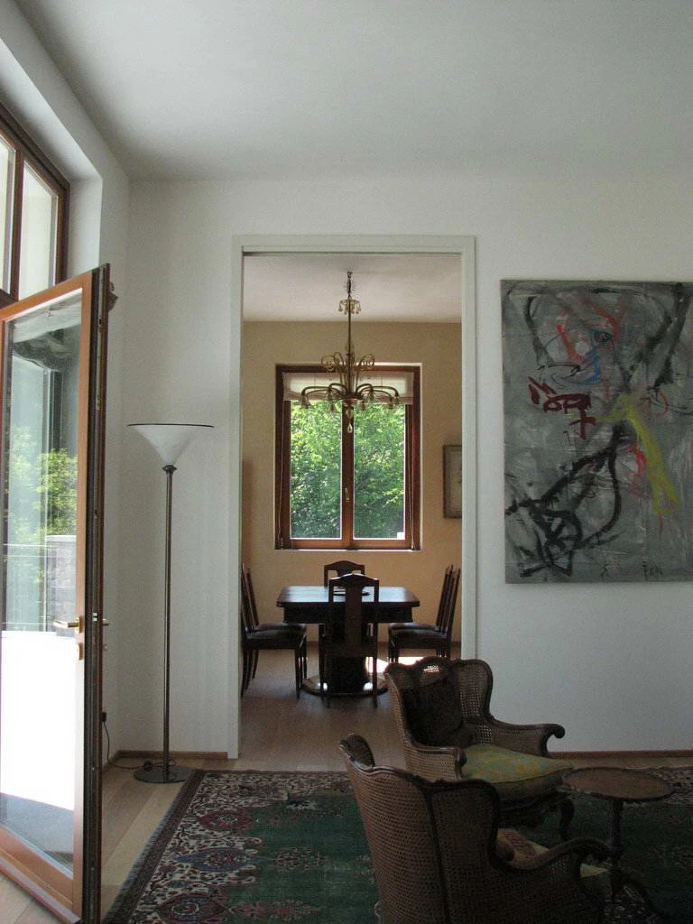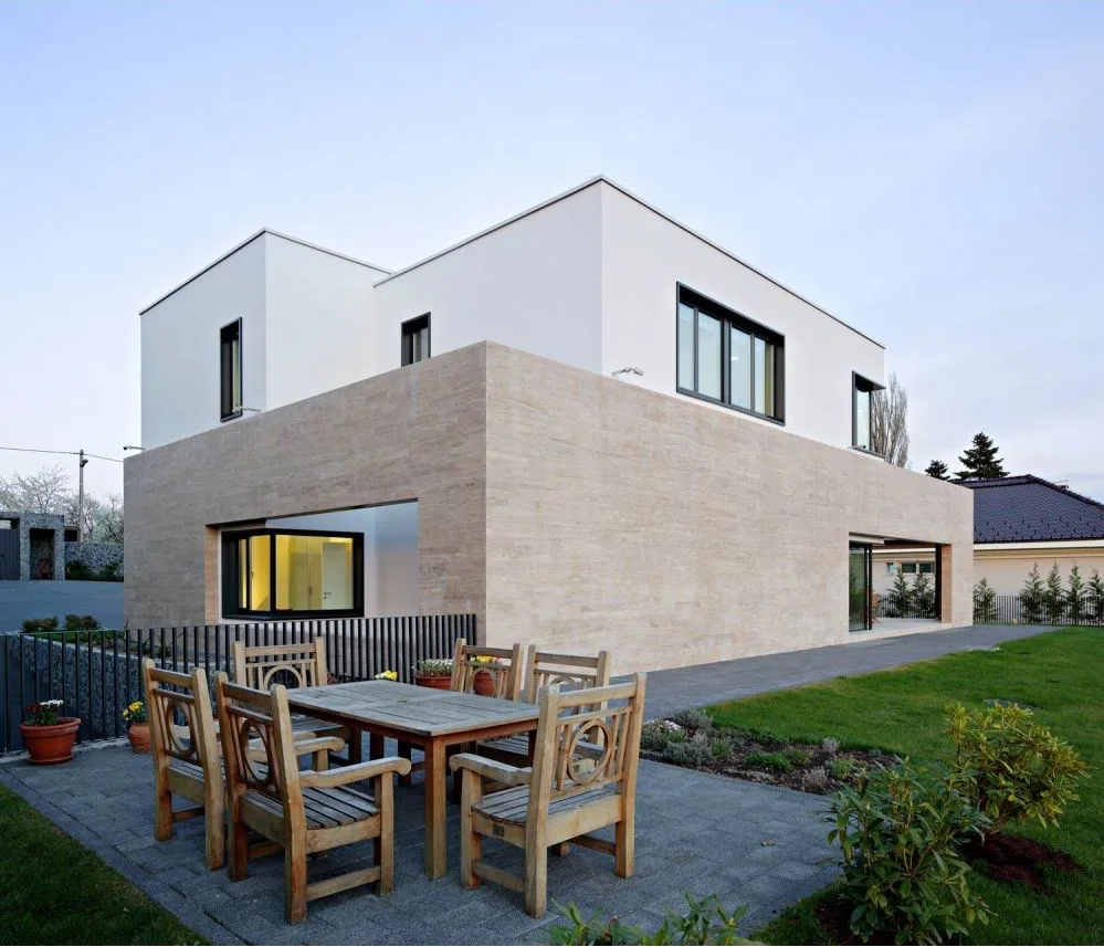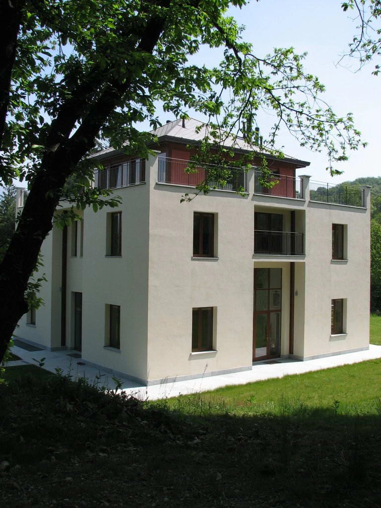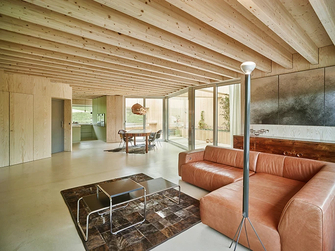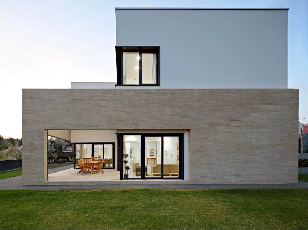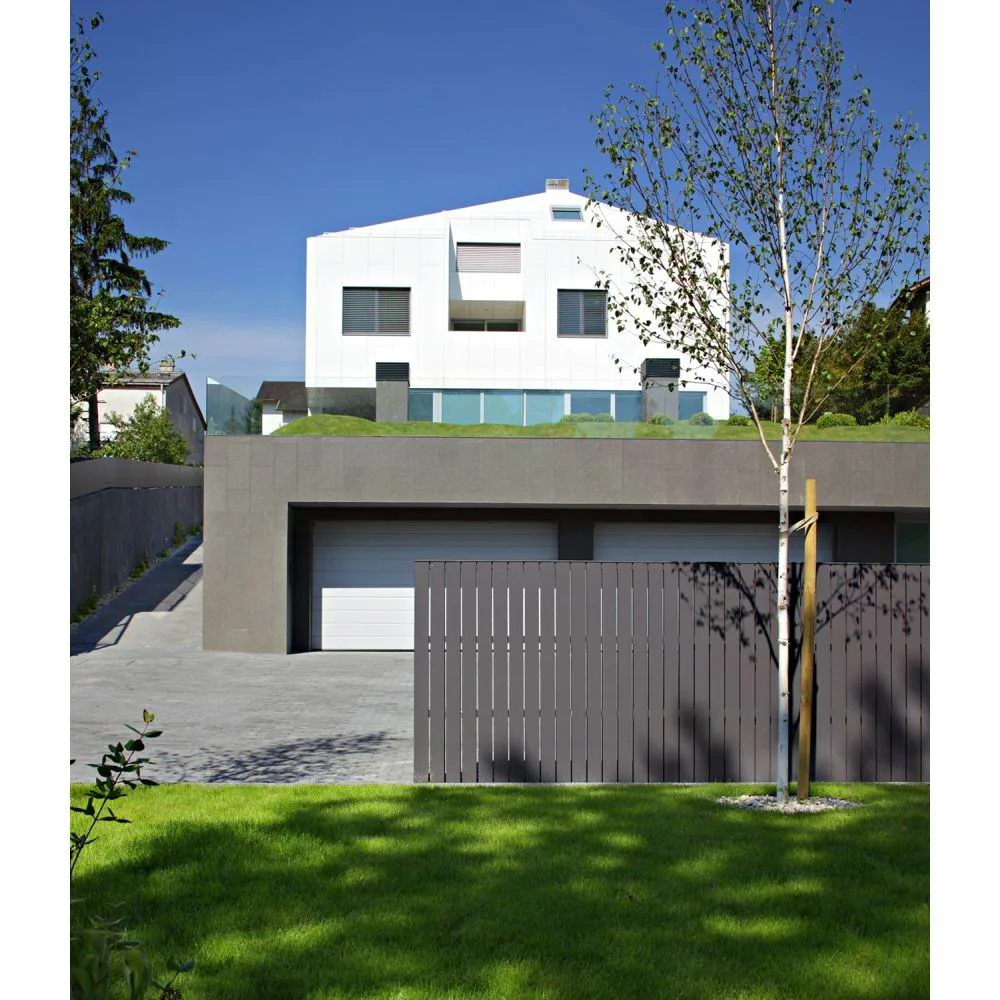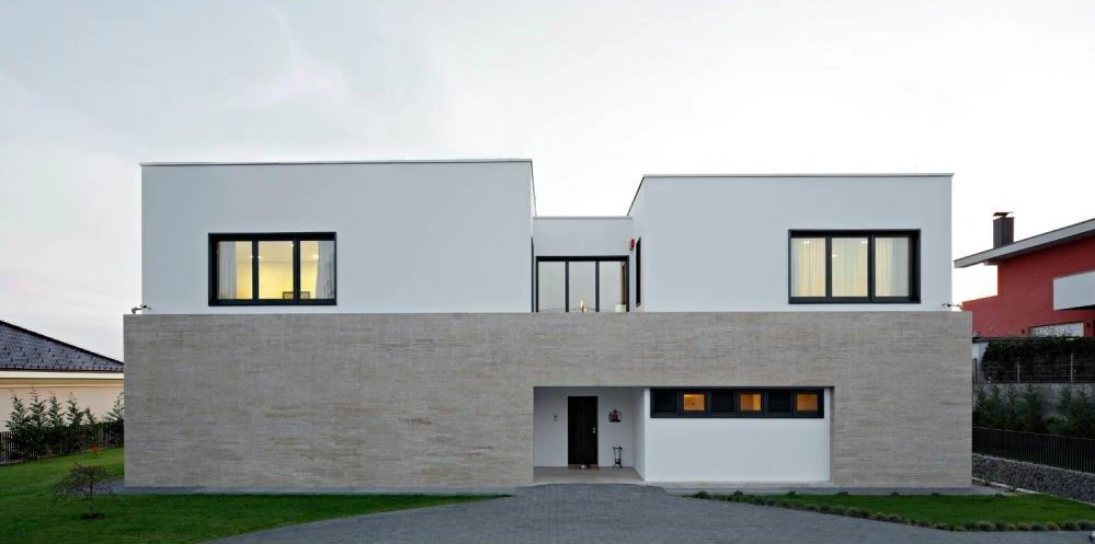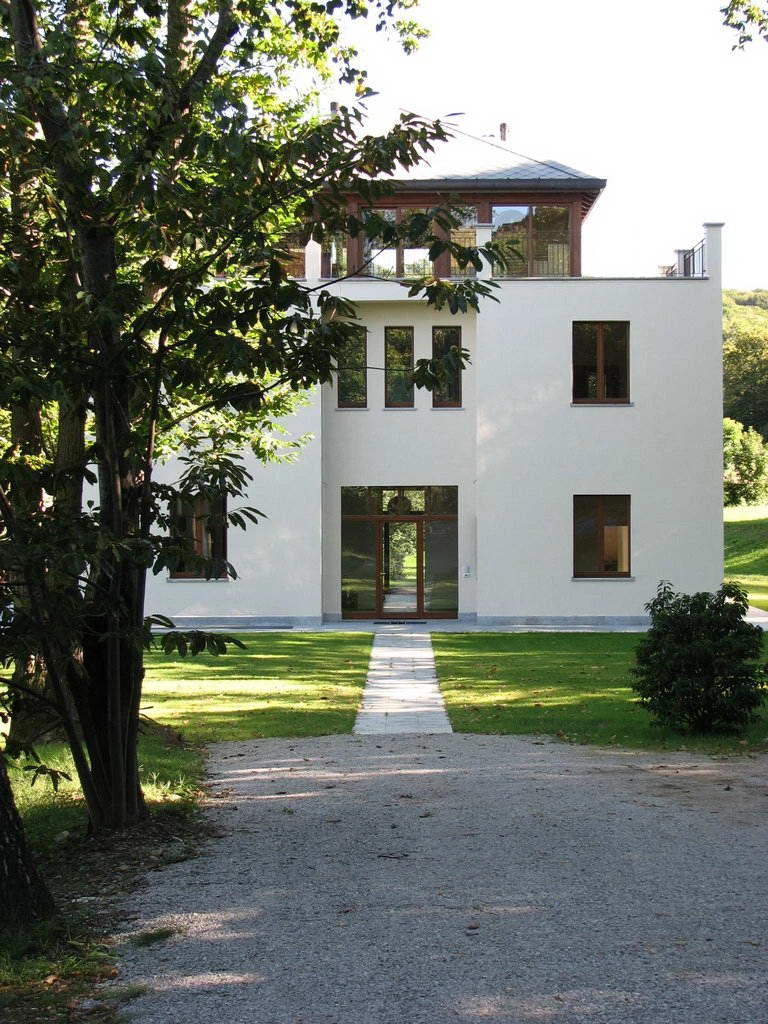 Два этажа плоскости расположены на склоне в соответствии со сдвигом внутрь, а не один над другим. Одноэтажный дом следует ступенчатому подъему, каждый уровень имеет прямой выход во двор на земле. Нижняя часть крыши представляет собой террасу. Широкие и неглубокие выступы дома органично вписываются в ландшафт. Направление к дому - солнечная терраса, которая открывает жилые помещения дома вплоть до верхней части сада.