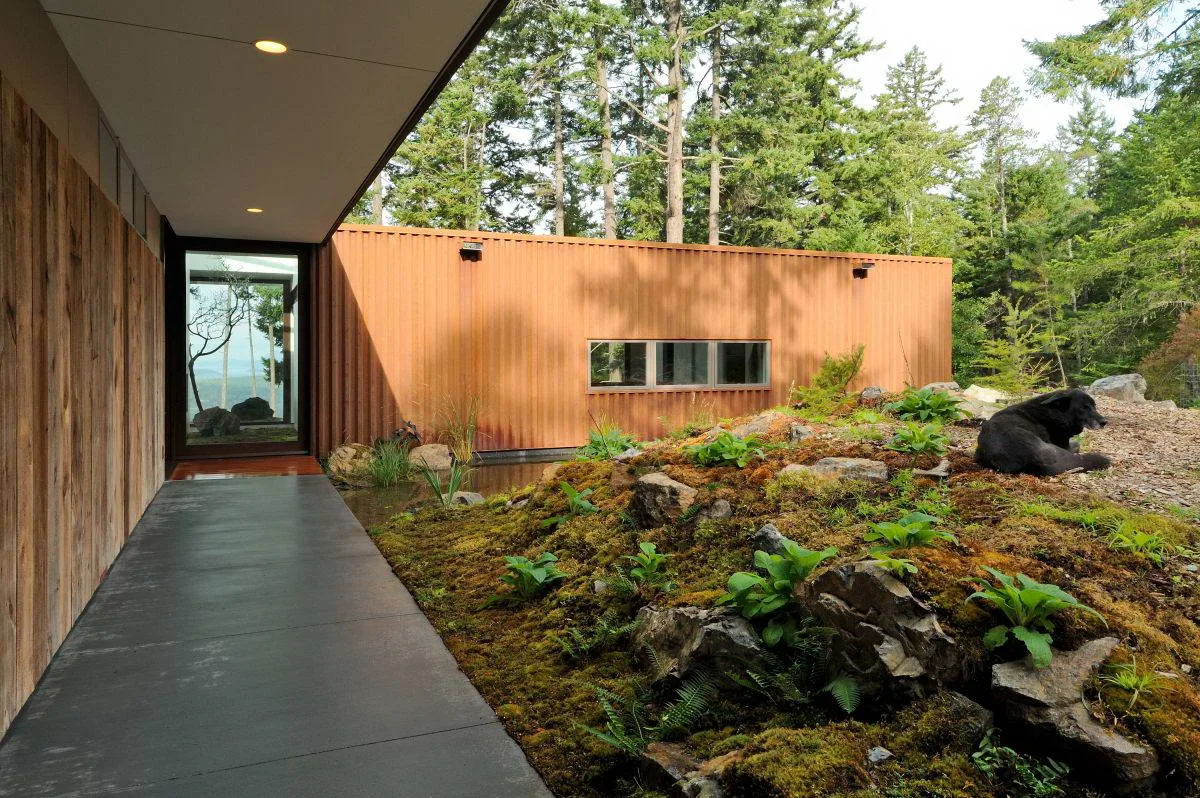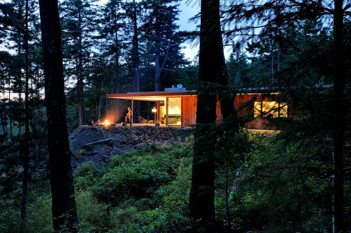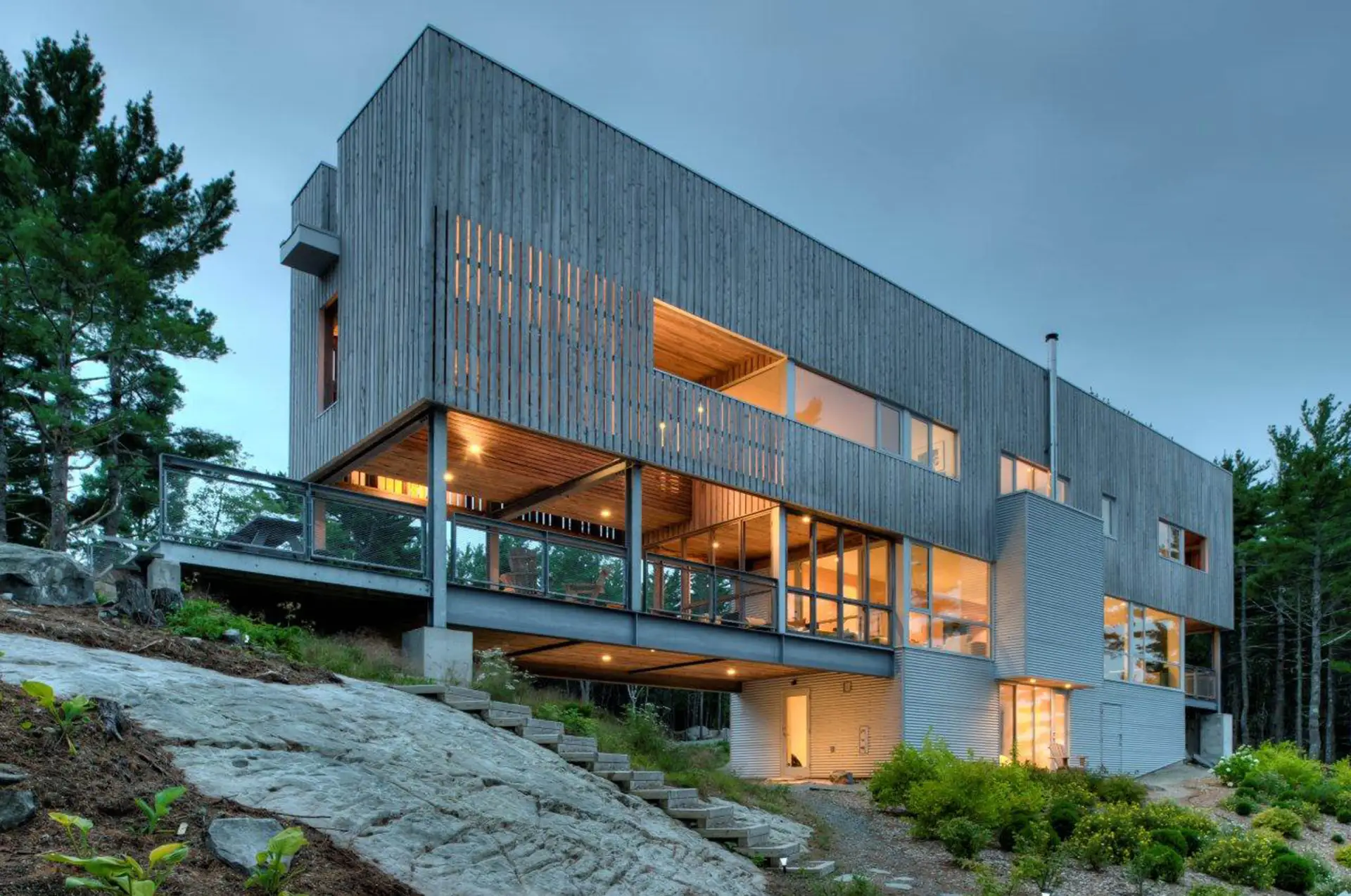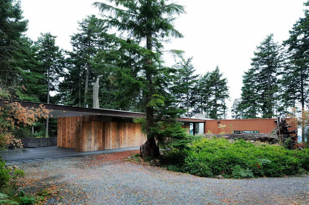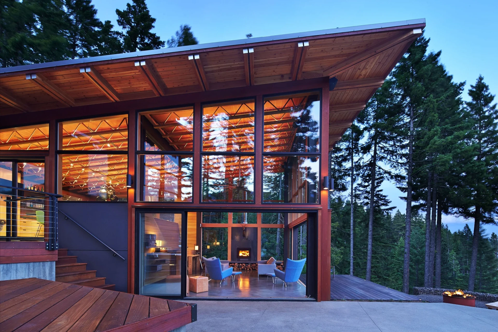 Наружные материалы, в том числе прозрачный кедр и черный металл, уложены слоями, повторяющими текстуру близлежащих лесов. Внутри продуманное освещение, виды из окон и система циркуляции воздуха создают спокойную атмосферу современного дома.