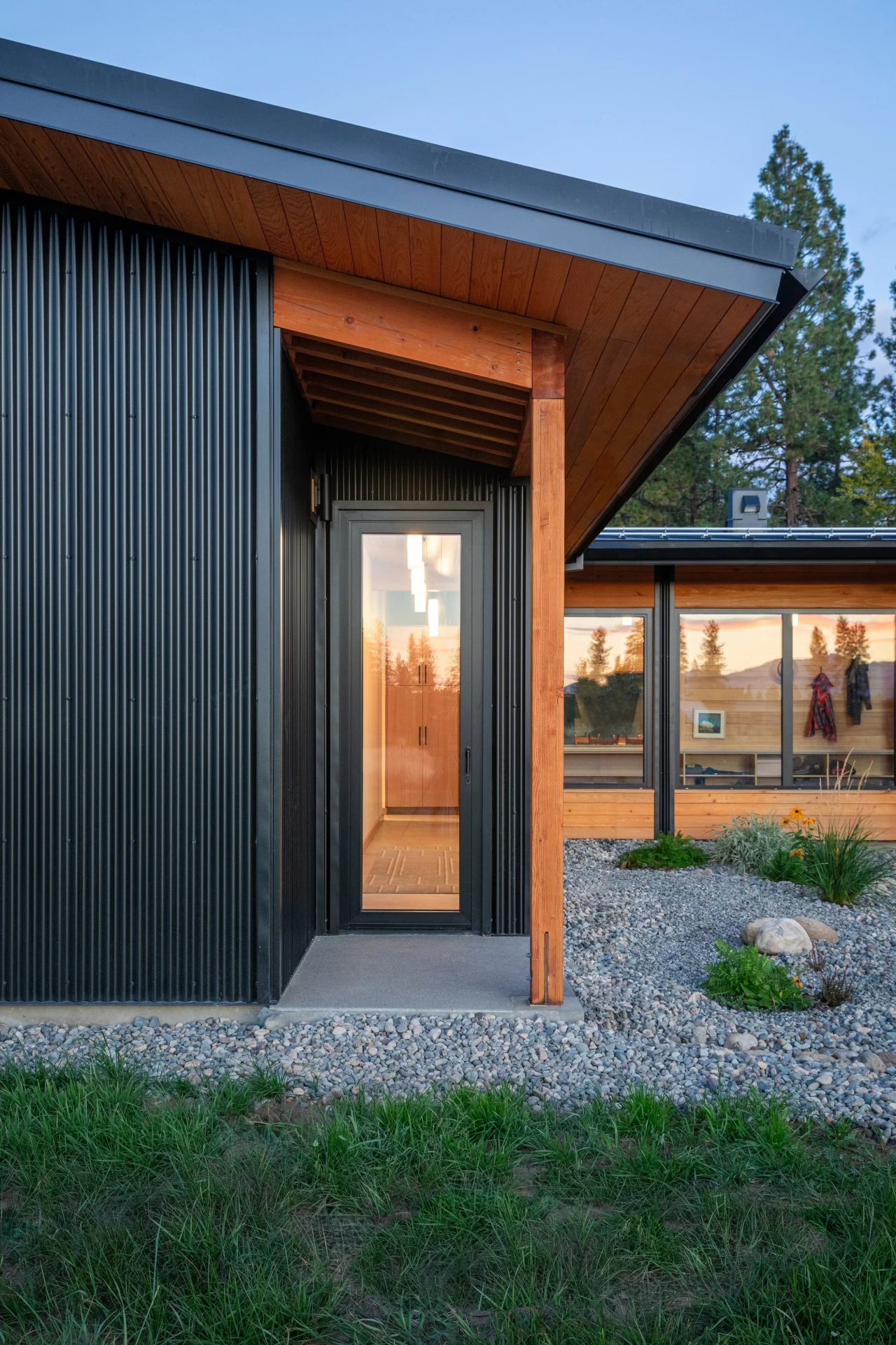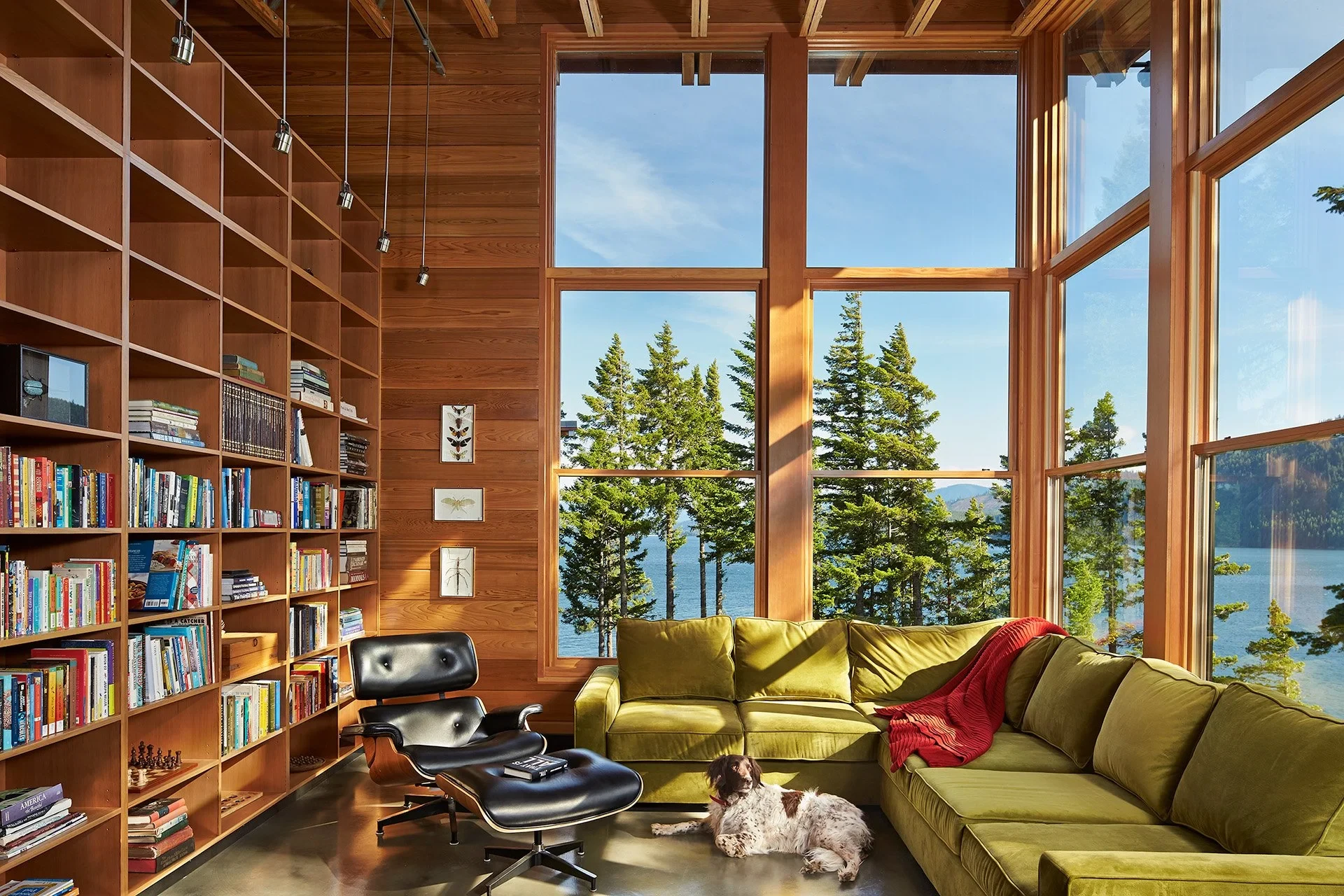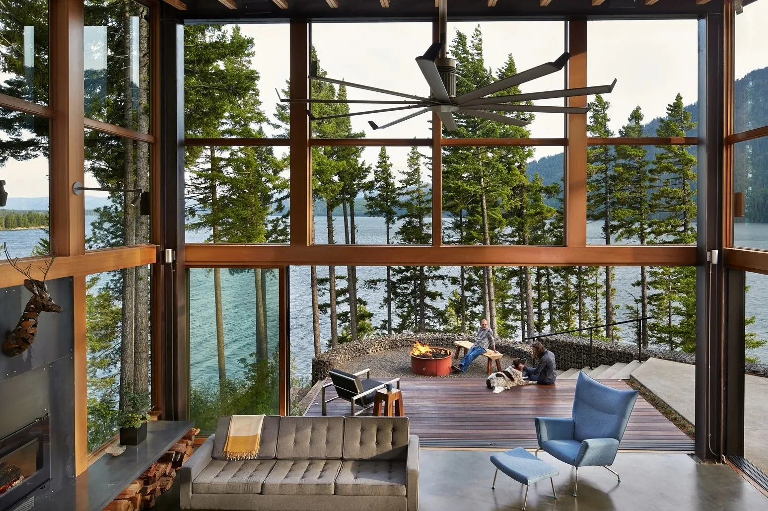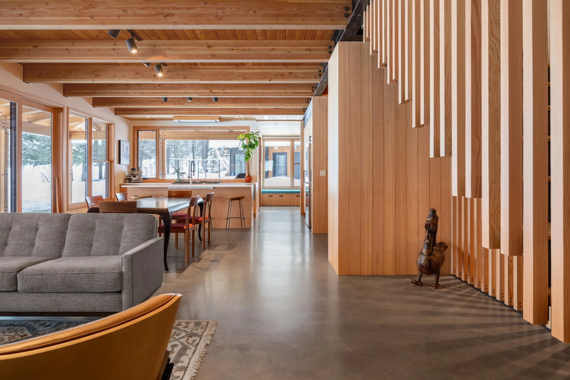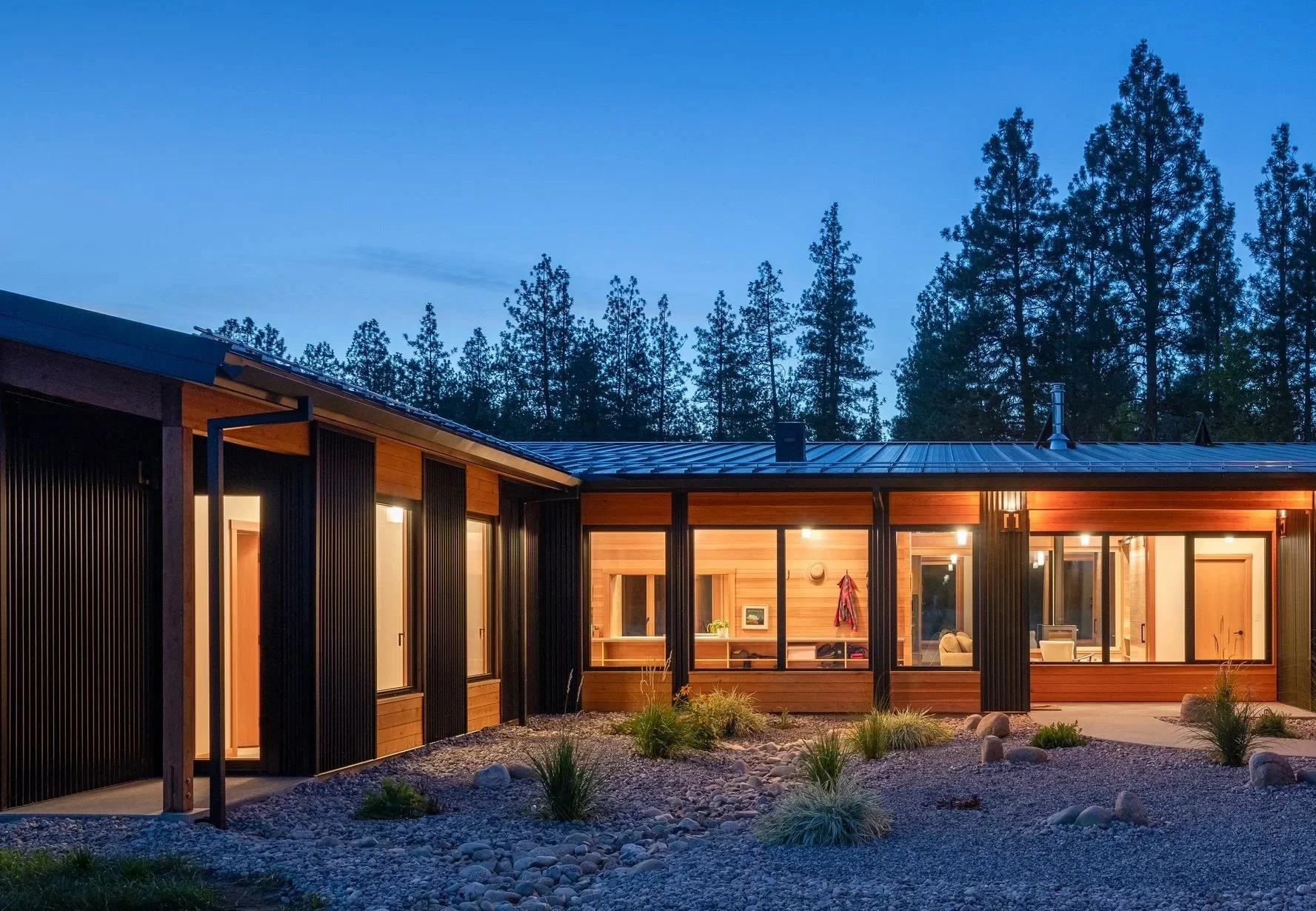 Наружные материалы, в том числе прозрачный кедр и черный металл, уложены слоями, повторяющими текстуру близлежащих лесов. Внутри продуманное освещение, виды из окон и система циркуляции воздуха создают спокойную атмосферу современного дома.
