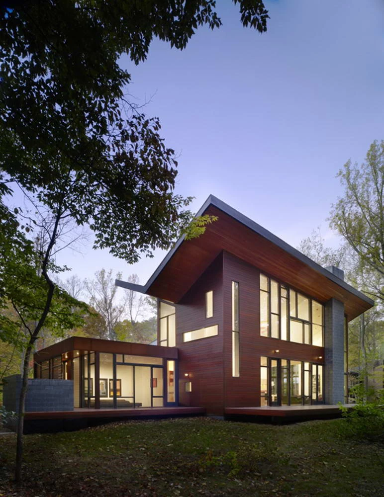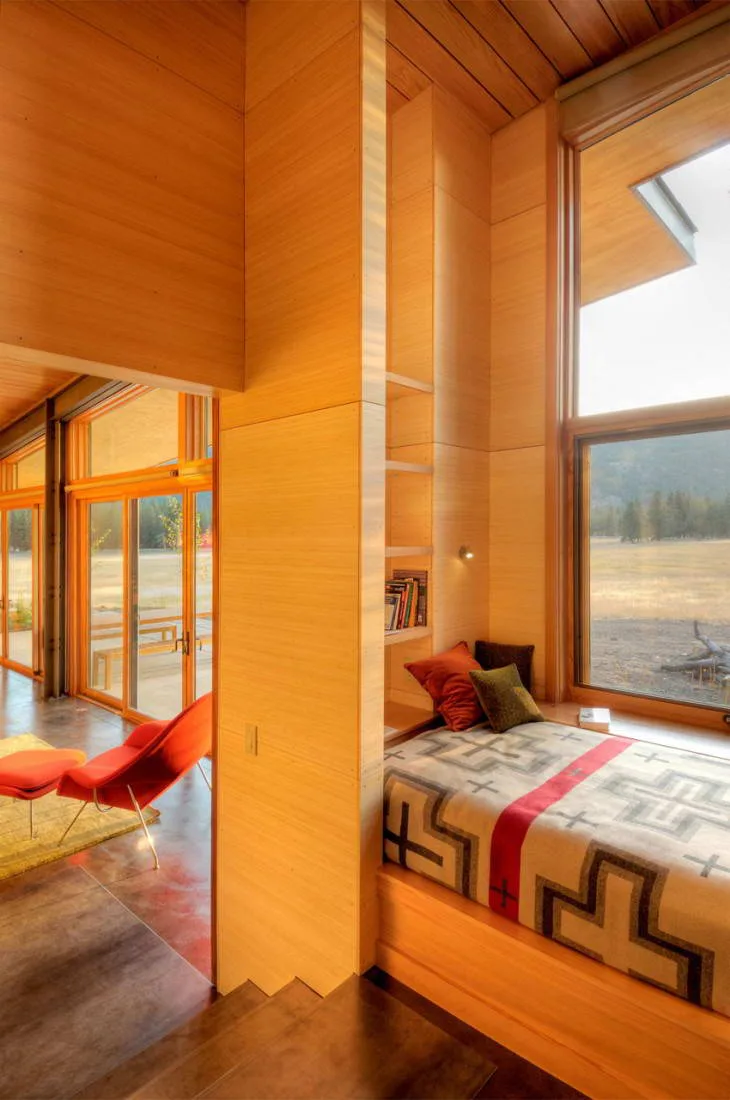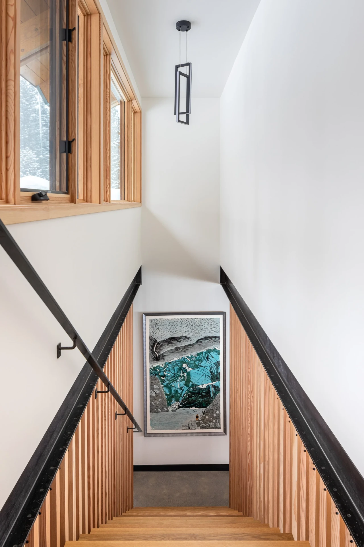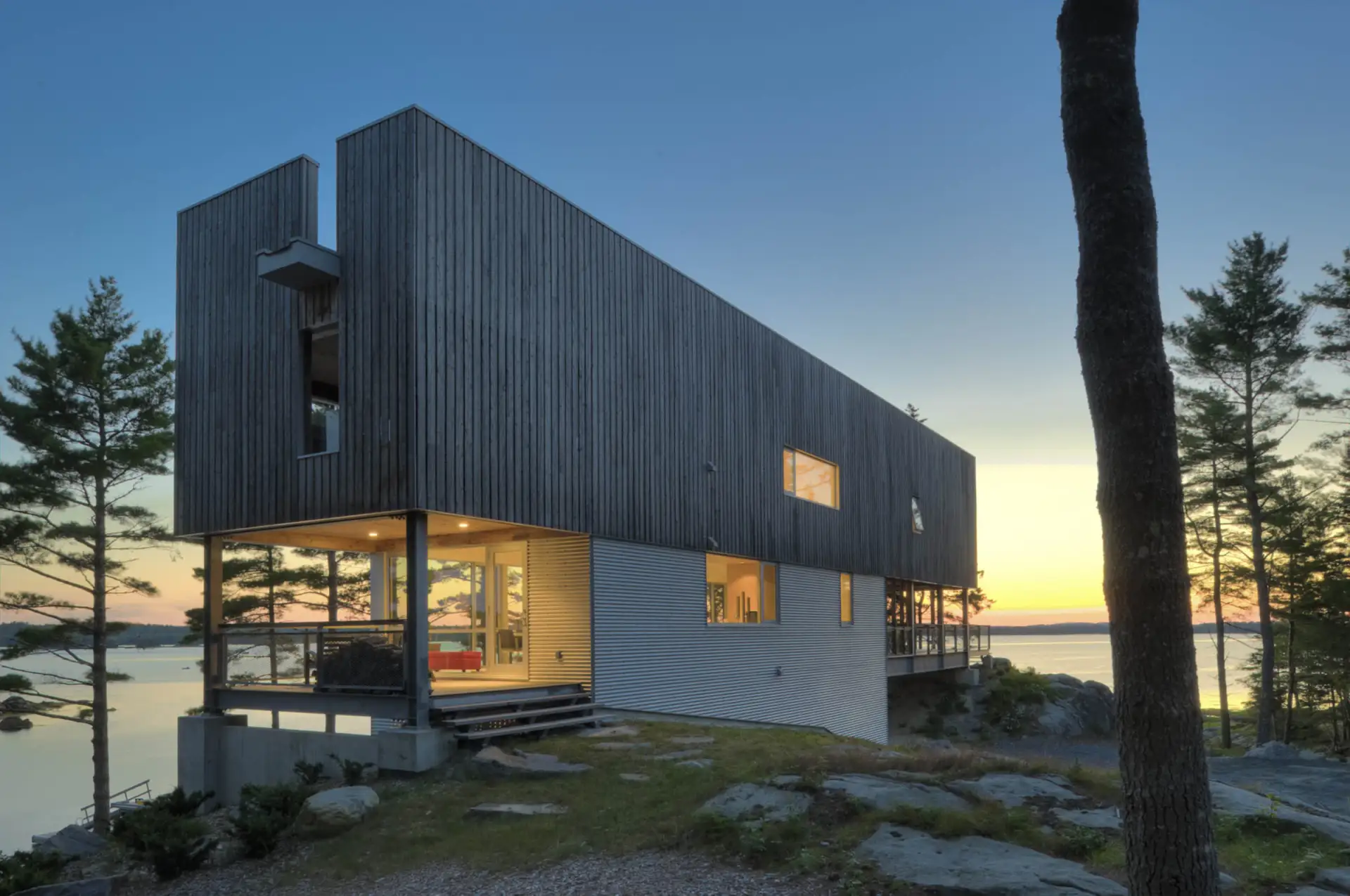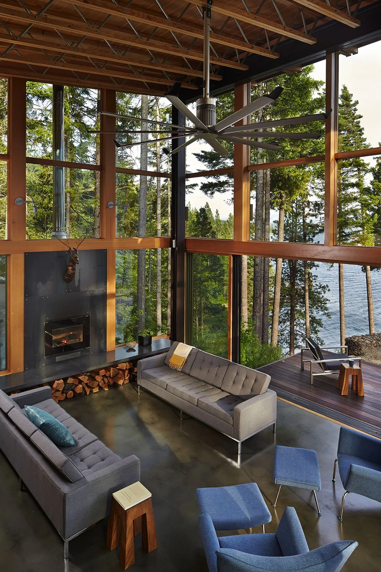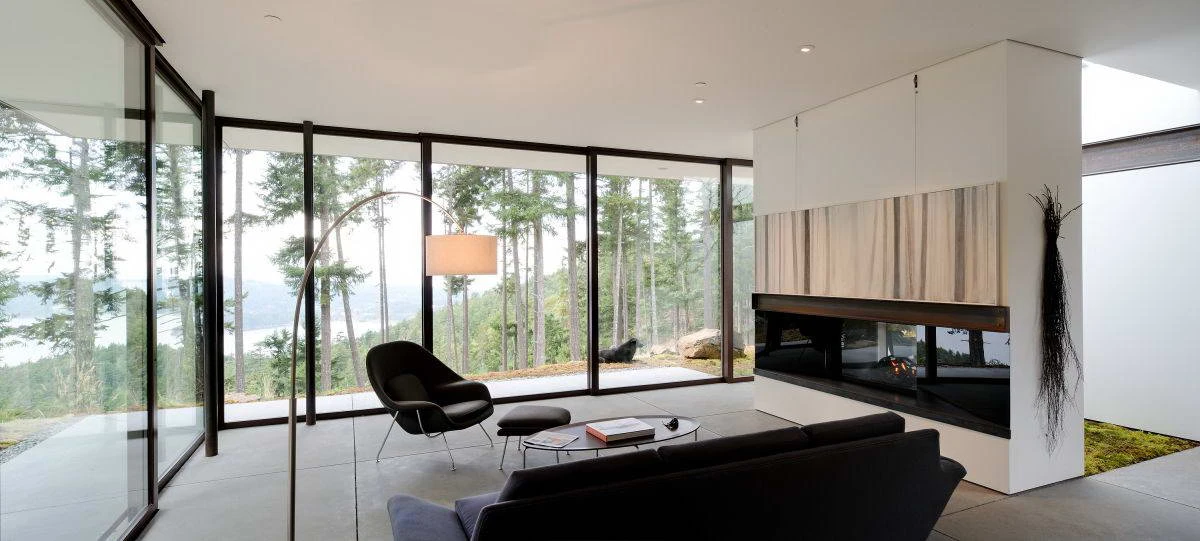 Наружные материалы, в том числе прозрачный кедр и черный металл, уложены слоями, повторяющими текстуру близлежащих лесов. Внутри продуманное освещение, виды из окон и система циркуляции воздуха создают спокойную атмосферу современного дома.