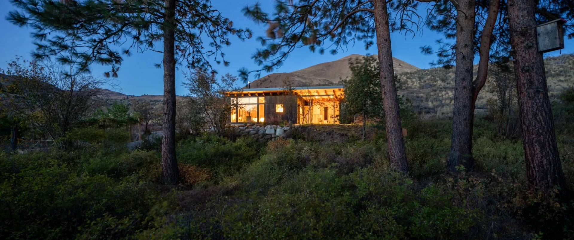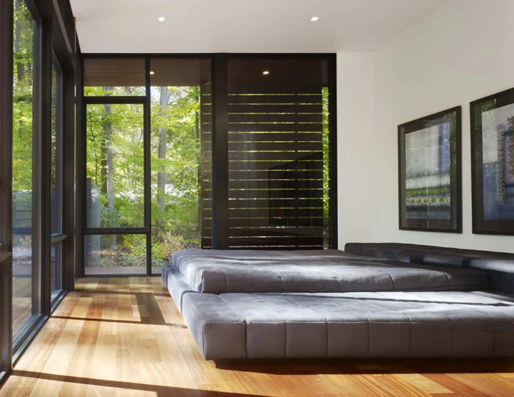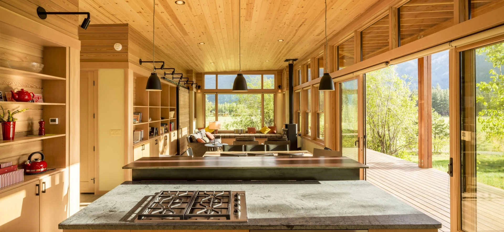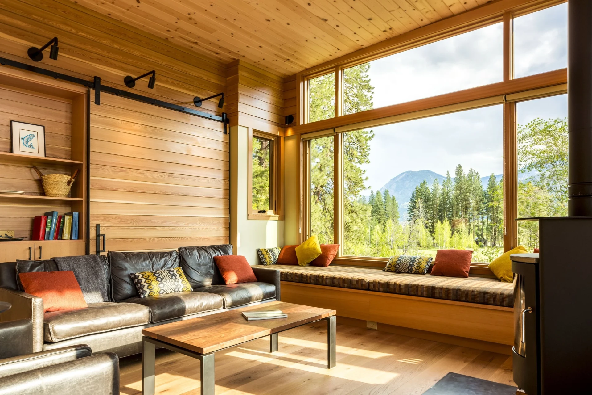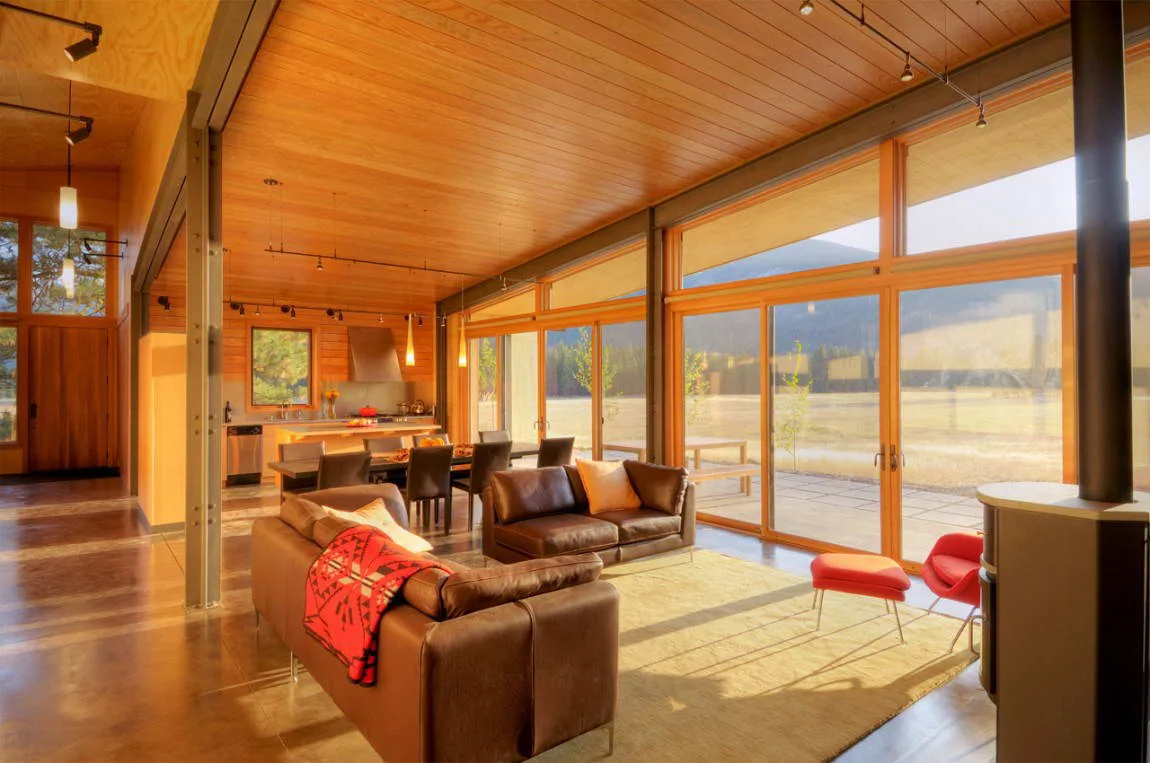 Наружные материалы, в том числе прозрачный кедр и черный металл, уложены слоями, повторяющими текстуру близлежащих лесов. Внутри продуманное освещение, виды из окон и система циркуляции воздуха создают спокойную атмосферу современного дома.