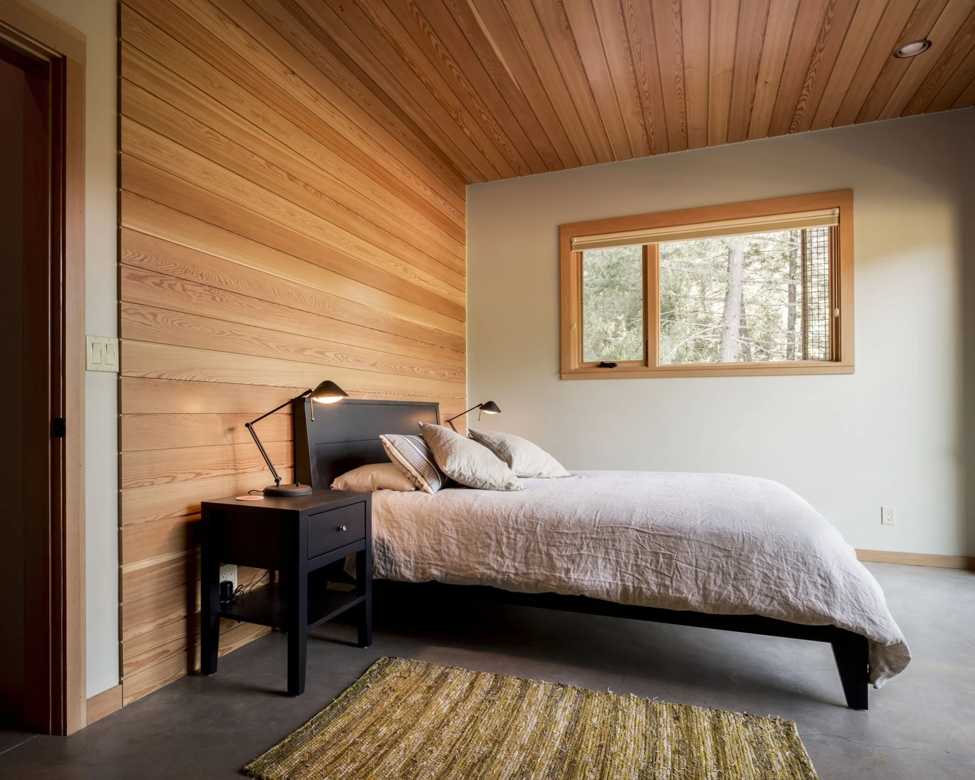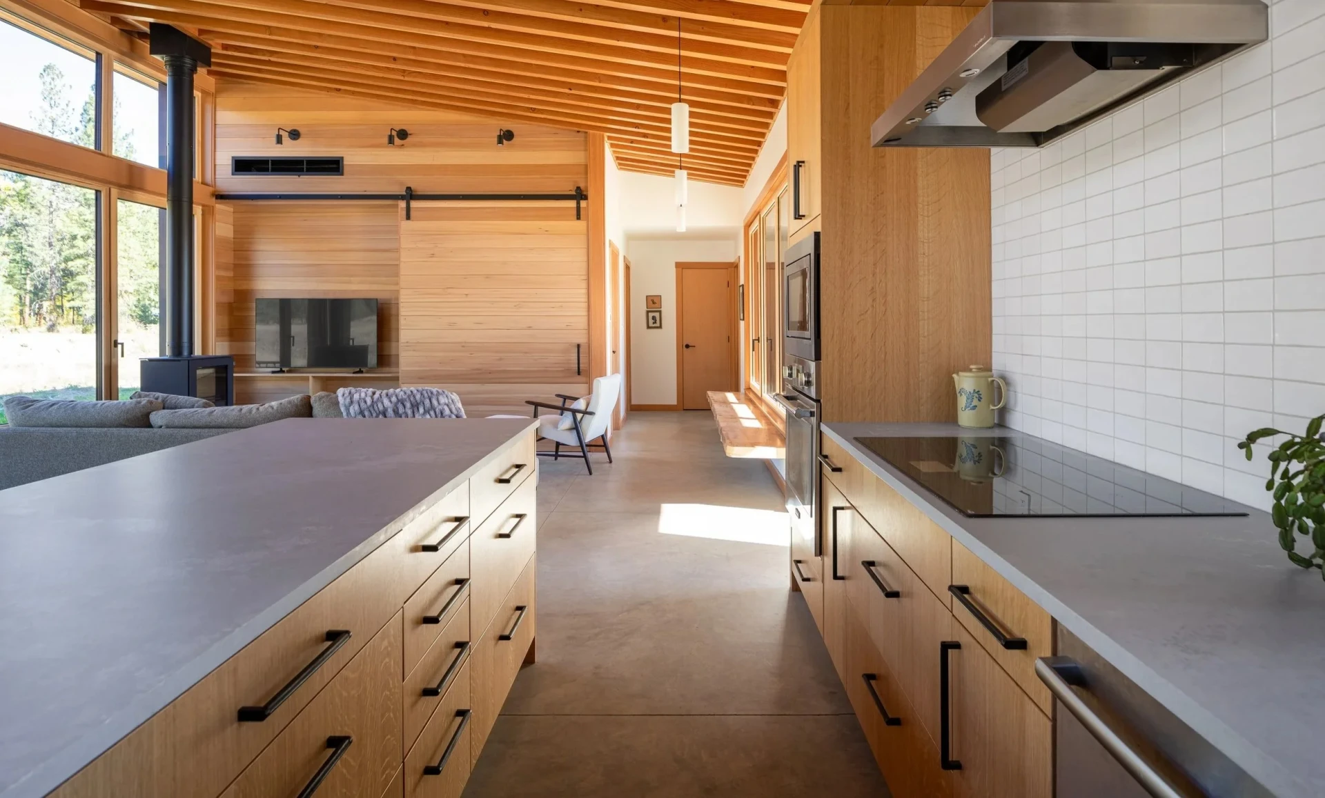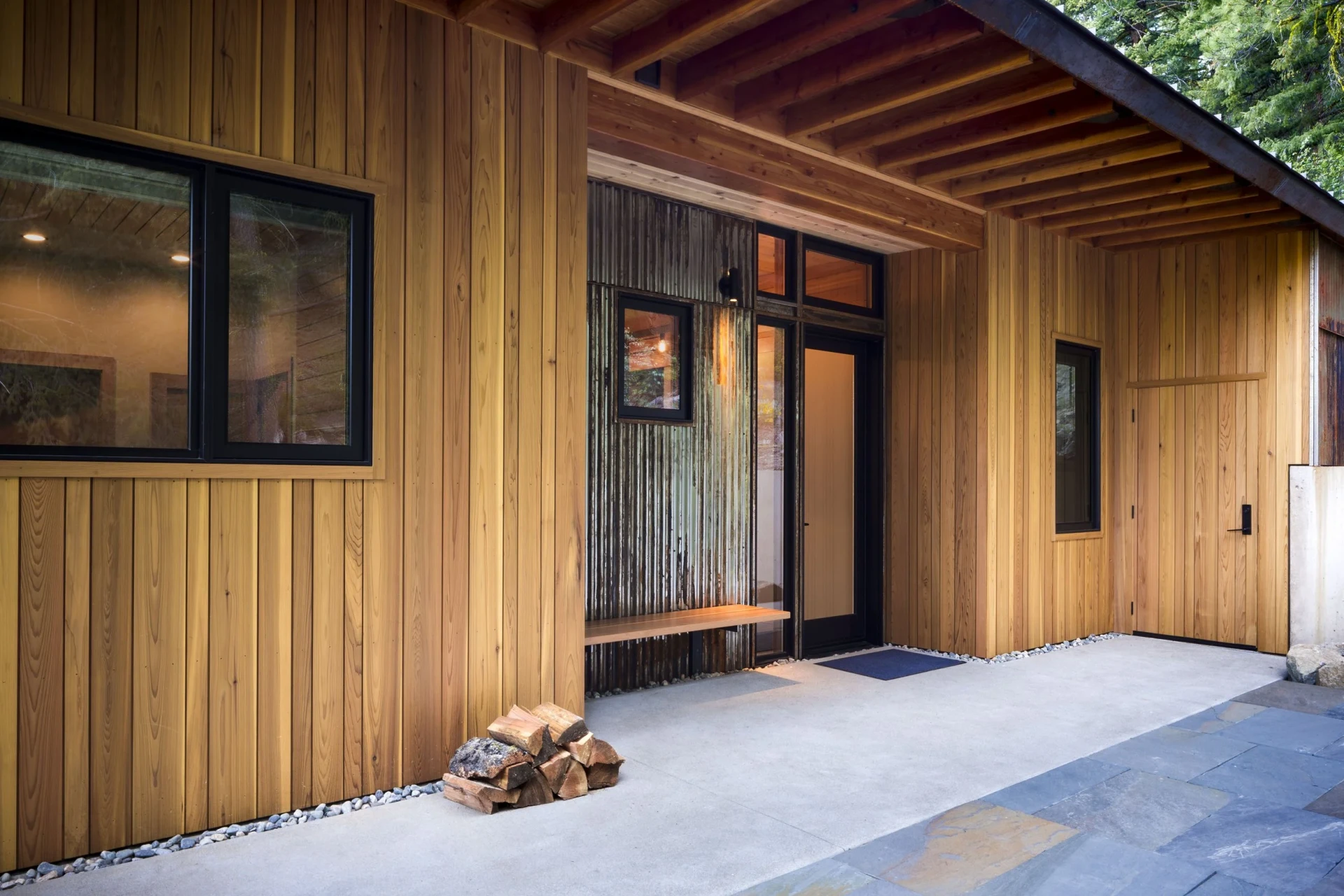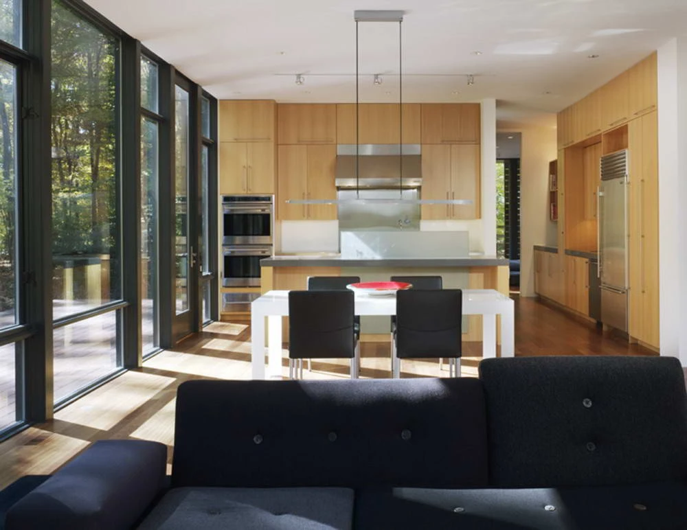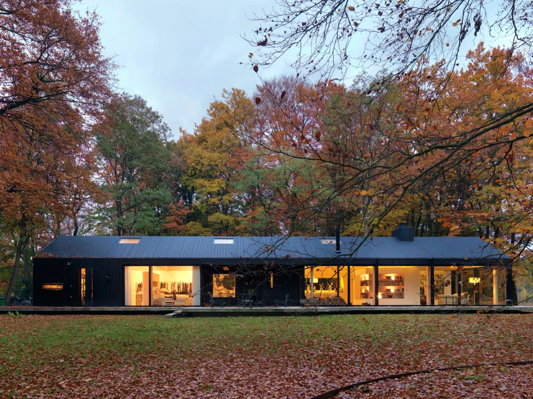 Наружные материалы, в том числе прозрачный кедр и черный металл, уложены слоями, повторяющими текстуру близлежащих лесов. Внутри продуманное освещение, виды из окон и система циркуляции воздуха создают спокойную атмосферу современного дома.