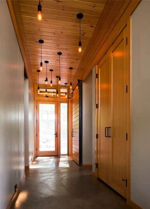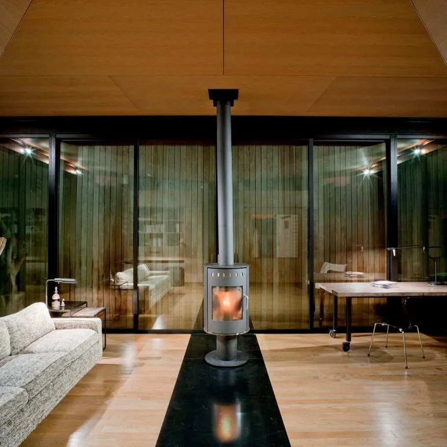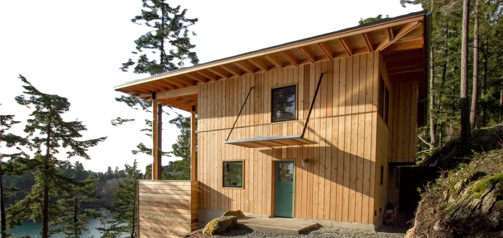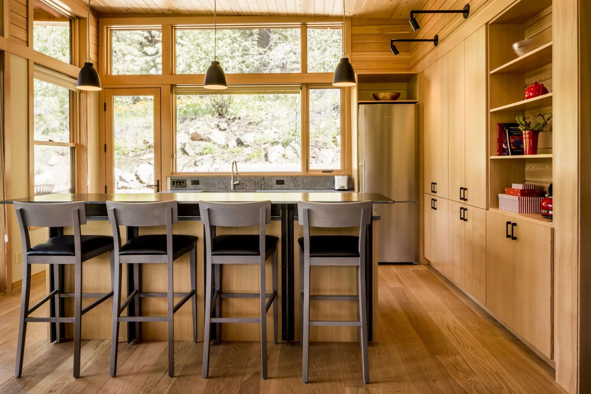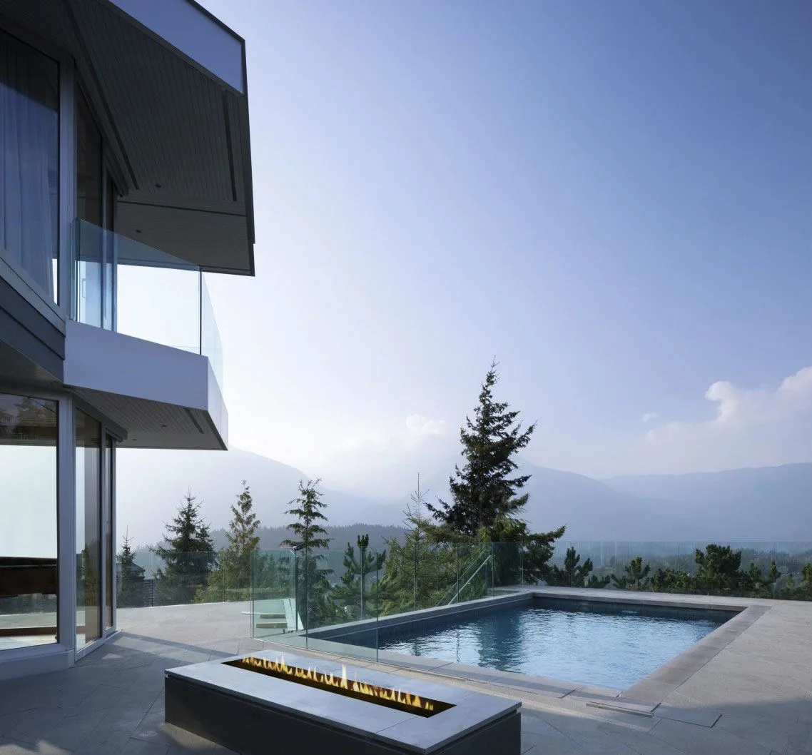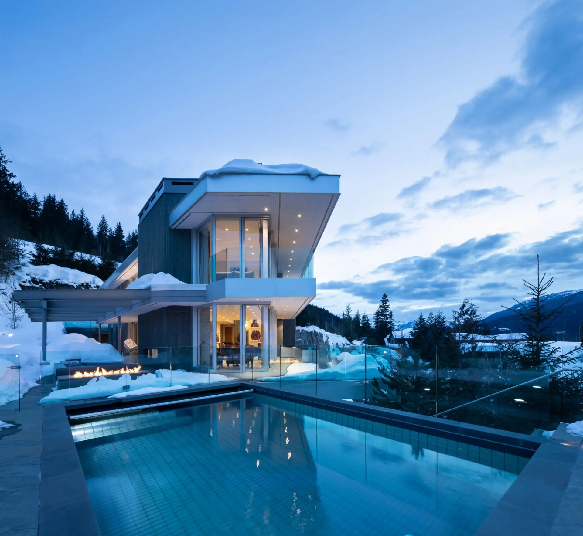 Наружные материалы, в том числе прозрачный кедр и черный металл, уложены слоями, повторяющими текстуру близлежащих лесов. Внутри продуманное освещение, виды из окон и система циркуляции воздуха создают спокойную атмосферу современного дома.