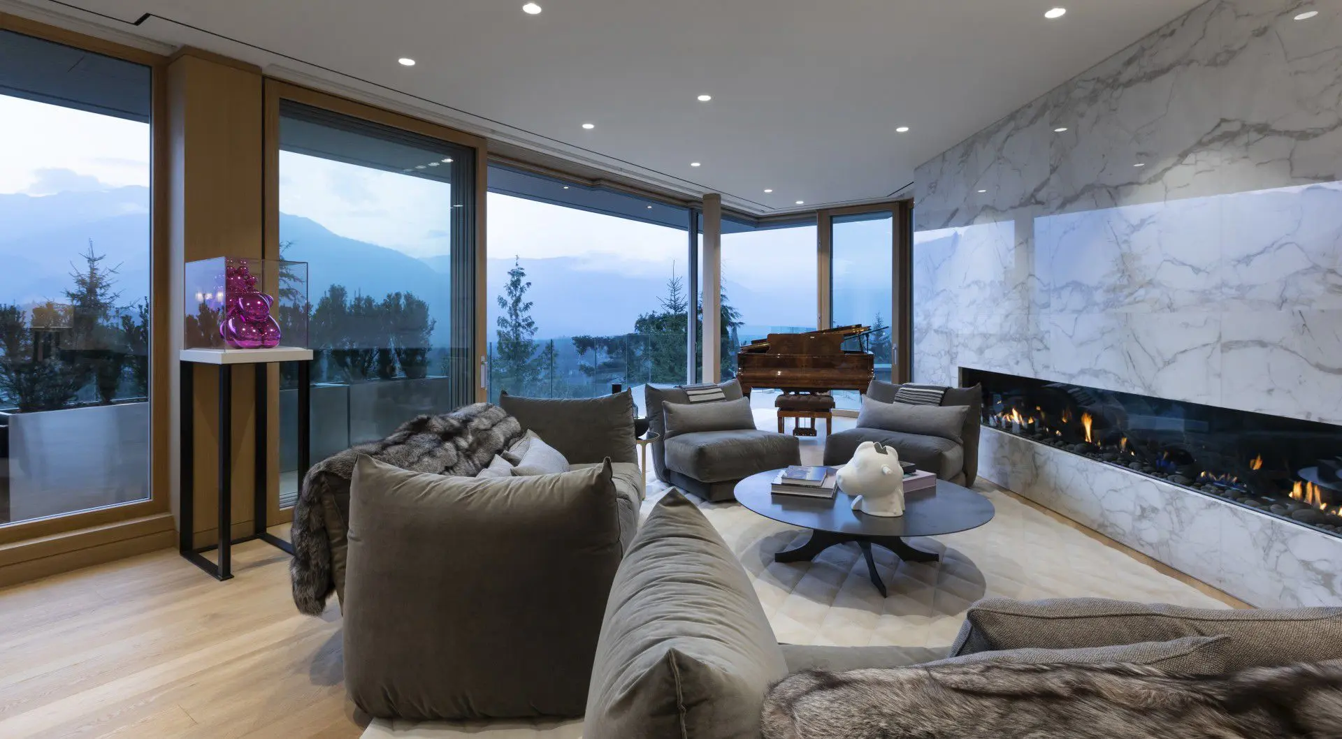 Комплекс состоит из трех частей: жилой, спальной и рекреационной зон, каждая из которых обращена к горам и озеру.