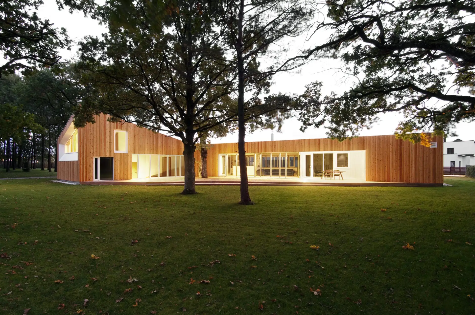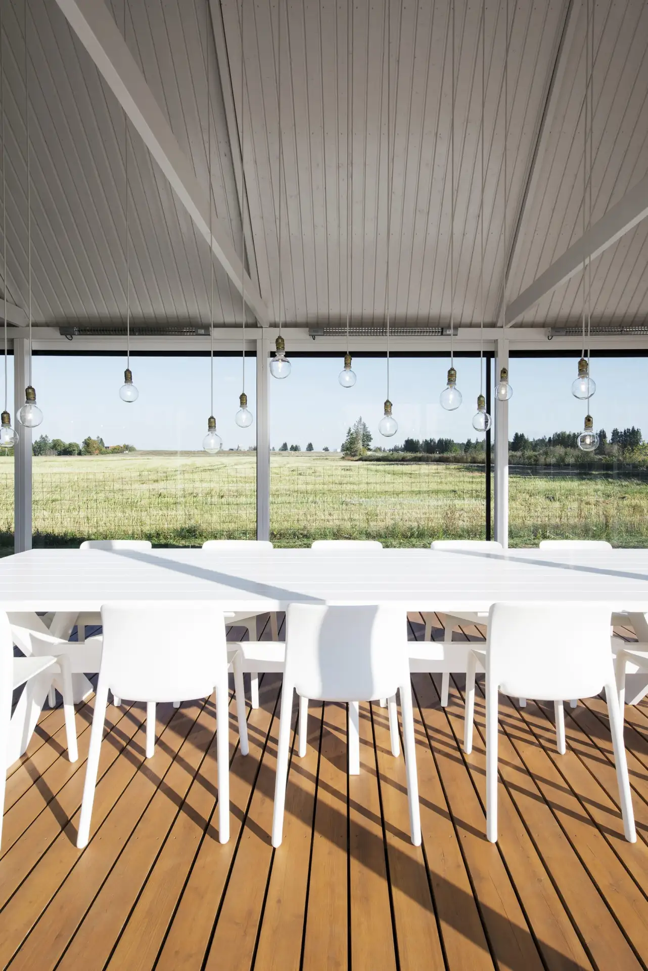 Благодаря многоугольной форме в плане объем здания с помощью простых средств подчеркивает внешние связи. Главный вход в кафе и внешний двор для летних посиделок выделены вогнутым фасадом и ориентацией на озеро.